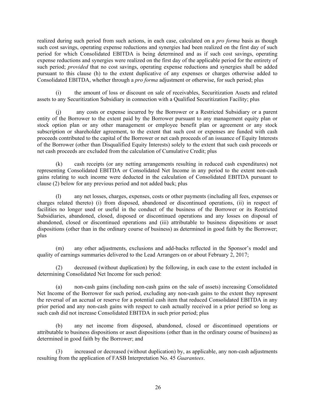 realized during such period from such actions, in each case, calculated on a pro forma basis as thoughsuch cost savings, operating expense reductions and synergies had been realized on the first day of suchperiod for which Consolidated EBITDA is being determined and as if such cost savings, operatingexpense reductions and synergies were realized on the first day of the applicable period for the entirety ofsuch period; provided that no cost savings, operating expense reductions and synergies shall be addedpursuant to this clause (h) to the extent duplicative of any expenses or charges otherwise added toConsolidated EBITDA, whether through a pro forma adjustment or otherwise, for such period; plus(i) the amount of loss or discount on sale of receivables, Securitization Assets and relatedassets to any Securitization Subsidiary in connection with a Qualified Securitization Facility; plus(j) any costs or expense incurred by the Borrower or a Restricted Subsidiary or a parententity of the Borrower to the extent paid by the Borrower pursuant to any management equity plan orstock option plan or any other management or employee benefit plan or agreement or any stocksubscription or shareholder agreement, to the extent that such cost or expenses are funded with cashproceeds contributed to the capital of the Borrower or net cash proceeds of an issuance of Equity Interestsof the Borrower (other than Disqualified Equity Interests) solely to the extent that such cash proceeds ornet cash proceeds are excluded from the calculation of Cumulative Credit; plus(k) cash receipts (or any netting arrangements resulting in reduced cash expenditures) notrepresenting Consolidated EBITDA or Consolidated Net Income in any period to the extent non-cashgains relating to such income were deducted in the calculation of Consolidated EBITDA pursuant toclause (2) below for any previous period and not added back; plus(l) any net losses, charges, expenses, costs or other payments (including all fees, expenses orcharges related thereto) (i) from disposed, abandoned or discontinued operations, (ii) in respect offacilities no longer used or useful in the conduct of the business of the Borrower or its RestrictedSubsidiaries, abandoned, closed, disposed or discontinued operations and any losses on disposal ofabandoned, closed or discontinued operations and (iii) attributable to business dispositions or assetdispositions (other than in the ordinary course of business) as determined in good faith by the Borrower;plus (m) any other adjustments, exclusions and add-backs reflected in the Sponsor’s model andquality of earnings summaries delivered to the Lead Arrangers on or about February 2, 2017;(2) decreased (without duplication) by the following, in each case to the extent included indetermining Consolidated Net Income for such period:(a) non-cash gains (including non-cash gains on the sale of assets) increasing ConsolidatedNet Income of the Borrower for such period, excluding any non-cash gains to the extent they representthe reversal of an accrual or reserve for a potential cash item that reduced Consolidated EBITDA in anyprior period and any non-cash gains with respect to cash actually received in a prior period so long assuch cash did not increase Consolidated EBITDA in such prior period; plus(b) any net income from disposed, abandoned, closed or discontinued operations orattributable to business dispositions or asset dispositions (other than in the ordinary course of business) asdetermined in good faith by the Borrower; and(3) increased or decreased (without duplication) by, as applicable, any non-cash adjustmentsresulting from the application of FASB Interpretation No. 45 Guarantees.26