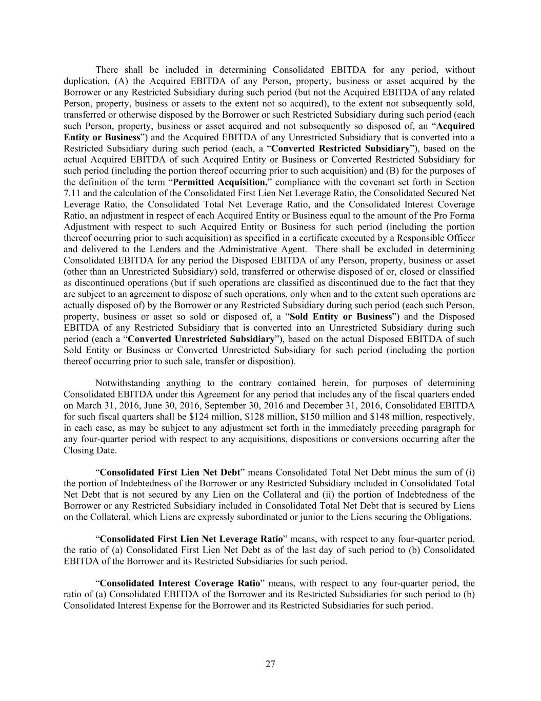 There shall be included in determining Consolidated EBITDA for any period, withoutduplication, (A) the Acquired EBITDA of any Person, property, business or asset acquired by theBorrower or any Restricted Subsidiary during such period (but not the Acquired EBITDA of any relatedPerson, property, business or assets to the extent not so acquired), to the extent not subsequently sold,transferred or otherwise disposed by the Borrower or such Restricted Subsidiary during such period (eachsuch Person, property, business or asset acquired and not subsequently so disposed of, an “AcquiredEntity or Business”) and the Acquired EBITDA of any Unrestricted Subsidiary that is converted into aRestricted Subsidiary during such period (each, a “Converted Restricted Subsidiary”), based on theactual Acquired EBITDA of such Acquired Entity or Business or Converted Restricted Subsidiary forsuch period (including the portion thereof occurring prior to such acquisition) and (B) for the purposes ofthe definition of the term “Permitted Acquisition,” compliance with the covenant set forth in Section7.11 and the calculation of the Consolidated First Lien Net Leverage Ratio, the Consolidated Secured NetLeverage Ratio, the Consolidated Total Net Leverage Ratio, and the Consolidated Interest CoverageRatio, an adjustment in respect of each Acquired Entity or Business equal to the amount of the Pro FormaAdjustment with respect to such Acquired Entity or Business for such period (including the portionthereof occurring prior to such acquisition) as specified in a certificate executed by a Responsible Officerand delivered to the Lenders and the Administrative Agent. There shall be excluded in determiningConsolidated EBITDA for any period the Disposed EBITDA of any Person, property, business or asset(other than an Unrestricted Subsidiary) sold, transferred or otherwise disposed of or, closed or classifiedas discontinued operations (but if such operations are classified as discontinued due to the fact that theyare subject to an agreement to dispose of such operations, only when and to the extent such operations areactually disposed of) by the Borrower or any Restricted Subsidiary during such period (each such Person,property, business or asset so sold or disposed of, a “Sold Entity or Business”) and the DisposedEBITDA of any Restricted Subsidiary that is converted into an Unrestricted Subsidiary during suchperiod (each a “Converted Unrestricted Subsidiary”), based on the actual Disposed EBITDA of suchSold Entity or Business or Converted Unrestricted Subsidiary for such period (including the portionthereof occurring prior to such sale, transfer or disposition).Notwithstanding anything to the contrary contained herein, for purposes of determiningConsolidated EBITDA under this Agreement for any period that includes any of the fiscal quarters endedon March 31, 2016, June 30, 2016, September 30, 2016 and December 31, 2016, Consolidated EBITDAfor such fiscal quarters shall be $124 million, $128 million, $150 million and $148 million, respectively,in each case, as may be subject to any adjustment set forth in the immediately preceding paragraph forany four-quarter period with respect to any acquisitions, dispositions or conversions occurring after theClosing Date.“Consolidated First Lien Net Debt” means Consolidated Total Net Debt minus the sum of (i)the portion of Indebtedness of the Borrower or any Restricted Subsidiary included in Consolidated TotalNet Debt that is not secured by any Lien on the Collateral and (ii) the portion of Indebtedness of theBorrower or any Restricted Subsidiary included in Consolidated Total Net Debt that is secured by Lienson the Collateral, which Liens are expressly subordinated or junior to the Liens securing the Obligations.“Consolidated First Lien Net Leverage Ratio” means, with respect to any four-quarter period,the ratio of (a) Consolidated First Lien Net Debt as of the last day of such period to (b) ConsolidatedEBITDA of the Borrower and its Restricted Subsidiaries for such period.“Consolidated Interest Coverage Ratio” means, with respect to any four-quarter period, theratio of (a) Consolidated EBITDA of the Borrower and its Restricted Subsidiaries for such period to (b)Consolidated Interest Expense for the Borrower and its Restricted Subsidiaries for such period.27
