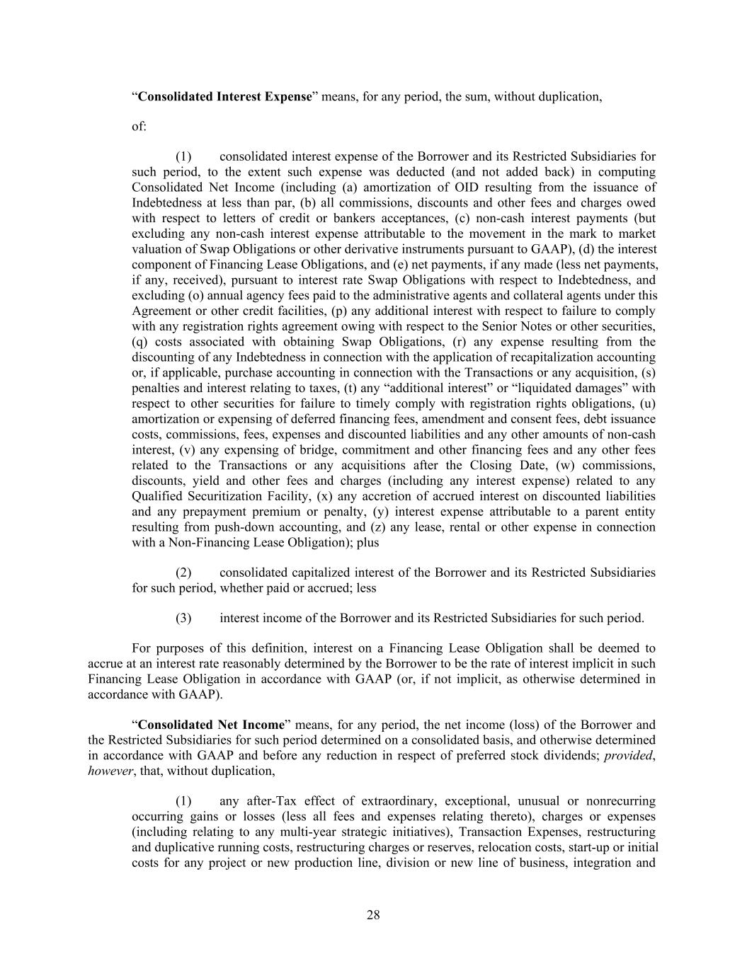 “Consolidated Interest Expense” means, for any period, the sum, without duplication,of: (1) consolidated interest expense of the Borrower and its Restricted Subsidiaries forsuch period, to the extent such expense was deducted (and not added back) in computingConsolidated Net Income (including (a) amortization of OID resulting from the issuance ofIndebtedness at less than par, (b) all commissions, discounts and other fees and charges owedwith respect to letters of credit or bankers acceptances, (c) non-cash interest payments (butexcluding any non-cash interest expense attributable to the movement in the mark to marketvaluation of Swap Obligations or other derivative instruments pursuant to GAAP), (d) the interestcomponent of Financing Lease Obligations, and (e) net payments, if any made (less net payments,if any, received), pursuant to interest rate Swap Obligations with respect to Indebtedness, andexcluding (o) annual agency fees paid to the administrative agents and collateral agents under thisAgreement or other credit facilities, (p) any additional interest with respect to failure to complywith any registration rights agreement owing with respect to the Senior Notes or other securities,(q) costs associated with obtaining Swap Obligations, (r) any expense resulting from thediscounting of any Indebtedness in connection with the application of recapitalization accountingor, if applicable, purchase accounting in connection with the Transactions or any acquisition, (s)penalties and interest relating to taxes, (t) any “additional interest” or “liquidated damages” withrespect to other securities for failure to timely comply with registration rights obligations, (u)amortization or expensing of deferred financing fees, amendment and consent fees, debt issuancecosts, commissions, fees, expenses and discounted liabilities and any other amounts of non-cashinterest, (v) any expensing of bridge, commitment and other financing fees and any other feesrelated to the Transactions or any acquisitions after the Closing Date, (w) commissions,discounts, yield and other fees and charges (including any interest expense) related to anyQualified Securitization Facility, (x) any accretion of accrued interest on discounted liabilitiesand any prepayment premium or penalty, (y) interest expense attributable to a parent entityresulting from push-down accounting, and (z) any lease, rental or other expense in connectionwith a Non-Financing Lease Obligation); plus(2) consolidated capitalized interest of the Borrower and its Restricted Subsidiariesfor such period, whether paid or accrued; less(3) interest income of the Borrower and its Restricted Subsidiaries for such period.For purposes of this definition, interest on a Financing Lease Obligation shall be deemed toaccrue at an interest rate reasonably determined by the Borrower to be the rate of interest implicit in suchFinancing Lease Obligation in accordance with GAAP (or, if not implicit, as otherwise determined inaccordance with GAAP).“Consolidated Net Income” means, for any period, the net income (loss) of the Borrower andthe Restricted Subsidiaries for such period determined on a consolidated basis, and otherwise determinedin accordance with GAAP and before any reduction in respect of preferred stock dividends; provided,however, that, without duplication,(1) any after-Tax effect of extraordinary, exceptional, unusual or nonrecurringoccurring gains or losses (less all fees and expenses relating thereto), charges or expenses(including relating to any multi-year strategic initiatives), Transaction Expenses, restructuringand duplicative running costs, restructuring charges or reserves, relocation costs, start-up or initialcosts for any project or new production line, division or new line of business, integration and28