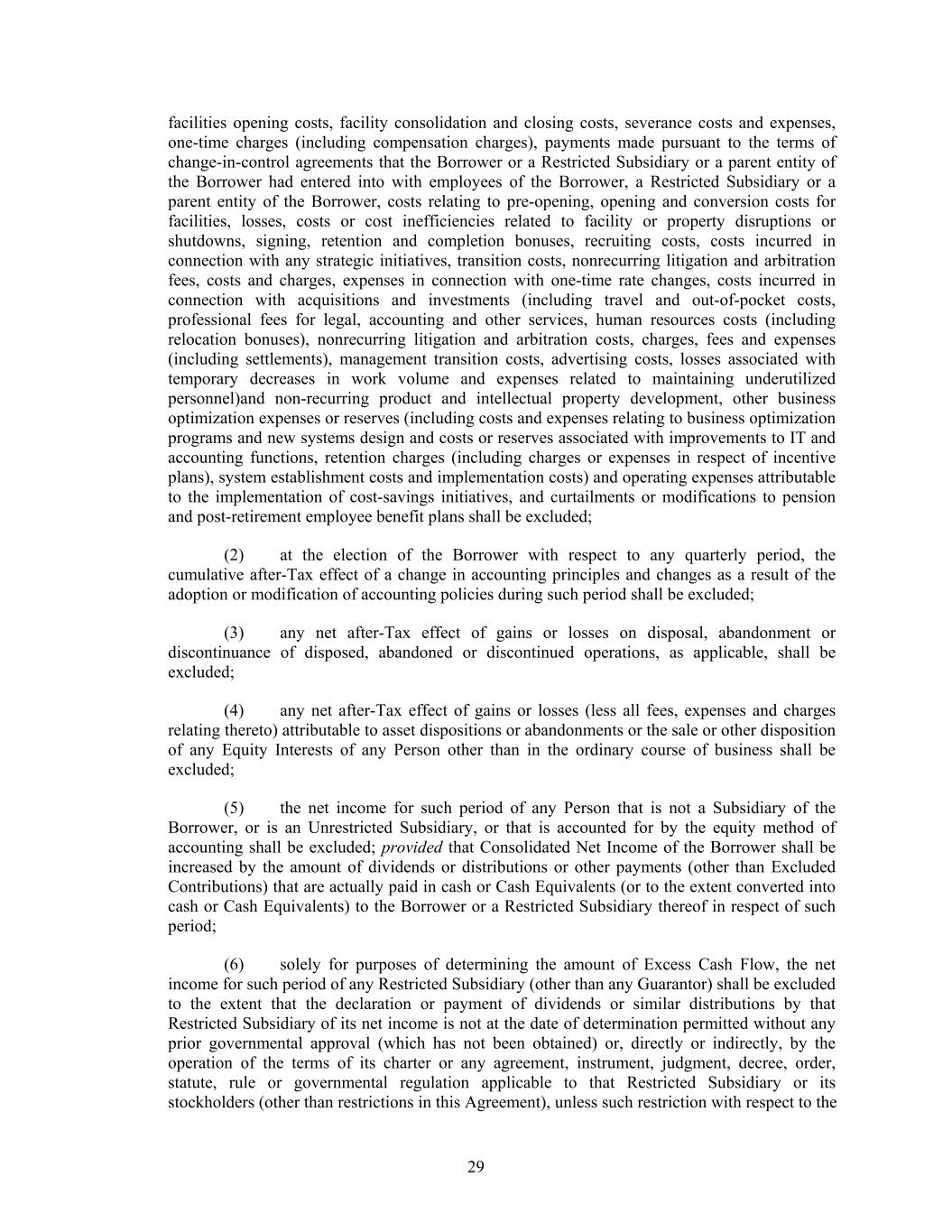 facilities opening costs, facility consolidation and closing costs, severance costs and expenses,one-time charges (including compensation charges), payments made pursuant to the terms ofchange-in-control agreements that the Borrower or a Restricted Subsidiary or a parent entity ofthe Borrower had entered into with employees of the Borrower, a Restricted Subsidiary or aparent entity of the Borrower, costs relating to pre-opening, opening and conversion costs forfacilities, losses, costs or cost inefficiencies related to facility or property disruptions orshutdowns, signing, retention and completion bonuses, recruiting costs, costs incurred inconnection with any strategic initiatives, transition costs, nonrecurring litigation and arbitrationfees, costs and charges, expenses in connection with one-time rate changes, costs incurred inconnection with acquisitions and investments (including travel and out-of-pocket costs,professional fees for legal, accounting and other services, human resources costs (includingrelocation bonuses), nonrecurring litigation and arbitration costs, charges, fees and expenses(including settlements), management transition costs, advertising costs, losses associated withtemporary decreases in work volume and expenses related to maintaining underutilizedpersonnel)and non-recurring product and intellectual property development, other businessoptimization expenses or reserves (including costs and expenses relating to business optimizationprograms and new systems design and costs or reserves associated with improvements to IT andaccounting functions, retention charges (including charges or expenses in respect of incentiveplans), system establishment costs and implementation costs) and operating expenses attributableto the implementation of cost-savings initiatives, and curtailments or modifications to pensionand post-retirement employee benefit plans shall be excluded;(2) at the election of the Borrower with respect to any quarterly period, thecumulative after-Tax effect of a change in accounting principles and changes as a result of theadoption or modification of accounting policies during such period shall be excluded;(3) any net after-Tax effect of gains or losses on disposal, abandonment ordiscontinuance of disposed, abandoned or discontinued operations, as applicable, shall beexcluded;(4) any net after-Tax effect of gains or losses (less all fees, expenses and chargesrelating thereto) attributable to asset dispositions or abandonments or the sale or other dispositionof any Equity Interests of any Person other than in the ordinary course of business shall beexcluded;(5) the net income for such period of any Person that is not a Subsidiary of theBorrower, or is an Unrestricted Subsidiary, or that is accounted for by the equity method ofaccounting shall be excluded; provided that Consolidated Net Income of the Borrower shall beincreased by the amount of dividends or distributions or other payments (other than ExcludedContributions) that are actually paid in cash or Cash Equivalents (or to the extent converted intocash or Cash Equivalents) to the Borrower or a Restricted Subsidiary thereof in respect of suchperiod; (6) solely for purposes of determining the amount of Excess Cash Flow, the netincome for such period of any Restricted Subsidiary (other than any Guarantor) shall be excludedto the extent that the declaration or payment of dividends or similar distributions by thatRestricted Subsidiary of its net income is not at the date of determination permitted without anyprior governmental approval (which has not been obtained) or, directly or indirectly, by theoperation of the terms of its charter or any agreement, instrument, judgment, decree, order,statute, rule or governmental regulation applicable to that Restricted Subsidiary or itsstockholders (other than restrictions in this Agreement), unless such restriction with respect to the29