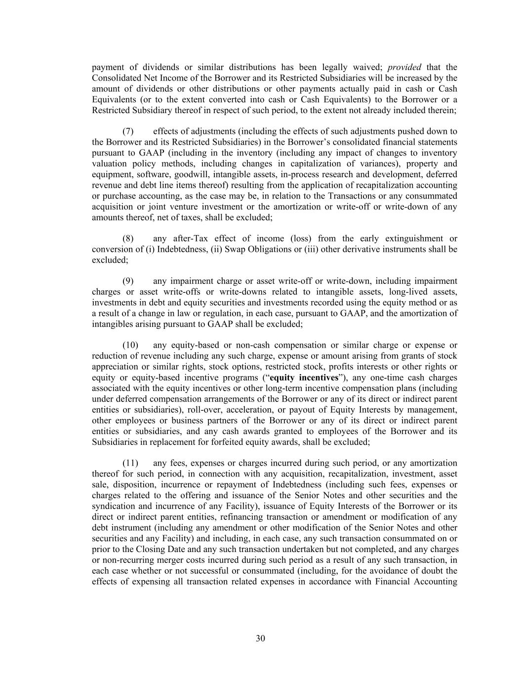 payment of dividends or similar distributions has been legally waived; provided that theConsolidated Net Income of the Borrower and its Restricted Subsidiaries will be increased by theamount of dividends or other distributions or other payments actually paid in cash or CashEquivalents (or to the extent converted into cash or Cash Equivalents) to the Borrower or aRestricted Subsidiary thereof in respect of such period, to the extent not already included therein;(7) effects of adjustments (including the effects of such adjustments pushed down tothe Borrower and its Restricted Subsidiaries) in the Borrower’s consolidated financial statementspursuant to GAAP (including in the inventory (including any impact of changes to inventoryvaluation policy methods, including changes in capitalization of variances), property andequipment, software, goodwill, intangible assets, in-process research and development, deferredrevenue and debt line items thereof) resulting from the application of recapitalization accountingor purchase accounting, as the case may be, in relation to the Transactions or any consummatedacquisition or joint venture investment or the amortization or write-off or write-down of anyamounts thereof, net of taxes, shall be excluded;(8) any after-Tax effect of income (loss) from the early extinguishment orconversion of (i) Indebtedness, (ii) Swap Obligations or (iii) other derivative instruments shall beexcluded;(9) any impairment charge or asset write-off or write-down, including impairmentcharges or asset write-offs or write-downs related to intangible assets, long-lived assets,investments in debt and equity securities and investments recorded using the equity method or asa result of a change in law or regulation, in each case, pursuant to GAAP, and the amortization ofintangibles arising pursuant to GAAP shall be excluded;(10) any equity-based or non-cash compensation or similar charge or expense orreduction of revenue including any such charge, expense or amount arising from grants of stockappreciation or similar rights, stock options, restricted stock, profits interests or other rights orequity or equity-based incentive programs (“equity incentives”), any one-time cash chargesassociated with the equity incentives or other long-term incentive compensation plans (includingunder deferred compensation arrangements of the Borrower or any of its direct or indirect parententities or subsidiaries), roll-over, acceleration, or payout of Equity Interests by management,other employees or business partners of the Borrower or any of its direct or indirect parententities or subsidiaries, and any cash awards granted to employees of the Borrower and itsSubsidiaries in replacement for forfeited equity awards, shall be excluded;(11) any fees, expenses or charges incurred during such period, or any amortizationthereof for such period, in connection with any acquisition, recapitalization, investment, assetsale, disposition, incurrence or repayment of Indebtedness (including such fees, expenses orcharges related to the offering and issuance of the Senior Notes and other securities and thesyndication and incurrence of any Facility), issuance of Equity Interests of the Borrower or itsdirect or indirect parent entities, refinancing transaction or amendment or modification of anydebt instrument (including any amendment or other modification of the Senior Notes and othersecurities and any Facility) and including, in each case, any such transaction consummated on orprior to the Closing Date and any such transaction undertaken but not completed, and any chargesor non-recurring merger costs incurred during such period as a result of any such transaction, ineach case whether or not successful or consummated (including, for the avoidance of doubt theeffects of expensing all transaction related expenses in accordance with Financial Accounting30