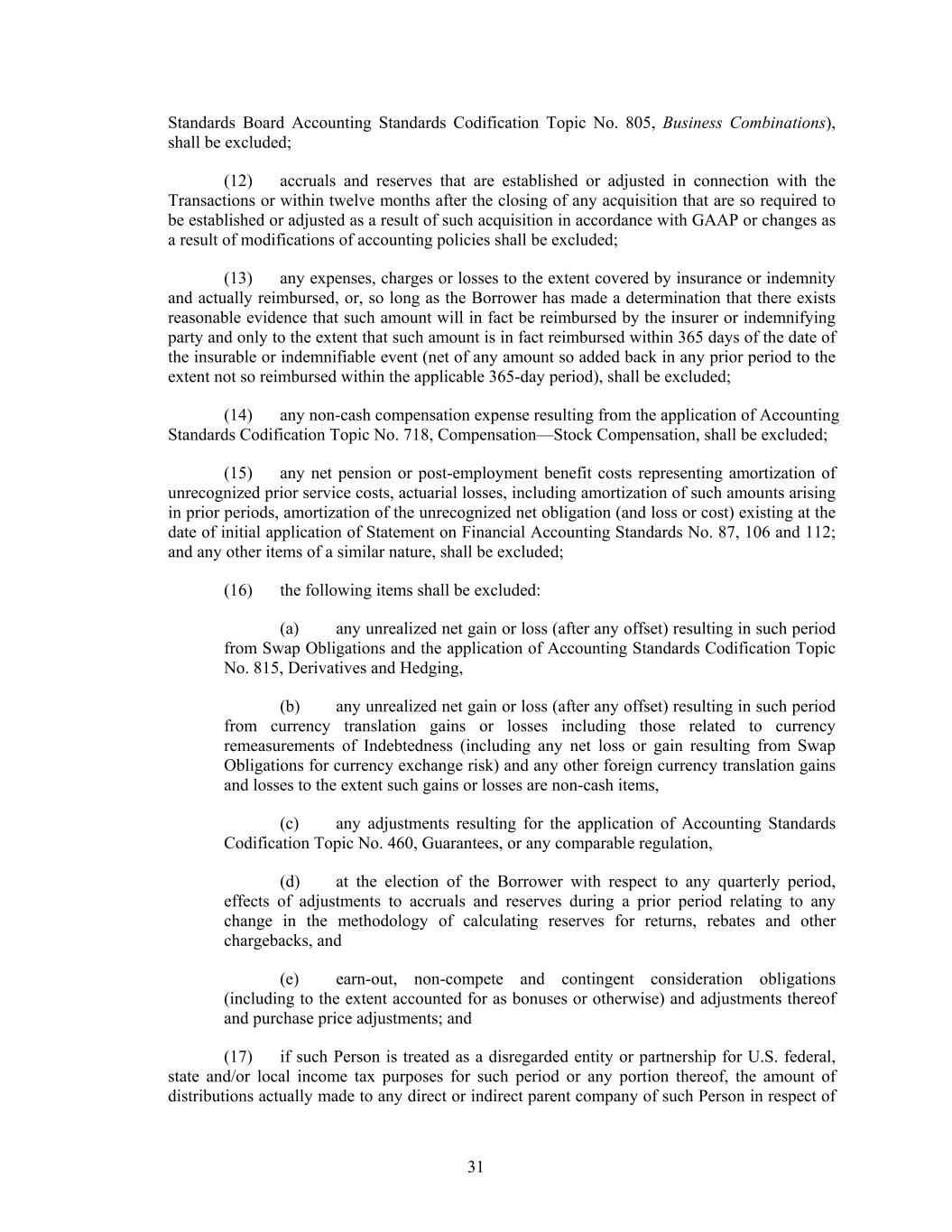Standards Board Accounting Standards Codification Topic No. 805, Business Combinations),shall be excluded;(12) accruals and reserves that are established or adjusted in connection with theTransactions or within twelve months after the closing of any acquisition that are so required tobe established or adjusted as a result of such acquisition in accordance with GAAP or changes asa result of modifications of accounting policies shall be excluded;(13) any expenses, charges or losses to the extent covered by insurance or indemnityand actually reimbursed, or, so long as the Borrower has made a determination that there existsreasonable evidence that such amount will in fact be reimbursed by the insurer or indemnifyingparty and only to the extent that such amount is in fact reimbursed within 365 days of the date ofthe insurable or indemnifiable event (net of any amount so added back in any prior period to theextent not so reimbursed within the applicable 365-day period), shall be excluded;(14) any non-cash compensation expense resulting from the application of AccountingStandards Codification Topic No. 718, Compensation—Stock Compensation, shall be excluded;(15) any net pension or post-employment benefit costs representing amortization ofunrecognized prior service costs, actuarial losses, including amortization of such amounts arisingin prior periods, amortization of the unrecognized net obligation (and loss or cost) existing at thedate of initial application of Statement on Financial Accounting Standards No. 87, 106 and 112;and any other items of a similar nature, shall be excluded;(16) the following items shall be excluded:(a) any unrealized net gain or loss (after any offset) resulting in such periodfrom Swap Obligations and the application of Accounting Standards Codification TopicNo. 815, Derivatives and Hedging,(b) any unrealized net gain or loss (after any offset) resulting in such periodfrom currency translation gains or losses including those related to currencyremeasurements of Indebtedness (including any net loss or gain resulting from SwapObligations for currency exchange risk) and any other foreign currency translation gainsand losses to the extent such gains or losses are non-cash items,(c) any adjustments resulting for the application of Accounting StandardsCodification Topic No. 460, Guarantees, or any comparable regulation,(d) at the election of the Borrower with respect to any quarterly period,effects of adjustments to accruals and reserves during a prior period relating to anychange in the methodology of calculating reserves for returns, rebates and otherchargebacks, and(e) earn-out, non-compete and contingent consideration obligations(including to the extent accounted for as bonuses or otherwise) and adjustments thereofand purchase price adjustments; and(17) if such Person is treated as a disregarded entity or partnership for U.S. federal,state and/or local income tax purposes for such period or any portion thereof, the amount ofdistributions actually made to any direct or indirect parent company of such Person in respect of31