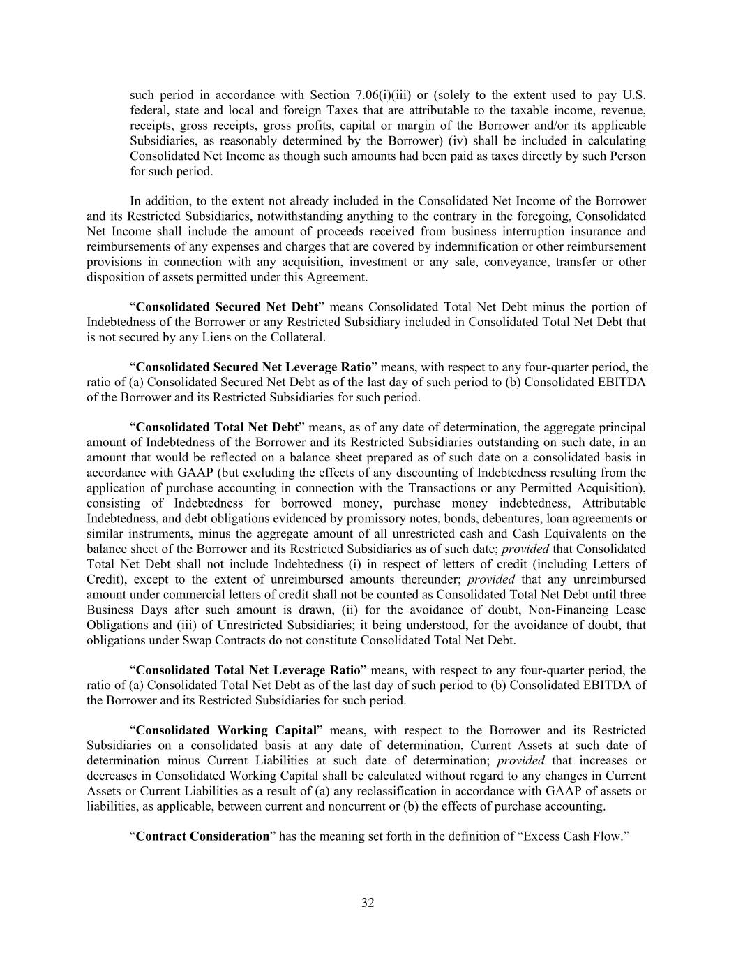 such period in accordance with Section 7.06(i)(iii) or (solely to the extent used to pay U.S.federal, state and local and foreign Taxes that are attributable to the taxable income, revenue,receipts, gross receipts, gross profits, capital or margin of the Borrower and/or its applicableSubsidiaries, as reasonably determined by the Borrower) (iv) shall be included in calculatingConsolidated Net Income as though such amounts had been paid as taxes directly by such Personfor such period.In addition, to the extent not already included in the Consolidated Net Income of the Borrowerand its Restricted Subsidiaries, notwithstanding anything to the contrary in the foregoing, ConsolidatedNet Income shall include the amount of proceeds received from business interruption insurance andreimbursements of any expenses and charges that are covered by indemnification or other reimbursementprovisions in connection with any acquisition, investment or any sale, conveyance, transfer or otherdisposition of assets permitted under this Agreement.“Consolidated Secured Net Debt” means Consolidated Total Net Debt minus the portion ofIndebtedness of the Borrower or any Restricted Subsidiary included in Consolidated Total Net Debt thatis not secured by any Liens on the Collateral.“Consolidated Secured Net Leverage Ratio” means, with respect to any four-quarter period, theratio of (a) Consolidated Secured Net Debt as of the last day of such period to (b) Consolidated EBITDAof the Borrower and its Restricted Subsidiaries for such period.“Consolidated Total Net Debt” means, as of any date of determination, the aggregate principalamount of Indebtedness of the Borrower and its Restricted Subsidiaries outstanding on such date, in anamount that would be reflected on a balance sheet prepared as of such date on a consolidated basis inaccordance with GAAP (but excluding the effects of any discounting of Indebtedness resulting from theapplication of purchase accounting in connection with the Transactions or any Permitted Acquisition),consisting of Indebtedness for borrowed money, purchase money indebtedness, AttributableIndebtedness, and debt obligations evidenced by promissory notes, bonds, debentures, loan agreements orsimilar instruments, minus the aggregate amount of all unrestricted cash and Cash Equivalents on thebalance sheet of the Borrower and its Restricted Subsidiaries as of such date; provided that ConsolidatedTotal Net Debt shall not include Indebtedness (i) in respect of letters of credit (including Letters ofCredit), except to the extent of unreimbursed amounts thereunder; provided that any unreimbursedamount under commercial letters of credit shall not be counted as Consolidated Total Net Debt until threeBusiness Days after such amount is drawn, (ii) for the avoidance of doubt, Non-Financing LeaseObligations and (iii) of Unrestricted Subsidiaries; it being understood, for the avoidance of doubt, thatobligations under Swap Contracts do not constitute Consolidated Total Net Debt.“Consolidated Total Net Leverage Ratio” means, with respect to any four-quarter period, theratio of (a) Consolidated Total Net Debt as of the last day of such period to (b) Consolidated EBITDA ofthe Borrower and its Restricted Subsidiaries for such period.“Consolidated Working Capital” means, with respect to the Borrower and its RestrictedSubsidiaries on a consolidated basis at any date of determination, Current Assets at such date ofdetermination minus Current Liabilities at such date of determination; provided that increases ordecreases in Consolidated Working Capital shall be calculated without regard to any changes in CurrentAssets or Current Liabilities as a result of (a) any reclassification in accordance with GAAP of assets orliabilities, as applicable, between current and noncurrent or (b) the effects of purchase accounting.“Contract Consideration” has the meaning set forth in the definition of “Excess Cash Flow.”32