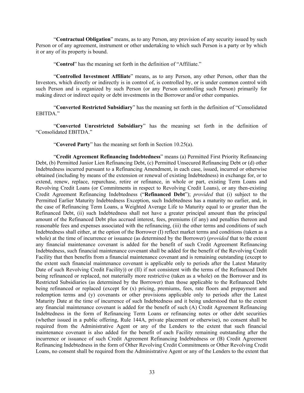 “Contractual Obligation” means, as to any Person, any provision of any security issued by suchPerson or of any agreement, instrument or other undertaking to which such Person is a party or by whichit or any of its property is bound.“Control” has the meaning set forth in the definition of “Affiliate.”“Controlled Investment Affiliate” means, as to any Person, any other Person, other than theInvestors, which directly or indirectly is in control of, is controlled by, or is under common control withsuch Person and is organized by such Person (or any Person controlling such Person) primarily formaking direct or indirect equity or debt investments in the Borrower and/or other companies.“Converted Restricted Subsidiary” has the meaning set forth in the definition of “ConsolidatedEBITDA.”“Converted Unrestricted Subsidiary” has the meaning set forth in the definition of“Consolidated EBITDA.”“Covered Party” has the meaning set forth in Section 10.25(a).“Credit Agreement Refinancing Indebtedness” means (a) Permitted First Priority RefinancingDebt, (b) Permitted Junior Lien Refinancing Debt, (c) Permitted Unsecured Refinancing Debt or (d) otherIndebtedness incurred pursuant to a Refinancing Amendment, in each case, issued, incurred or otherwiseobtained (including by means of the extension or renewal of existing Indebtedness) in exchange for, or toextend, renew, replace, repurchase, retire or refinance, in whole or part, existing Term Loans andRevolving Credit Loans (or Commitments in respect to Revolving Credit Loans), or any then-existingCredit Agreement Refinancing Indebtedness (“Refinanced Debt”); provided that (i) subject to thePermitted Earlier Maturity Indebtedness Exception, such Indebtedness has a maturity no earlier, and, inthe case of Refinancing Term Loans, a Weighted Average Life to Maturity equal to or greater than theRefinanced Debt, (ii) such Indebtedness shall not have a greater principal amount than the principalamount of the Refinanced Debt plus accrued interest, fees, premiums (if any) and penalties thereon andreasonable fees and expenses associated with the refinancing, (iii) the other terms and conditions of suchIndebtedness shall either, at the option of the Borrower (I) reflect market terms and conditions (taken as awhole) at the time of incurrence or issuance (as determined by the Borrower) (provided that to the extentany financial maintenance covenant is added for the benefit of such Credit Agreement RefinancingIndebtedness, such financial maintenance covenant shall be added for the benefit of the Revolving CreditFacility that then benefits from a financial maintenance covenant and is remaining outstanding (except tothe extent such financial maintenance covenant is applicable only to periods after the Latest MaturityDate of such Revolving Credit Facility)) or (II) if not consistent with the terms of the Refinanced Debtbeing refinanced or replaced, not materially more restrictive (taken as a whole) on the Borrower and itsRestricted Subsidiaries (as determined by the Borrower) than those applicable to the Refinanced Debtbeing refinanced or replaced (except for (x) pricing, premiums, fees, rate floors and prepayment andredemption terms and (y) covenants or other provisions applicable only to periods after the LatestMaturity Date at the time of incurrence of such Indebtedness and it being understood that to the extentany financial maintenance covenant is added for the benefit of such (A) Credit Agreement RefinancingIndebtedness in the form of Refinancing Term Loans or refinancing notes or other debt securities(whether issued in a public offering, Rule 144A, private placement or otherwise), no consent shall berequired from the Administrative Agent or any of the Lenders to the extent that such financialmaintenance covenant is also added for the benefit of each Facility remaining outstanding after theincurrence or issuance of such Credit Agreement Refinancing Indebtedness or (B) Credit AgreementRefinancing Indebtedness in the form of Other Revolving Credit Commitments or Other Revolving CreditLoans, no consent shall be required from the Administrative Agent or any of the Lenders to the extent that33