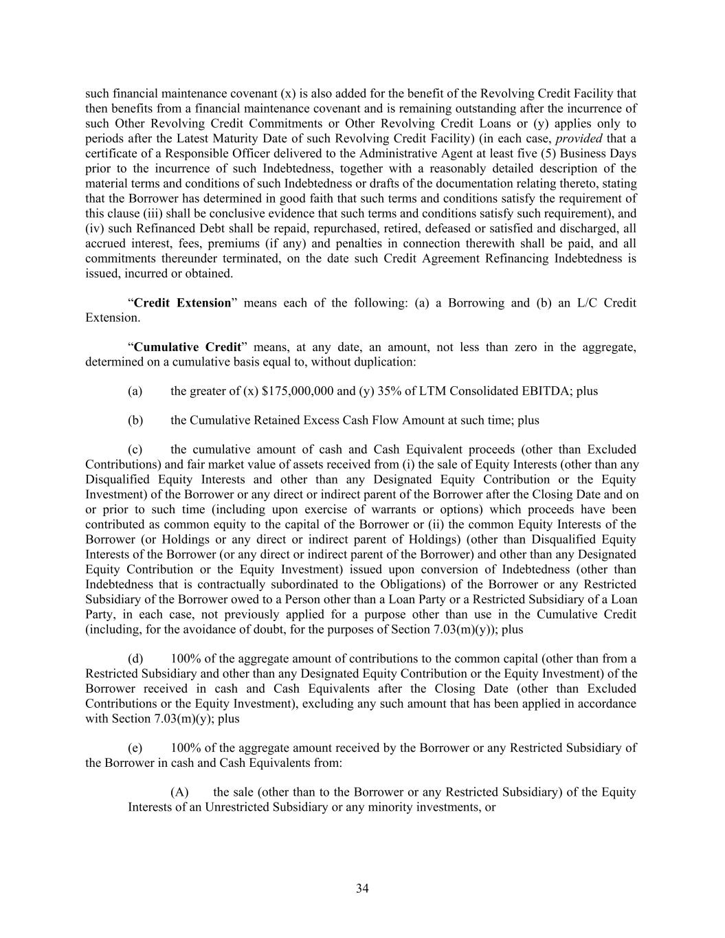 such financial maintenance covenant (x) is also added for the benefit of the Revolving Credit Facility thatthen benefits from a financial maintenance covenant and is remaining outstanding after the incurrence ofsuch Other Revolving Credit Commitments or Other Revolving Credit Loans or (y) applies only toperiods after the Latest Maturity Date of such Revolving Credit Facility) (in each case, provided that acertificate of a Responsible Officer delivered to the Administrative Agent at least five (5) Business Daysprior to the incurrence of such Indebtedness, together with a reasonably detailed description of thematerial terms and conditions of such Indebtedness or drafts of the documentation relating thereto, statingthat the Borrower has determined in good faith that such terms and conditions satisfy the requirement ofthis clause (iii) shall be conclusive evidence that such terms and conditions satisfy such requirement), and(iv) such Refinanced Debt shall be repaid, repurchased, retired, defeased or satisfied and discharged, allaccrued interest, fees, premiums (if any) and penalties in connection therewith shall be paid, and allcommitments thereunder terminated, on the date such Credit Agreement Refinancing Indebtedness isissued, incurred or obtained.“Credit Extension” means each of the following: (a) a Borrowing and (b) an L/C CreditExtension.“Cumulative Credit” means, at any date, an amount, not less than zero in the aggregate,determined on a cumulative basis equal to, without duplication:(a) the greater of (x) $175,000,000 and (y) 35% of LTM Consolidated EBITDA; plus(b) the Cumulative Retained Excess Cash Flow Amount at such time; plus(c) the cumulative amount of cash and Cash Equivalent proceeds (other than ExcludedContributions) and fair market value of assets received from (i) the sale of Equity Interests (other than anyDisqualified Equity Interests and other than any Designated Equity Contribution or the EquityInvestment) of the Borrower or any direct or indirect parent of the Borrower after the Closing Date and onor prior to such time (including upon exercise of warrants or options) which proceeds have beencontributed as common equity to the capital of the Borrower or (ii) the common Equity Interests of theBorrower (or Holdings or any direct or indirect parent of Holdings) (other than Disqualified EquityInterests of the Borrower (or any direct or indirect parent of the Borrower) and other than any DesignatedEquity Contribution or the Equity Investment) issued upon conversion of Indebtedness (other thanIndebtedness that is contractually subordinated to the Obligations) of the Borrower or any RestrictedSubsidiary of the Borrower owed to a Person other than a Loan Party or a Restricted Subsidiary of a LoanParty, in each case, not previously applied for a purpose other than use in the Cumulative Credit(including, for the avoidance of doubt, for the purposes of Section 7.03(m)(y)); plus(d) 100% of the aggregate amount of contributions to the common capital (other than from aRestricted Subsidiary and other than any Designated Equity Contribution or the Equity Investment) of theBorrower received in cash and Cash Equivalents after the Closing Date (other than ExcludedContributions or the Equity Investment), excluding any such amount that has been applied in accordancewith Section 7.03(m)(y); plus(e) 100% of the aggregate amount received by the Borrower or any Restricted Subsidiary ofthe Borrower in cash and Cash Equivalents from:(A) the sale (other than to the Borrower or any Restricted Subsidiary) of the EquityInterests of an Unrestricted Subsidiary or any minority investments, or34