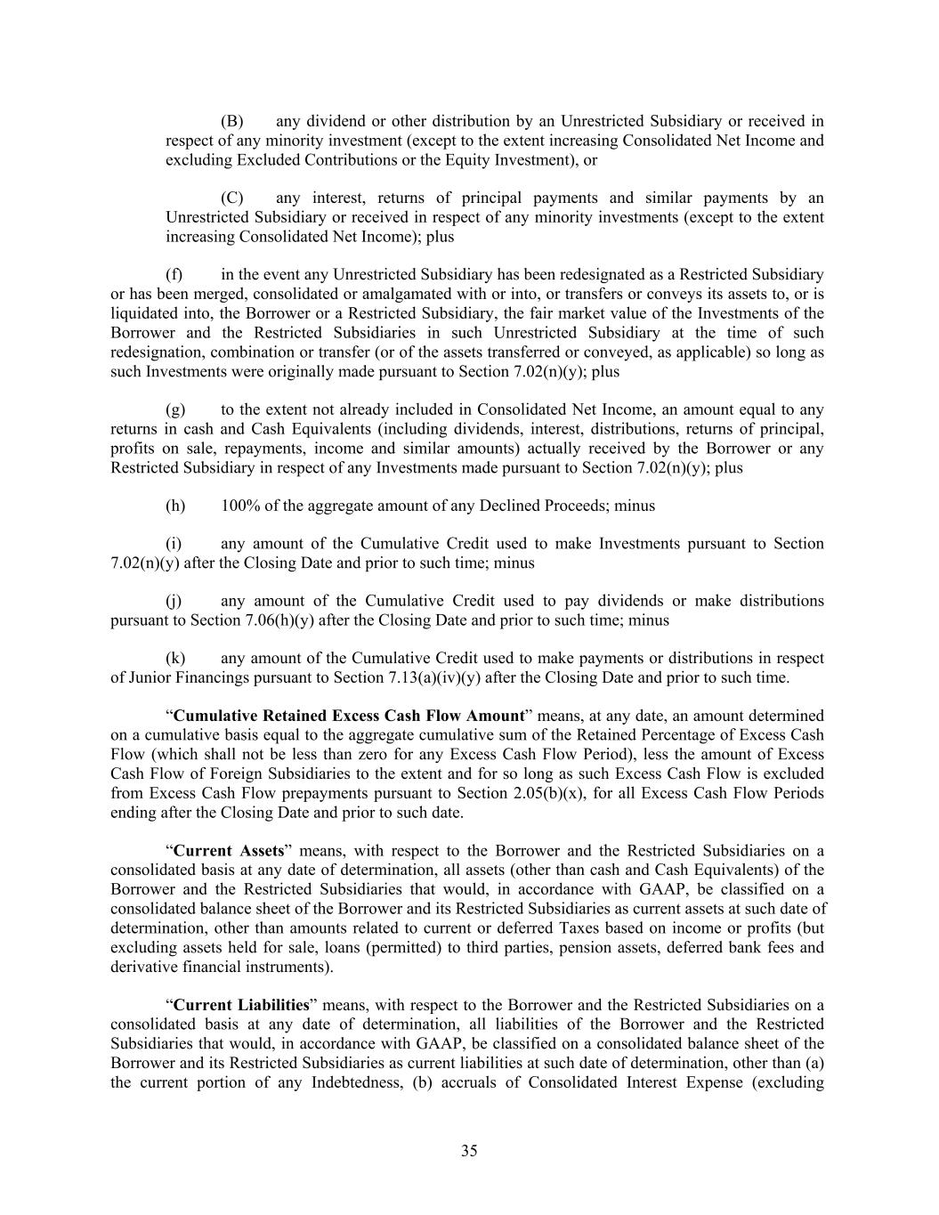 (B) any dividend or other distribution by an Unrestricted Subsidiary or received inrespect of any minority investment (except to the extent increasing Consolidated Net Income andexcluding Excluded Contributions or the Equity Investment), or(C) any interest, returns of principal payments and similar payments by anUnrestricted Subsidiary or received in respect of any minority investments (except to the extentincreasing Consolidated Net Income); plus(f) in the event any Unrestricted Subsidiary has been redesignated as a Restricted Subsidiaryor has been merged, consolidated or amalgamated with or into, or transfers or conveys its assets to, or isliquidated into, the Borrower or a Restricted Subsidiary, the fair market value of the Investments of theBorrower and the Restricted Subsidiaries in such Unrestricted Subsidiary at the time of suchredesignation, combination or transfer (or of the assets transferred or conveyed, as applicable) so long assuch Investments were originally made pursuant to Section 7.02(n)(y); plus(g) to the extent not already included in Consolidated Net Income, an amount equal to anyreturns in cash and Cash Equivalents (including dividends, interest, distributions, returns of principal,profits on sale, repayments, income and similar amounts) actually received by the Borrower or anyRestricted Subsidiary in respect of any Investments made pursuant to Section 7.02(n)(y); plus(h) 100% of the aggregate amount of any Declined Proceeds; minus(i) any amount of the Cumulative Credit used to make Investments pursuant to Section7.02(n)(y) after the Closing Date and prior to such time; minus(j) any amount of the Cumulative Credit used to pay dividends or make distributionspursuant to Section 7.06(h)(y) after the Closing Date and prior to such time; minus(k) any amount of the Cumulative Credit used to make payments or distributions in respectof Junior Financings pursuant to Section 7.13(a)(iv)(y) after the Closing Date and prior to such time.“Cumulative Retained Excess Cash Flow Amount” means, at any date, an amount determinedon a cumulative basis equal to the aggregate cumulative sum of the Retained Percentage of Excess CashFlow (which shall not be less than zero for any Excess Cash Flow Period), less the amount of ExcessCash Flow of Foreign Subsidiaries to the extent and for so long as such Excess Cash Flow is excludedfrom Excess Cash Flow prepayments pursuant to Section 2.05(b)(x), for all Excess Cash Flow Periodsending after the Closing Date and prior to such date.“Current Assets” means, with respect to the Borrower and the Restricted Subsidiaries on aconsolidated basis at any date of determination, all assets (other than cash and Cash Equivalents) of theBorrower and the Restricted Subsidiaries that would, in accordance with GAAP, be classified on aconsolidated balance sheet of the Borrower and its Restricted Subsidiaries as current assets at such date ofdetermination, other than amounts related to current or deferred Taxes based on income or profits (butexcluding assets held for sale, loans (permitted) to third parties, pension assets, deferred bank fees andderivative financial instruments).“Current Liabilities” means, with respect to the Borrower and the Restricted Subsidiaries on aconsolidated basis at any date of determination, all liabilities of the Borrower and the RestrictedSubsidiaries that would, in accordance with GAAP, be classified on a consolidated balance sheet of theBorrower and its Restricted Subsidiaries as current liabilities at such date of determination, other than (a)the current portion of any Indebtedness, (b) accruals of Consolidated Interest Expense (excluding35