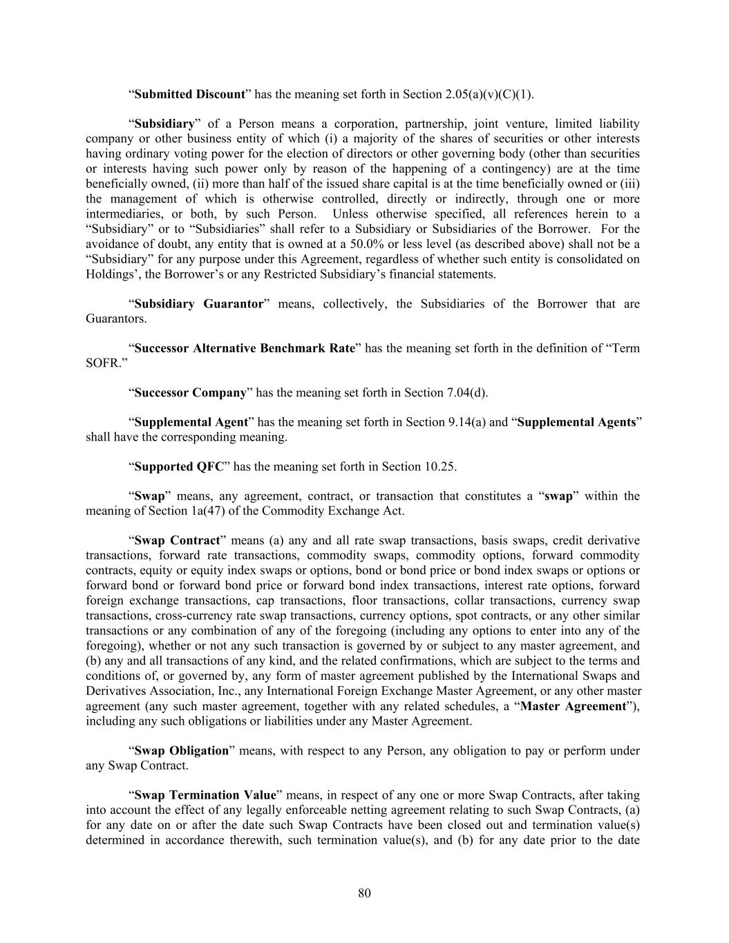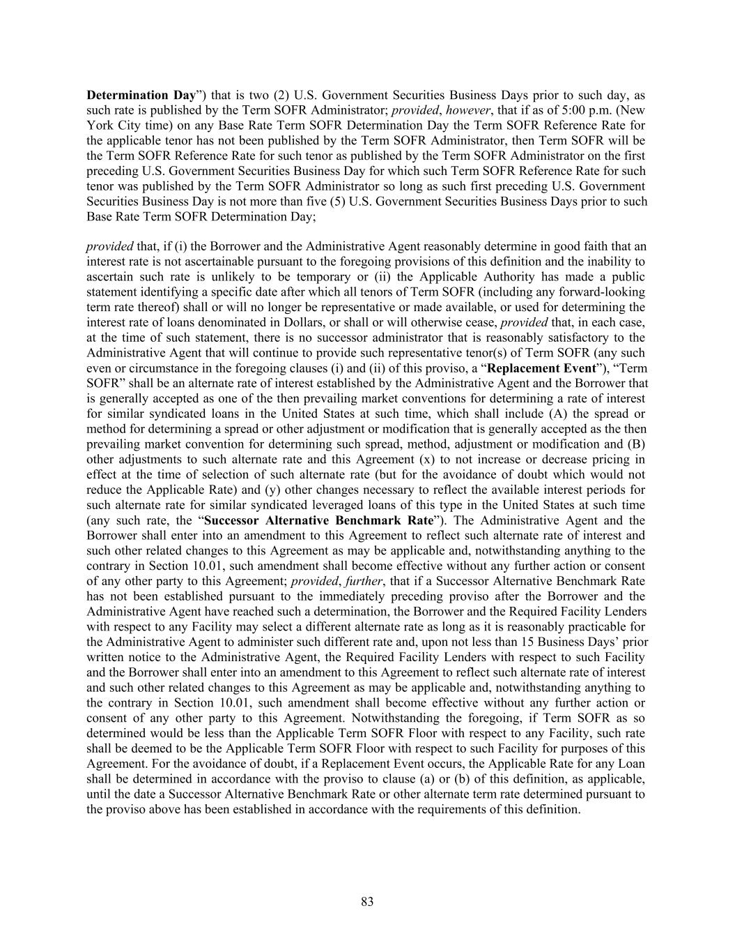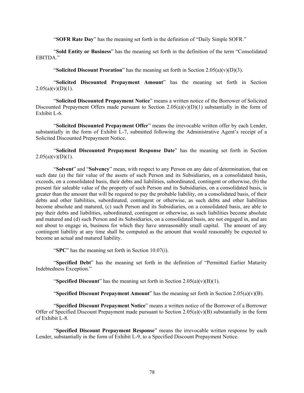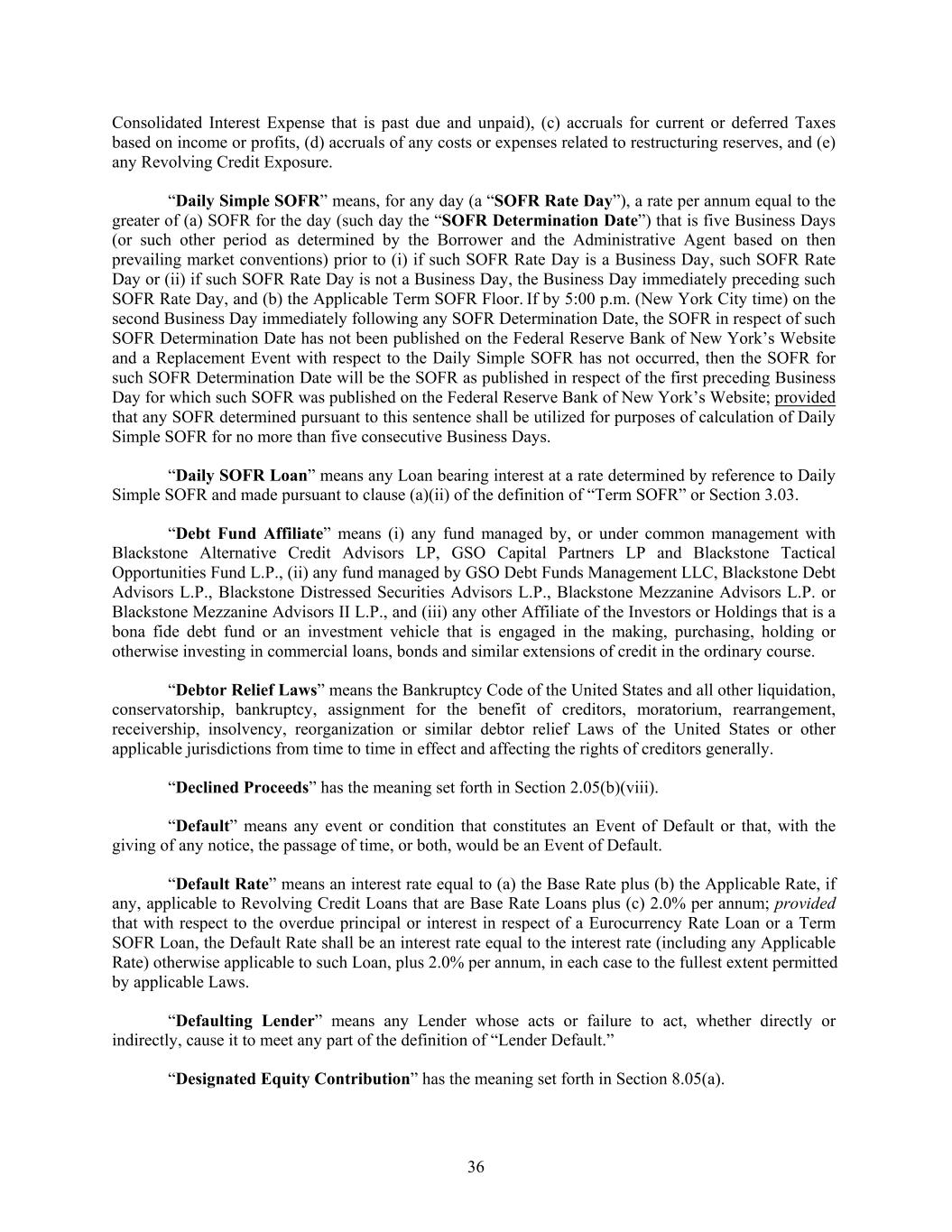 Consolidated Interest Expense that is past due and unpaid), (c) accruals for current or deferred Taxesbased on income or profits, (d) accruals of any costs or expenses related to restructuring reserves, and (e)any Revolving Credit Exposure.“Daily Simple SOFR” means, for any day (a “SOFR Rate Day”), a rate per annum equal to thegreater of (a) SOFR for the day (such day the “SOFR Determination Date”) that is five Business Days(or such other period as determined by the Borrower and the Administrative Agent based on thenprevailing market conventions) prior to (i) if such SOFR Rate Day is a Business Day, such SOFR RateDay or (ii) if such SOFR Rate Day is not a Business Day, the Business Day immediately preceding suchSOFR Rate Day, and (b) the Applicable Term SOFR Floor. If by 5:00 p.m. (New York City time) on thesecond Business Day immediately following any SOFR Determination Date, the SOFR in respect of suchSOFR Determination Date has not been published on the Federal Reserve Bank of New York’s Websiteand a Replacement Event with respect to the Daily Simple SOFR has not occurred, then the SOFR forsuch SOFR Determination Date will be the SOFR as published in respect of the first preceding BusinessDay for which such SOFR was published on the Federal Reserve Bank of New York’s Website; providedthat any SOFR determined pursuant to this sentence shall be utilized for purposes of calculation of DailySimple SOFR for no more than five consecutive Business Days.“Daily SOFR Loan” means any Loan bearing interest at a rate determined by reference to DailySimple SOFR and made pursuant to clause (a)(ii) of the definition of “Term SOFR” or Section 3.03.“Debt Fund Affiliate” means (i) any fund managed by, or under common management withBlackstone Alternative Credit Advisors LP, GSO Capital Partners LP and Blackstone TacticalOpportunities Fund L.P., (ii) any fund managed by GSO Debt Funds Management LLC, Blackstone DebtAdvisors L.P., Blackstone Distressed Securities Advisors L.P., Blackstone Mezzanine Advisors L.P. orBlackstone Mezzanine Advisors II L.P., and (iii) any other Affiliate of the Investors or Holdings that is abona fide debt fund or an investment vehicle that is engaged in the making, purchasing, holding orotherwise investing in commercial loans, bonds and similar extensions of credit in the ordinary course.“Debtor Relief Laws” means the Bankruptcy Code of the United States and all other liquidation,conservatorship, bankruptcy, assignment for the benefit of creditors, moratorium, rearrangement,receivership, insolvency, reorganization or similar debtor relief Laws of the United States or otherapplicable jurisdictions from time to time in effect and affecting the rights of creditors generally.“Declined Proceeds” has the meaning set forth in Section 2.05(b)(viii).“Default” means any event or condition that constitutes an Event of Default or that, with thegiving of any notice, the passage of time, or both, would be an Event of Default.“Default Rate” means an interest rate equal to (a) the Base Rate plus (b) the Applicable Rate, ifany, applicable to Revolving Credit Loans that are Base Rate Loans plus (c) 2.0% per annum; providedthat with respect to the overdue principal or interest in respect of a Eurocurrency Rate Loan or a TermSOFR Loan, the Default Rate shall be an interest rate equal to the interest rate (including any ApplicableRate) otherwise applicable to such Loan, plus 2.0% per annum, in each case to the fullest extent permittedby applicable Laws.“Defaulting Lender” means any Lender whose acts or failure to act, whether directly orindirectly, cause it to meet any part of the definition of “Lender Default.”“Designated Equity Contribution” has the meaning set forth in Section 8.05(a).36