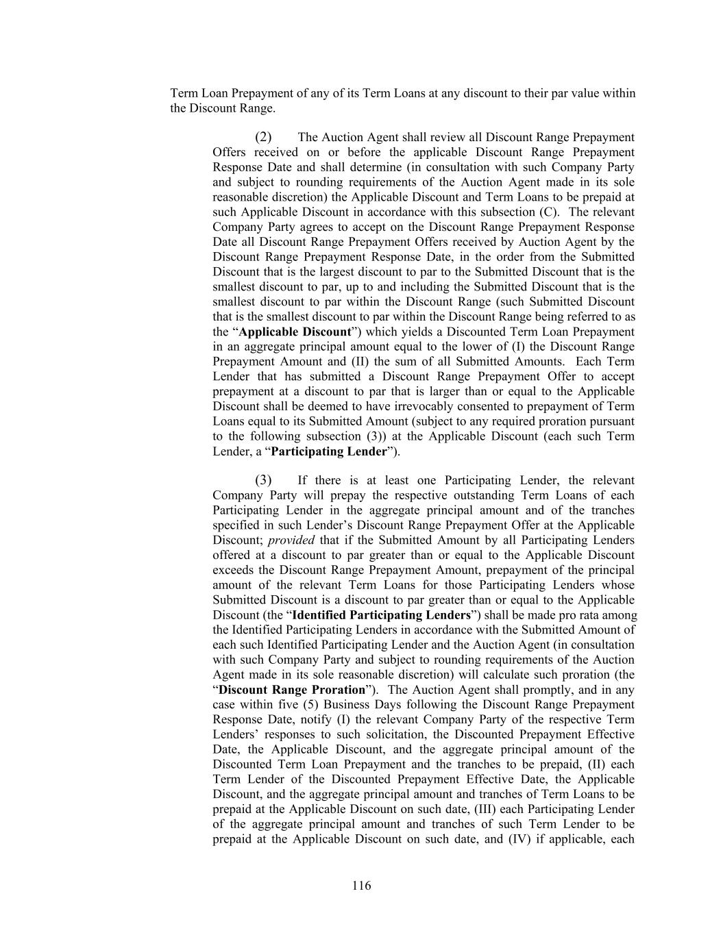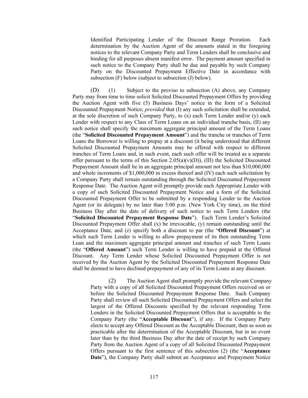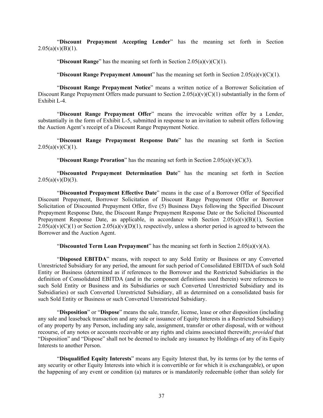 “Discount Prepayment Accepting Lender” has the meaning set forth in Section2.05(a)(v)(B)(1).“Discount Range” has the meaning set forth in Section 2.05(a)(v)(C)(1).“Discount Range Prepayment Amount” has the meaning set forth in Section 2.05(a)(v)(C)(1).“Discount Range Prepayment Notice” means a written notice of a Borrower Solicitation ofDiscount Range Prepayment Offers made pursuant to Section 2.05(a)(v)(C)(1) substantially in the form ofExhibit L-4.“Discount Range Prepayment Offer” means the irrevocable written offer by a Lender,substantially in the form of Exhibit L-5, submitted in response to an invitation to submit offers followingthe Auction Agent’s receipt of a Discount Range Prepayment Notice.“Discount Range Prepayment Response Date” has the meaning set forth in Section2.05(a)(v)(C)(1).“Discount Range Proration” has the meaning set forth in Section 2.05(a)(v)(C)(3).“Discounted Prepayment Determination Date” has the meaning set forth in Section2.05(a)(v)(D)(3).“Discounted Prepayment Effective Date” means in the case of a Borrower Offer of SpecifiedDiscount Prepayment, Borrower Solicitation of Discount Range Prepayment Offer or BorrowerSolicitation of Discounted Prepayment Offer, five (5) Business Days following the Specified DiscountPrepayment Response Date, the Discount Range Prepayment Response Date or the Solicited DiscountedPrepayment Response Date, as applicable, in accordance with Section 2.05(a)(v)(B)(1), Section2.05(a)(v)(C)(1) or Section 2.05(a)(v)(D)(1), respectively, unless a shorter period is agreed to between theBorrower and the Auction Agent.“Discounted Term Loan Prepayment” has the meaning set forth in Section 2.05(a)(v)(A).“Disposed EBITDA” means, with respect to any Sold Entity or Business or any ConvertedUnrestricted Subsidiary for any period, the amount for such period of Consolidated EBITDA of such SoldEntity or Business (determined as if references to the Borrower and the Restricted Subsidiaries in thedefinition of Consolidated EBITDA (and in the component definitions used therein) were references tosuch Sold Entity or Business and its Subsidiaries or such Converted Unrestricted Subsidiary and itsSubsidiaries) or such Converted Unrestricted Subsidiary, all as determined on a consolidated basis forsuch Sold Entity or Business or such Converted Unrestricted Subsidiary.“Disposition” or “Dispose” means the sale, transfer, license, lease or other disposition (includingany sale and leaseback transaction and any sale or issuance of Equity Interests in a Restricted Subsidiary)of any property by any Person, including any sale, assignment, transfer or other disposal, with or withoutrecourse, of any notes or accounts receivable or any rights and claims associated therewith; provided that“Disposition” and “Dispose” shall not be deemed to include any issuance by Holdings of any of its EquityInterests to another Person.“Disqualified Equity Interests” means any Equity Interest that, by its terms (or by the terms ofany security or other Equity Interests into which it is convertible or for which it is exchangeable), or uponthe happening of any event or condition (a) matures or is mandatorily redeemable (other than solely for37