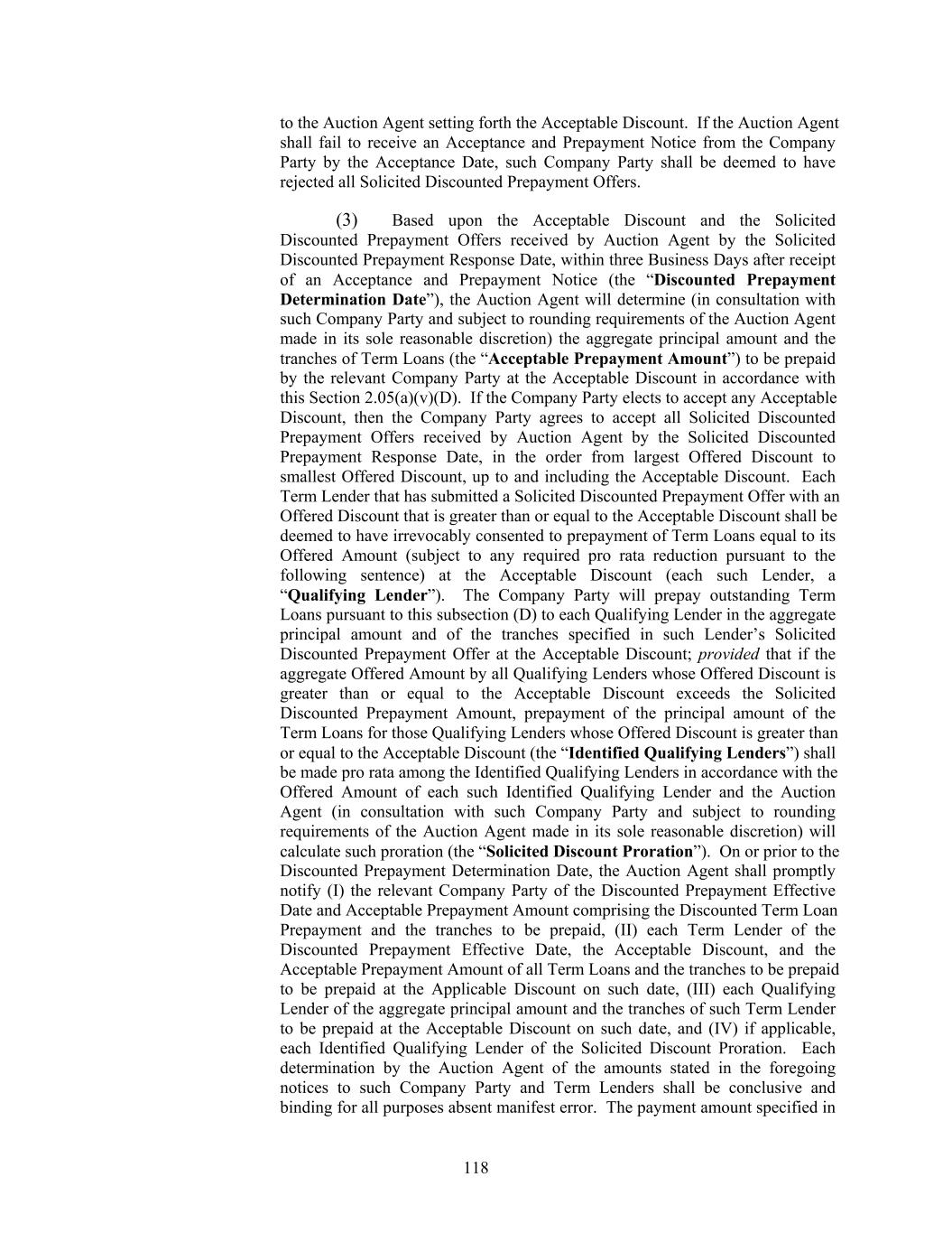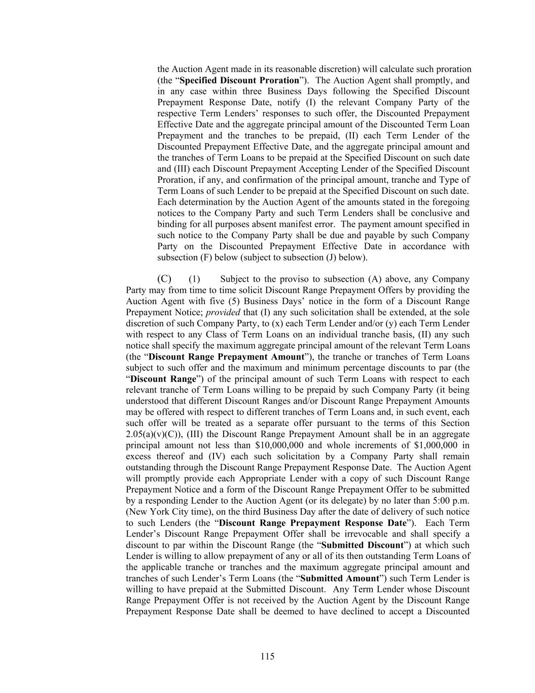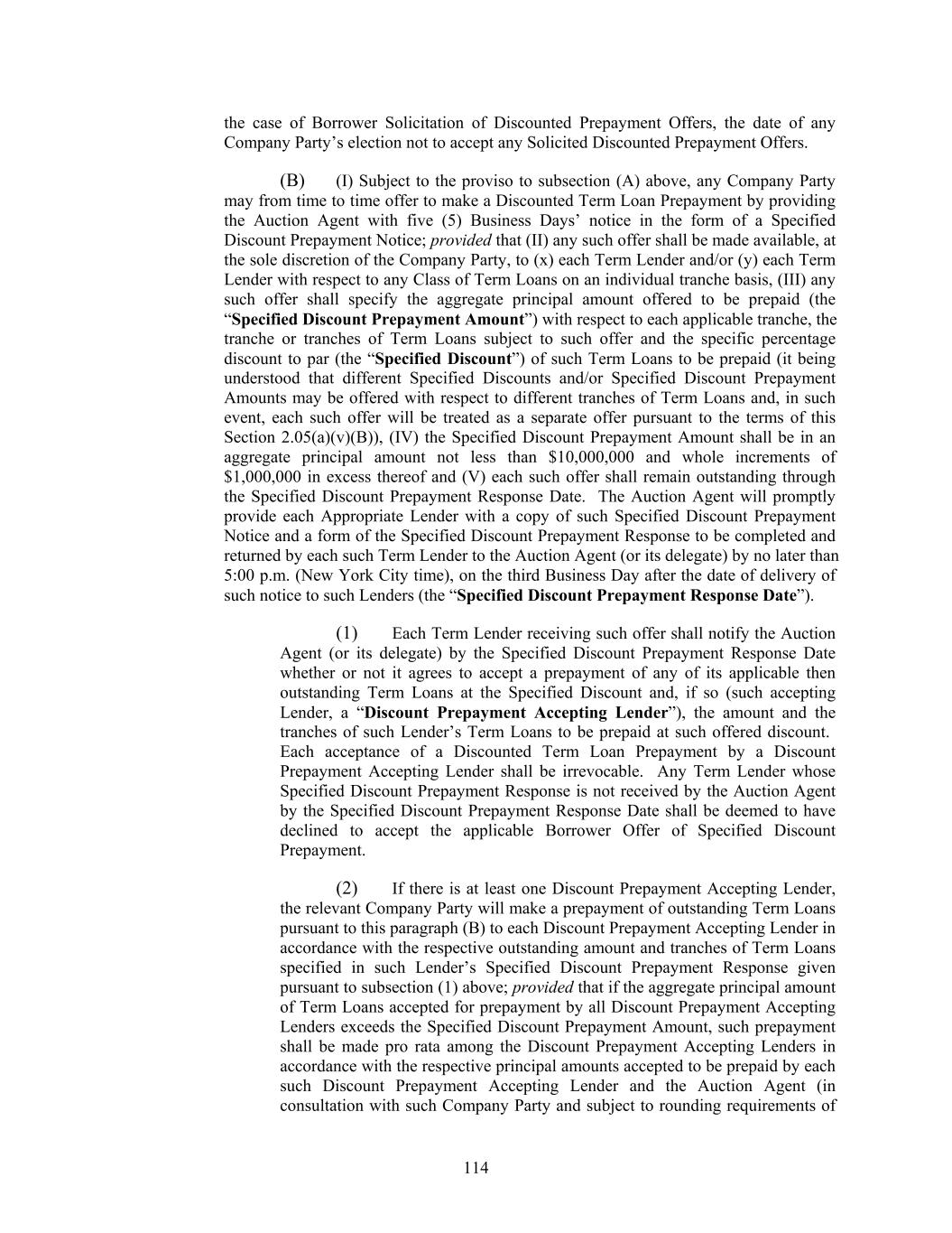“Discount Prepayment Accepting Lender” has the meaning set forth in Section2.05(a)(v)(B)(1).“Discount Range” has the meaning set forth in Section 2.05(a)(v)(C)(1).“Discount Range Prepayment Amount” has the meaning set forth in Section 2.05(a)(v)(C)(1).“Discount Range Prepayment Notice” means a written notice of a Borrower Solicitation ofDiscount Range Prepayment Offers made pursuant to Section 2.05(a)(v)(C)(1) substantially in the form ofExhibit L-4.“Discount Range Prepayment Offer” means the irrevocable written offer by a Lender,substantially in the form of Exhibit L-5, submitted in response to an invitation to submit offers followingthe Auction Agent’s receipt of a Discount Range Prepayment Notice.“Discount Range Prepayment Response Date” has the meaning set forth in Section2.05(a)(v)(C)(1).“Discount Range Proration” has the meaning set forth in Section 2.05(a)(v)(C)(3).“Discounted Prepayment Determination Date” has the meaning set forth in Section2.05(a)(v)(D)(3).“Discounted Prepayment Effective Date” means in the case of a Borrower Offer of SpecifiedDiscount Prepayment, Borrower Solicitation of Discount Range Prepayment Offer or BorrowerSolicitation of Discounted Prepayment Offer, five (5) Business Days following the Specified DiscountPrepayment Response Date, the Discount Range Prepayment Response Date or the Solicited DiscountedPrepayment Response Date, as applicable, in accordance with Section 2.05(a)(v)(B)(1), Section2.05(a)(v)(C)(1) or Section 2.05(a)(v)(D)(1), respectively, unless a shorter period is agreed to between theBorrower and the Auction Agent.“Discounted Term Loan Prepayment” has the meaning set forth in Section 2.05(a)(v)(A).“Disposed EBITDA” means, with respect to any Sold Entity or Business or any ConvertedUnrestricted Subsidiary for any period, the amount for such period of Consolidated EBITDA of such SoldEntity or Business (determined as if references to the Borrower and the Restricted Subsidiaries in thedefinition of Consolidated EBITDA (and in the component definitions used therein) were references tosuch Sold Entity or Business and its Subsidiaries or such Converted Unrestricted Subsidiary and itsSubsidiaries) or such Converted Unrestricted Subsidiary, all as determined on a consolidated basis forsuch Sold Entity or Business or such Converted Unrestricted Subsidiary.“Disposition” or “Dispose” means the sale, transfer, license, lease or other disposition (includingany sale and leaseback transaction and any sale or issuance of Equity Interests in a Restricted Subsidiary)of any property by any Person, including any sale, assignment, transfer or other disposal, with or withoutrecourse, of any notes or accounts receivable or any rights and claims associated therewith; provided that“Disposition” and “Dispose” shall not be deemed to include any issuance by Holdings of any of its EquityInterests to another Person.“Disqualified Equity Interests” means any Equity Interest that, by its terms (or by the terms ofany security or other Equity Interests into which it is convertible or for which it is exchangeable), or uponthe happening of any event or condition (a) matures or is mandatorily redeemable (other than solely for37