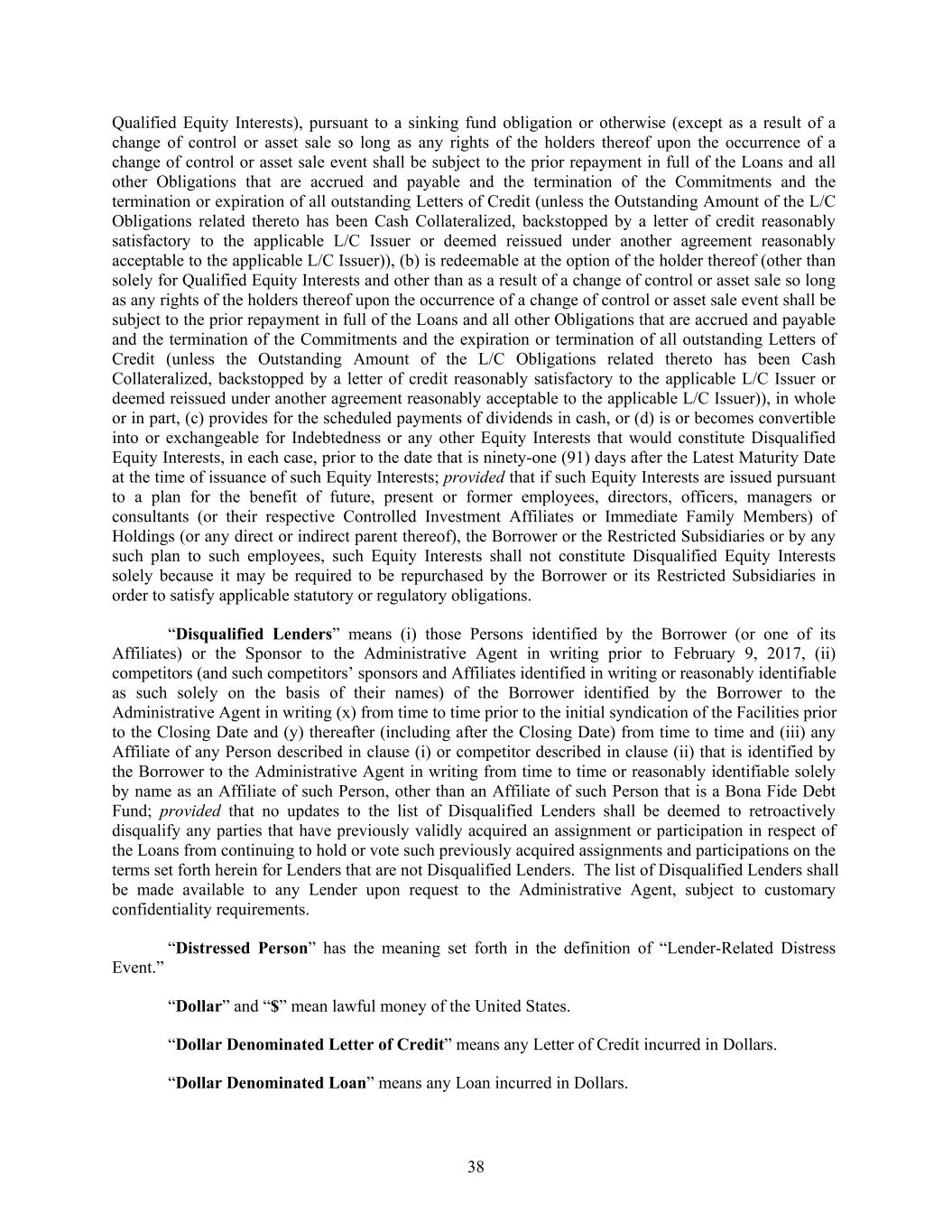 Qualified Equity Interests), pursuant to a sinking fund obligation or otherwise (except as a result of achange of control or asset sale so long as any rights of the holders thereof upon the occurrence of achange of control or asset sale event shall be subject to the prior repayment in full of the Loans and allother Obligations that are accrued and payable and the termination of the Commitments and thetermination or expiration of all outstanding Letters of Credit (unless the Outstanding Amount of the L/CObligations related thereto has been Cash Collateralized, backstopped by a letter of credit reasonablysatisfactory to the applicable L/C Issuer or deemed reissued under another agreement reasonablyacceptable to the applicable L/C Issuer)), (b) is redeemable at the option of the holder thereof (other thansolely for Qualified Equity Interests and other than as a result of a change of control or asset sale so longas any rights of the holders thereof upon the occurrence of a change of control or asset sale event shall besubject to the prior repayment in full of the Loans and all other Obligations that are accrued and payableand the termination of the Commitments and the expiration or termination of all outstanding Letters ofCredit (unless the Outstanding Amount of the L/C Obligations related thereto has been CashCollateralized, backstopped by a letter of credit reasonably satisfactory to the applicable L/C Issuer ordeemed reissued under another agreement reasonably acceptable to the applicable L/C Issuer)), in wholeor in part, (c) provides for the scheduled payments of dividends in cash, or (d) is or becomes convertibleinto or exchangeable for Indebtedness or any other Equity Interests that would constitute DisqualifiedEquity Interests, in each case, prior to the date that is ninety-one (91) days after the Latest Maturity Dateat the time of issuance of such Equity Interests; provided that if such Equity Interests are issued pursuantto a plan for the benefit of future, present or former employees, directors, officers, managers orconsultants (or their respective Controlled Investment Affiliates or Immediate Family Members) ofHoldings (or any direct or indirect parent thereof), the Borrower or the Restricted Subsidiaries or by anysuch plan to such employees, such Equity Interests shall not constitute Disqualified Equity Interestssolely because it may be required to be repurchased by the Borrower or its Restricted Subsidiaries inorder to satisfy applicable statutory or regulatory obligations.“Disqualified Lenders” means (i) those Persons identified by the Borrower (or one of itsAffiliates) or the Sponsor to the Administrative Agent in writing prior to February 9, 2017, (ii)competitors (and such competitors’ sponsors and Affiliates identified in writing or reasonably identifiableas such solely on the basis of their names) of the Borrower identified by the Borrower to theAdministrative Agent in writing (x) from time to time prior to the initial syndication of the Facilities priorto the Closing Date and (y) thereafter (including after the Closing Date) from time to time and (iii) anyAffiliate of any Person described in clause (i) or competitor described in clause (ii) that is identified bythe Borrower to the Administrative Agent in writing from time to time or reasonably identifiable solelyby name as an Affiliate of such Person, other than an Affiliate of such Person that is a Bona Fide DebtFund; provided that no updates to the list of Disqualified Lenders shall be deemed to retroactivelydisqualify any parties that have previously validly acquired an assignment or participation in respect ofthe Loans from continuing to hold or vote such previously acquired assignments and participations on theterms set forth herein for Lenders that are not Disqualified Lenders. The list of Disqualified Lenders shallbe made available to any Lender upon request to the Administrative Agent, subject to customaryconfidentiality requirements.“Distressed Person” has the meaning set forth in the definition of “Lender-Related DistressEvent.” “Dollar” and “$” mean lawful money of the United States.“Dollar Denominated Letter of Credit” means any Letter of Credit incurred in Dollars.“Dollar Denominated Loan” means any Loan incurred in Dollars.38