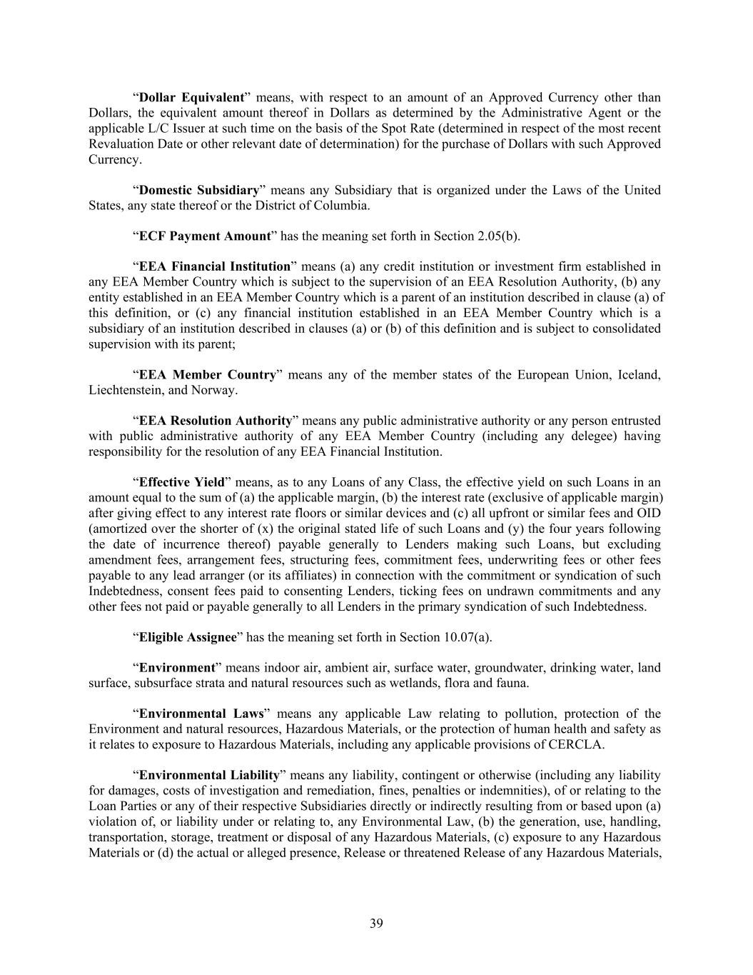 “Dollar Equivalent” means, with respect to an amount of an Approved Currency other thanDollars, the equivalent amount thereof in Dollars as determined by the Administrative Agent or theapplicable L/C Issuer at such time on the basis of the Spot Rate (determined in respect of the most recentRevaluation Date or other relevant date of determination) for the purchase of Dollars with such ApprovedCurrency.“Domestic Subsidiary” means any Subsidiary that is organized under the Laws of the UnitedStates, any state thereof or the District of Columbia.“ECF Payment Amount” has the meaning set forth in Section 2.05(b).“EEA Financial Institution” means (a) any credit institution or investment firm established inany EEA Member Country which is subject to the supervision of an EEA Resolution Authority, (b) anyentity established in an EEA Member Country which is a parent of an institution described in clause (a) ofthis definition, or (c) any financial institution established in an EEA Member Country which is asubsidiary of an institution described in clauses (a) or (b) of this definition and is subject to consolidatedsupervision with its parent;“EEA Member Country” means any of the member states of the European Union, Iceland,Liechtenstein, and Norway.“EEA Resolution Authority” means any public administrative authority or any person entrustedwith public administrative authority of any EEA Member Country (including any delegee) havingresponsibility for the resolution of any EEA Financial Institution.“Effective Yield” means, as to any Loans of any Class, the effective yield on such Loans in anamount equal to the sum of (a) the applicable margin, (b) the interest rate (exclusive of applicable margin)after giving effect to any interest rate floors or similar devices and (c) all upfront or similar fees and OID(amortized over the shorter of (x) the original stated life of such Loans and (y) the four years followingthe date of incurrence thereof) payable generally to Lenders making such Loans, but excludingamendment fees, arrangement fees, structuring fees, commitment fees, underwriting fees or other feespayable to any lead arranger (or its affiliates) in connection with the commitment or syndication of suchIndebtedness, consent fees paid to consenting Lenders, ticking fees on undrawn commitments and anyother fees not paid or payable generally to all Lenders in the primary syndication of such Indebtedness.“Eligible Assignee” has the meaning set forth in Section 10.07(a).“Environment” means indoor air, ambient air, surface water, groundwater, drinking water, landsurface, subsurface strata and natural resources such as wetlands, flora and fauna.“Environmental Laws” means any applicable Law relating to pollution, protection of theEnvironment and natural resources, Hazardous Materials, or the protection of human health and safety asit relates to exposure to Hazardous Materials, including any applicable provisions of CERCLA.“Environmental Liability” means any liability, contingent or otherwise (including any liabilityfor damages, costs of investigation and remediation, fines, penalties or indemnities), of or relating to theLoan Parties or any of their respective Subsidiaries directly or indirectly resulting from or based upon (a)violation of, or liability under or relating to, any Environmental Law, (b) the generation, use, handling,transportation, storage, treatment or disposal of any Hazardous Materials, (c) exposure to any HazardousMaterials or (d) the actual or alleged presence, Release or threatened Release of any Hazardous Materials,39