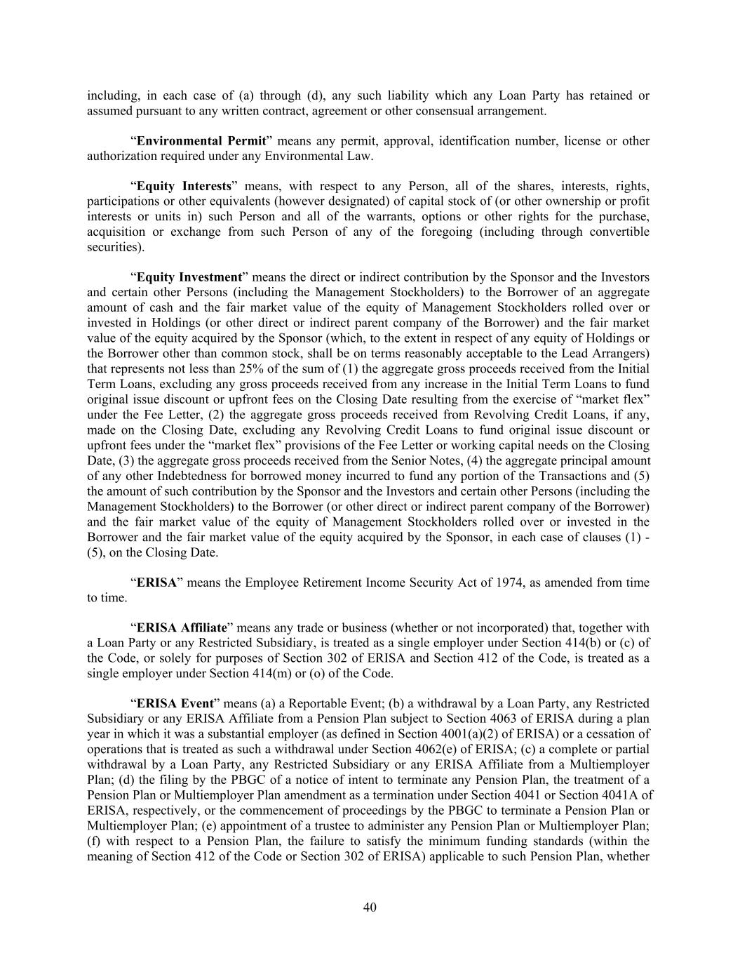 including, in each case of (a) through (d), any such liability which any Loan Party has retained orassumed pursuant to any written contract, agreement or other consensual arrangement.“Environmental Permit” means any permit, approval, identification number, license or otherauthorization required under any Environmental Law.“Equity Interests” means, with respect to any Person, all of the shares, interests, rights,participations or other equivalents (however designated) of capital stock of (or other ownership or profitinterests or units in) such Person and all of the warrants, options or other rights for the purchase,acquisition or exchange from such Person of any of the foregoing (including through convertiblesecurities).“Equity Investment” means the direct or indirect contribution by the Sponsor and the Investorsand certain other Persons (including the Management Stockholders) to the Borrower of an aggregateamount of cash and the fair market value of the equity of Management Stockholders rolled over orinvested in Holdings (or other direct or indirect parent company of the Borrower) and the fair marketvalue of the equity acquired by the Sponsor (which, to the extent in respect of any equity of Holdings orthe Borrower other than common stock, shall be on terms reasonably acceptable to the Lead Arrangers)that represents not less than 25% of the sum of (1) the aggregate gross proceeds received from the InitialTerm Loans, excluding any gross proceeds received from any increase in the Initial Term Loans to fundoriginal issue discount or upfront fees on the Closing Date resulting from the exercise of “market flex”under the Fee Letter, (2) the aggregate gross proceeds received from Revolving Credit Loans, if any,made on the Closing Date, excluding any Revolving Credit Loans to fund original issue discount orupfront fees under the “market flex” provisions of the Fee Letter or working capital needs on the ClosingDate, (3) the aggregate gross proceeds received from the Senior Notes, (4) the aggregate principal amountof any other Indebtedness for borrowed money incurred to fund any portion of the Transactions and (5)the amount of such contribution by the Sponsor and the Investors and certain other Persons (including theManagement Stockholders) to the Borrower (or other direct or indirect parent company of the Borrower)and the fair market value of the equity of Management Stockholders rolled over or invested in theBorrower and the fair market value of the equity acquired by the Sponsor, in each case of clauses (1) -(5), on the Closing Date.“ERISA” means the Employee Retirement Income Security Act of 1974, as amended from timeto time. “ERISA Affiliate” means any trade or business (whether or not incorporated) that, together witha Loan Party or any Restricted Subsidiary, is treated as a single employer under Section 414(b) or (c) ofthe Code, or solely for purposes of Section 302 of ERISA and Section 412 of the Code, is treated as asingle employer under Section 414(m) or (o) of the Code.“ERISA Event” means (a) a Reportable Event; (b) a withdrawal by a Loan Party, any RestrictedSubsidiary or any ERISA Affiliate from a Pension Plan subject to Section 4063 of ERISA during a planyear in which it was a substantial employer (as defined in Section 4001(a)(2) of ERISA) or a cessation ofoperations that is treated as such a withdrawal under Section 4062(e) of ERISA; (c) a complete or partialwithdrawal by a Loan Party, any Restricted Subsidiary or any ERISA Affiliate from a MultiemployerPlan; (d) the filing by the PBGC of a notice of intent to terminate any Pension Plan, the treatment of aPension Plan or Multiemployer Plan amendment as a termination under Section 4041 or Section 4041A ofERISA, respectively, or the commencement of proceedings by the PBGC to terminate a Pension Plan orMultiemployer Plan; (e) appointment of a trustee to administer any Pension Plan or Multiemployer Plan;(f) with respect to a Pension Plan, the failure to satisfy the minimum funding standards (within themeaning of Section 412 of the Code or Section 302 of ERISA) applicable to such Pension Plan, whether40