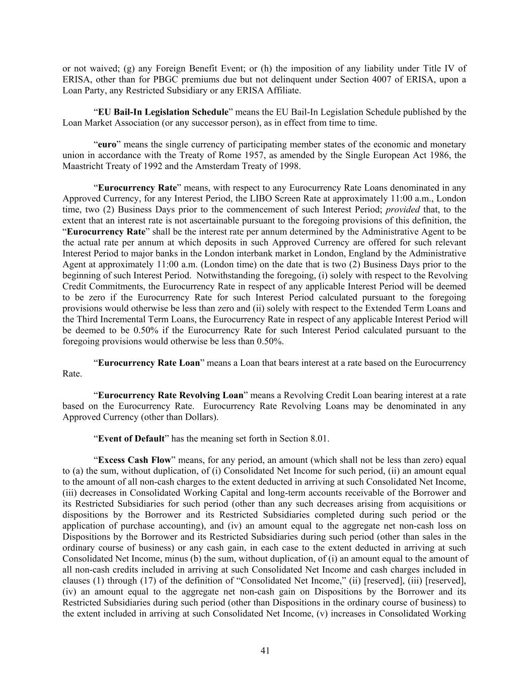 or not waived; (g) any Foreign Benefit Event; or (h) the imposition of any liability under Title IV ofERISA, other than for PBGC premiums due but not delinquent under Section 4007 of ERISA, upon aLoan Party, any Restricted Subsidiary or any ERISA Affiliate.“EU Bail-In Legislation Schedule” means the EU Bail-In Legislation Schedule published by theLoan Market Association (or any successor person), as in effect from time to time.“euro” means the single currency of participating member states of the economic and monetaryunion in accordance with the Treaty of Rome 1957, as amended by the Single European Act 1986, theMaastricht Treaty of 1992 and the Amsterdam Treaty of 1998.“Eurocurrency Rate” means, with respect to any Eurocurrency Rate Loans denominated in anyApproved Currency, for any Interest Period, the LIBO Screen Rate at approximately 11:00 a.m., Londontime, two (2) Business Days prior to the commencement of such Interest Period; provided that, to theextent that an interest rate is not ascertainable pursuant to the foregoing provisions of this definition, the“Eurocurrency Rate” shall be the interest rate per annum determined by the Administrative Agent to bethe actual rate per annum at which deposits in such Approved Currency are offered for such relevantInterest Period to major banks in the London interbank market in London, England by the AdministrativeAgent at approximately 11:00 a.m. (London time) on the date that is two (2) Business Days prior to thebeginning of such Interest Period. Notwithstanding the foregoing, (i) solely with respect to the RevolvingCredit Commitments, the Eurocurrency Rate in respect of any applicable Interest Period will be deemedto be zero if the Eurocurrency Rate for such Interest Period calculated pursuant to the foregoingprovisions would otherwise be less than zero and (ii) solely with respect to the Extended Term Loans andthe Third Incremental Term Loans, the Eurocurrency Rate in respect of any applicable Interest Period willbe deemed to be 0.50% if the Eurocurrency Rate for such Interest Period calculated pursuant to theforegoing provisions would otherwise be less than 0.50%.“Eurocurrency Rate Loan” means a Loan that bears interest at a rate based on the EurocurrencyRate. “Eurocurrency Rate Revolving Loan” means a Revolving Credit Loan bearing interest at a ratebased on the Eurocurrency Rate. Eurocurrency Rate Revolving Loans may be denominated in anyApproved Currency (other than Dollars).“Event of Default” has the meaning set forth in Section 8.01.“Excess Cash Flow” means, for any period, an amount (which shall not be less than zero) equalto (a) the sum, without duplication, of (i) Consolidated Net Income for such period, (ii) an amount equalto the amount of all non-cash charges to the extent deducted in arriving at such Consolidated Net Income,(iii) decreases in Consolidated Working Capital and long-term accounts receivable of the Borrower andits Restricted Subsidiaries for such period (other than any such decreases arising from acquisitions ordispositions by the Borrower and its Restricted Subsidiaries completed during such period or theapplication of purchase accounting), and (iv) an amount equal to the aggregate net non-cash loss onDispositions by the Borrower and its Restricted Subsidiaries during such period (other than sales in theordinary course of business) or any cash gain, in each case to the extent deducted in arriving at suchConsolidated Net Income, minus (b) the sum, without duplication, of (i) an amount equal to the amount ofall non-cash credits included in arriving at such Consolidated Net Income and cash charges included inclauses (1) through (17) of the definition of “Consolidated Net Income,” (ii) [reserved], (iii) [reserved],(iv) an amount equal to the aggregate net non-cash gain on Dispositions by the Borrower and itsRestricted Subsidiaries during such period (other than Dispositions in the ordinary course of business) tothe extent included in arriving at such Consolidated Net Income, (v) increases in Consolidated Working41