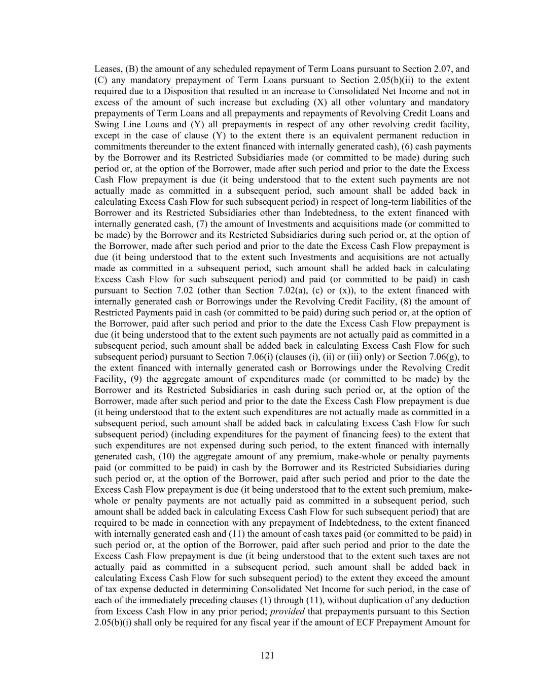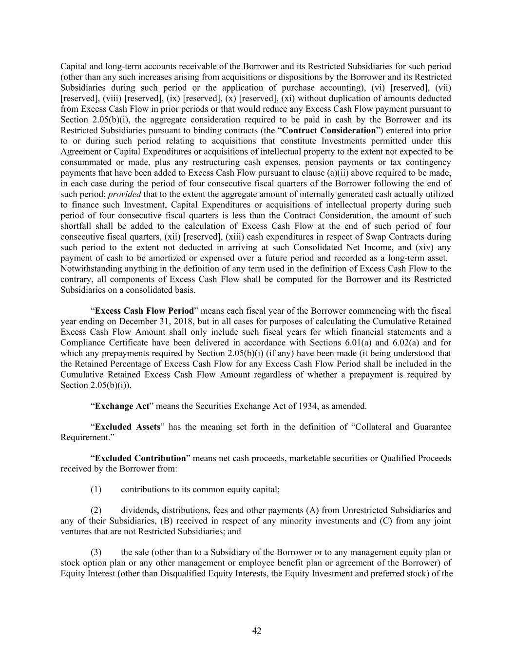 Capital and long-term accounts receivable of the Borrower and its Restricted Subsidiaries for such period(other than any such increases arising from acquisitions or dispositions by the Borrower and its RestrictedSubsidiaries during such period or the application of purchase accounting), (vi) [reserved], (vii)[reserved], (viii) [reserved], (ix) [reserved], (x) [reserved], (xi) without duplication of amounts deductedfrom Excess Cash Flow in prior periods or that would reduce any Excess Cash Flow payment pursuant toSection 2.05(b)(i), the aggregate consideration required to be paid in cash by the Borrower and itsRestricted Subsidiaries pursuant to binding contracts (the “Contract Consideration”) entered into priorto or during such period relating to acquisitions that constitute Investments permitted under thisAgreement or Capital Expenditures or acquisitions of intellectual property to the extent not expected to beconsummated or made, plus any restructuring cash expenses, pension payments or tax contingencypayments that have been added to Excess Cash Flow pursuant to clause (a)(ii) above required to be made,in each case during the period of four consecutive fiscal quarters of the Borrower following the end ofsuch period; provided that to the extent the aggregate amount of internally generated cash actually utilizedto finance such Investment, Capital Expenditures or acquisitions of intellectual property during suchperiod of four consecutive fiscal quarters is less than the Contract Consideration, the amount of suchshortfall shall be added to the calculation of Excess Cash Flow at the end of such period of fourconsecutive fiscal quarters, (xii) [reserved], (xiii) cash expenditures in respect of Swap Contracts duringsuch period to the extent not deducted in arriving at such Consolidated Net Income, and (xiv) anypayment of cash to be amortized or expensed over a future period and recorded as a long-term asset.Notwithstanding anything in the definition of any term used in the definition of Excess Cash Flow to thecontrary, all components of Excess Cash Flow shall be computed for the Borrower and its RestrictedSubsidiaries on a consolidated basis.“Excess Cash Flow Period” means each fiscal year of the Borrower commencing with the fiscalyear ending on December 31, 2018, but in all cases for purposes of calculating the Cumulative RetainedExcess Cash Flow Amount shall only include such fiscal years for which financial statements and aCompliance Certificate have been delivered in accordance with Sections 6.01(a) and 6.02(a) and forwhich any prepayments required by Section 2.05(b)(i) (if any) have been made (it being understood thatthe Retained Percentage of Excess Cash Flow for any Excess Cash Flow Period shall be included in theCumulative Retained Excess Cash Flow Amount regardless of whether a prepayment is required bySection 2.05(b)(i)).“Exchange Act” means the Securities Exchange Act of 1934, as amended.“Excluded Assets” has the meaning set forth in the definition of “Collateral and GuaranteeRequirement.”“Excluded Contribution” means net cash proceeds, marketable securities or Qualified Proceedsreceived by the Borrower from:(1) contributions to its common equity capital;(2) dividends, distributions, fees and other payments (A) from Unrestricted Subsidiaries andany of their Subsidiaries, (B) received in respect of any minority investments and (C) from any jointventures that are not Restricted Subsidiaries; and(3) the sale (other than to a Subsidiary of the Borrower or to any management equity plan orstock option plan or any other management or employee benefit plan or agreement of the Borrower) ofEquity Interest (other than Disqualified Equity Interests, the Equity Investment and preferred stock) of the42