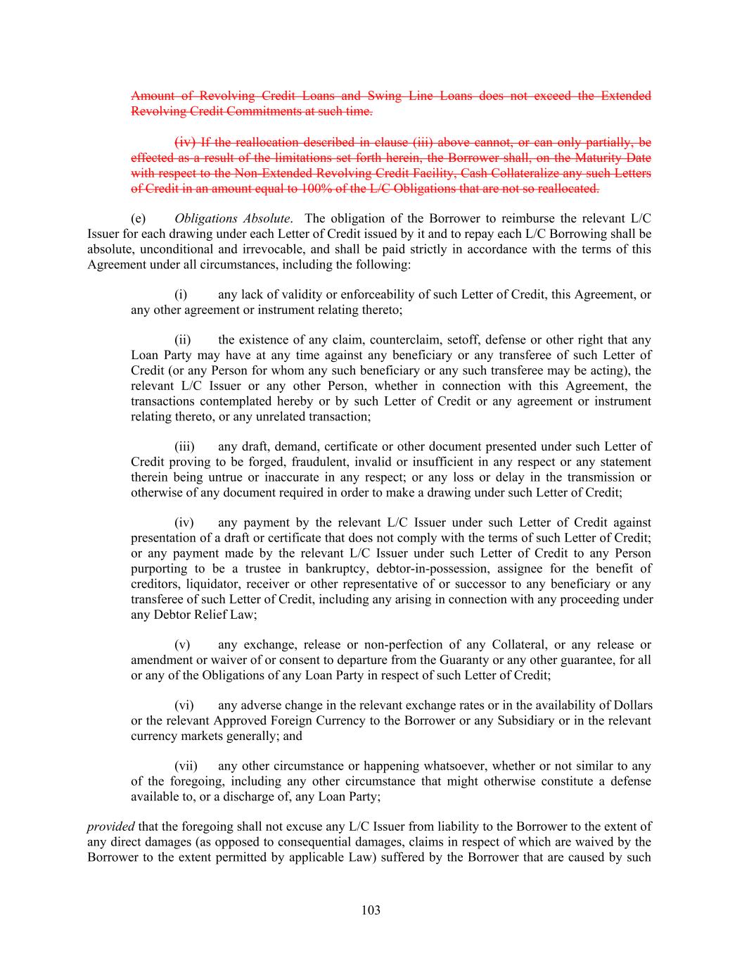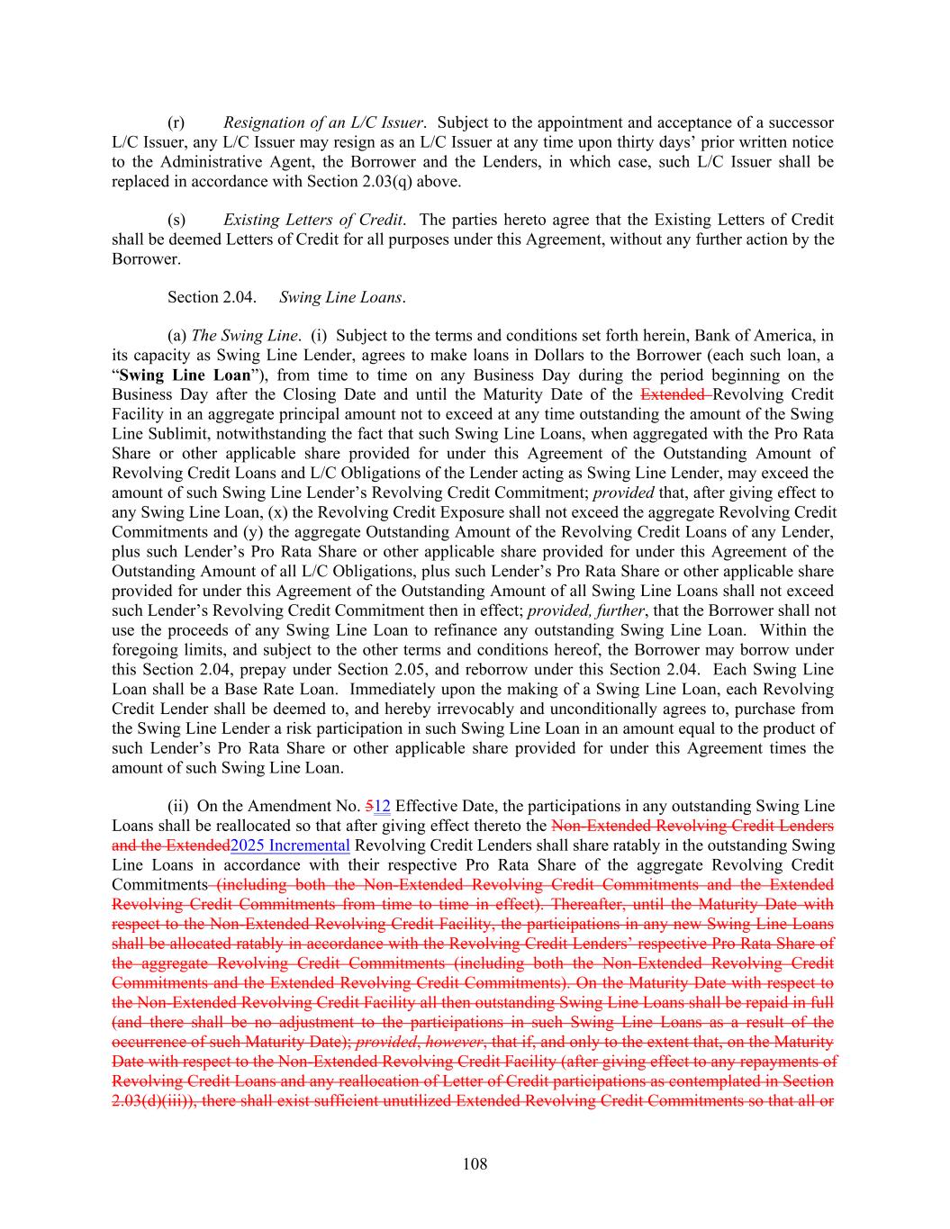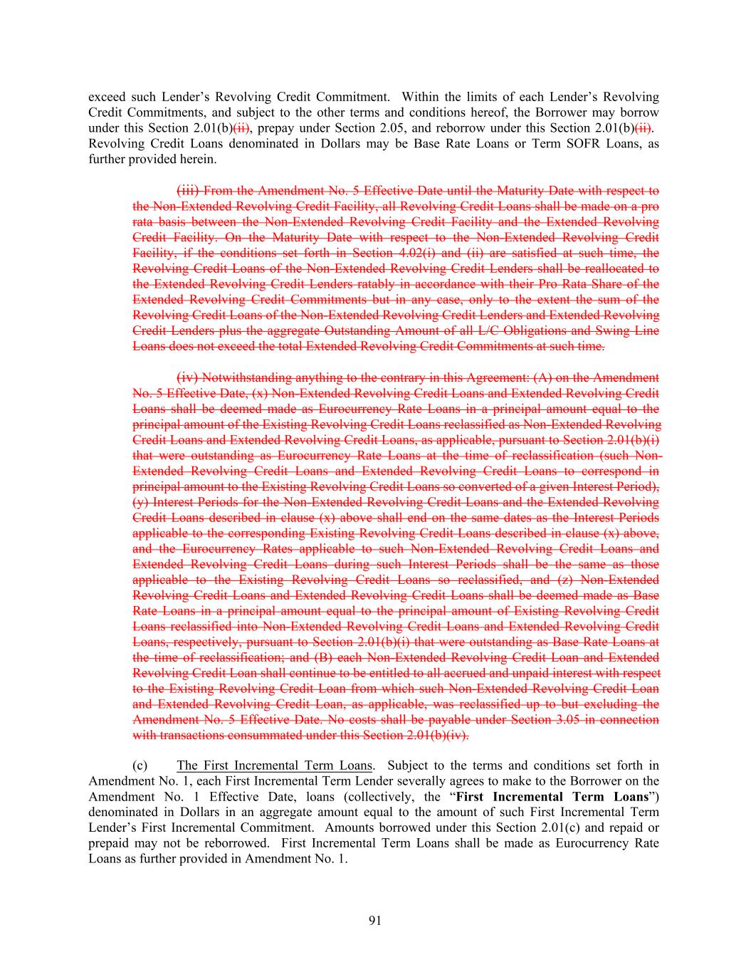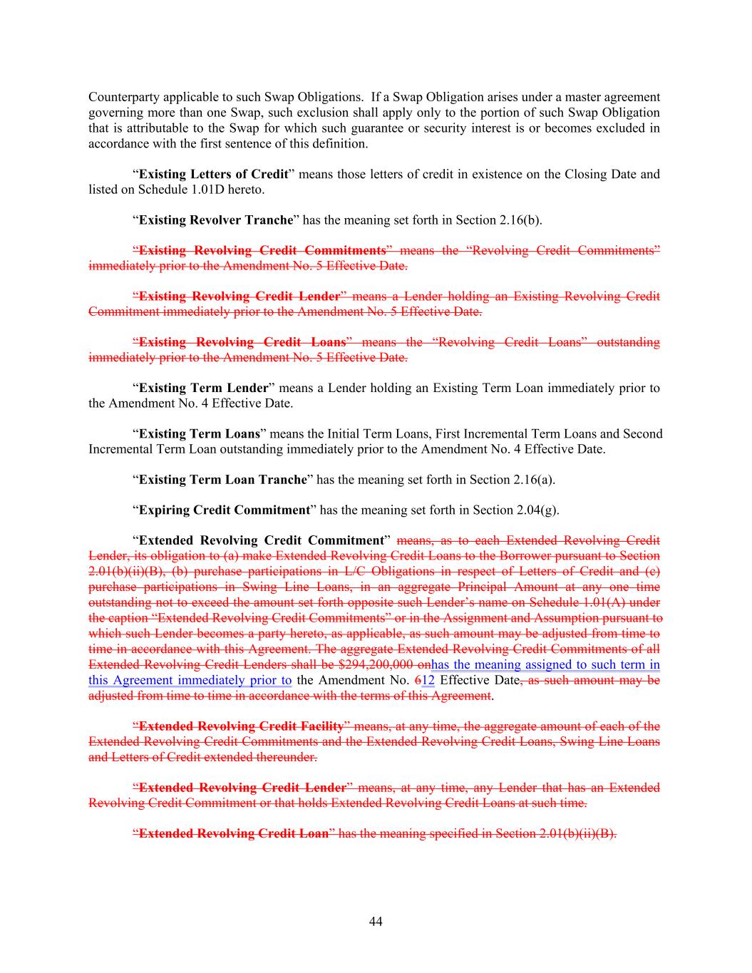 Counterparty applicable to such Swap Obligations. If a Swap Obligation arises under a master agreementgoverning more than one Swap, such exclusion shall apply only to the portion of such Swap Obligationthat is attributable to the Swap for which such guarantee or security interest is or becomes excluded inaccordance with the first sentence of this definition.“Existing Letters of Credit” means those letters of credit in existence on the Closing Date andlisted on Schedule 1.01D hereto.“Existing Revolver Tranche” has the meaning set forth in Section 2.16(b).“Existing Revolving Credit Commitments” means the “Revolving Credit Commitments”immediately prior to the Amendment No. 5 Effective Date.“Existing Revolving Credit Lender” means a Lender holding an Existing Revolving CreditCommitment immediately prior to the Amendment No. 5 Effective Date.“Existing Revolving Credit Loans” means the “Revolving Credit Loans” outstandingimmediately prior to the Amendment No. 5 Effective Date.“Existing Term Lender” means a Lender holding an Existing Term Loan immediately prior tothe Amendment No. 4 Effective Date.“Existing Term Loans” means the Initial Term Loans, First Incremental Term Loans and SecondIncremental Term Loan outstanding immediately prior to the Amendment No. 4 Effective Date.“Existing Term Loan Tranche” has the meaning set forth in Section 2.16(a).“Expiring Credit Commitment” has the meaning set forth in Section 2.04(g).“Extended Revolving Credit Commitment” means, as to each Extended Revolving CreditLender, its obligation to (a) make Extended Revolving Credit Loans to the Borrower pursuant to Section2.01(b)(ii)(B), (b) purchase participations in L/C Obligations in respect of Letters of Credit and (c)purchase participations in Swing Line Loans, in an aggregate Principal Amount at any one timeoutstanding not to exceed the amount set forth opposite such Lender’s name on Schedule 1.01(A) underthe caption “Extended Revolving Credit Commitments” or in the Assignment and Assumption pursuant towhich such Lender becomes a party hereto, as applicable, as such amount may be adjusted from time totime in accordance with this Agreement. The aggregate Extended Revolving Credit Commitments of allExtended Revolving Credit Lenders shall be $294,200,000 onhas the meaning assigned to such term inthis Agreement immediately prior to the Amendment No. 612 Effective Date, as such amount may beadjusted from time to time in accordance with the terms of this Agreement.“Extended Revolving Credit Facility” means, at any time, the aggregate amount of each of theExtended Revolving Credit Commitments and the Extended Revolving Credit Loans, Swing Line Loansand Letters of Credit extended thereunder.“Extended Revolving Credit Lender” means, at any time, any Lender that has an ExtendedRevolving Credit Commitment or that holds Extended Revolving Credit Loans at such time.“Extended Revolving Credit Loan” has the meaning specified in Section 2.01(b)(ii)(B).44