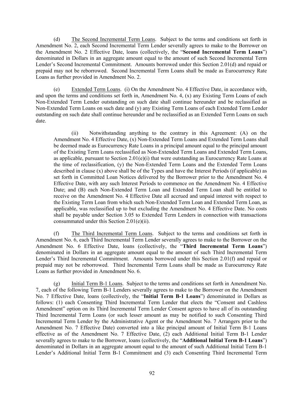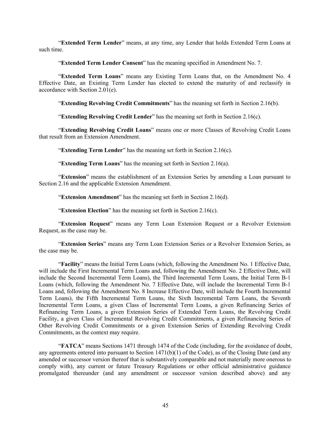 “Extended Term Lender” means, at any time, any Lender that holds Extended Term Loans atsuch time.“Extended Term Lender Consent” has the meaning specified in Amendment No. 7.“Extended Term Loans” means any Existing Term Loans that, on the Amendment No. 4Effective Date, an Existing Term Lender has elected to extend the maturity of and reclassify inaccordance with Section 2.01(e).“Extending Revolving Credit Commitments” has the meaning set forth in Section 2.16(b).“Extending Revolving Credit Lender” has the meaning set forth in Section 2.16(c).“Extending Revolving Credit Loans” means one or more Classes of Revolving Credit Loansthat result from an Extension Amendment.“Extending Term Lender” has the meaning set forth in Section 2.16(c).“Extending Term Loans” has the meaning set forth in Section 2.16(a).“Extension” means the establishment of an Extension Series by amending a Loan pursuant to Section 2.16 and the applicable Extension Amendment.“Extension Amendment” has the meaning set forth in Section 2.16(d).“Extension Election” has the meaning set forth in Section 2.16(c).“Extension Request” means any Term Loan Extension Request or a Revolver ExtensionRequest, as the case may be.“Extension Series” means any Term Loan Extension Series or a Revolver Extension Series, asthe case may be.“Facility” means the Initial Term Loans (which, following the Amendment No. 1 Effective Date,will include the First Incremental Term Loans and, following the Amendment No. 2 Effective Date, willinclude the Second Incremental Term Loans), the Third Incremental Term Loans, the Initial Term B-1Loans (which, following the Amendment No. 7 Effective Date, will include the Incremental Term B-1Loans and, following the Amendment No. 8 Increase Effective Date, will include the Fourth IncrementalTerm Loans), the Fifth Incremental Term Loans, the Sixth Incremental Term Loans, the SeventhIncremental Term Loans, a given Class of Incremental Term Loans, a given Refinancing Series ofRefinancing Term Loans, a given Extension Series of Extended Term Loans, the Revolving CreditFacility, a given Class of Incremental Revolving Credit Commitments, a given Refinancing Series ofOther Revolving Credit Commitments or a given Extension Series of Extending Revolving CreditCommitments, as the context may require.“FATCA” means Sections 1471 through 1474 of the Code (including, for the avoidance of doubt,any agreements entered into pursuant to Section 1471(b)(1) of the Code), as of the Closing Date (and anyamended or successor version thereof that is substantively comparable and not materially more onerous tocomply with), any current or future Treasury Regulations or other official administrative guidancepromulgated thereunder (and any amendment or successor version described above) and any45