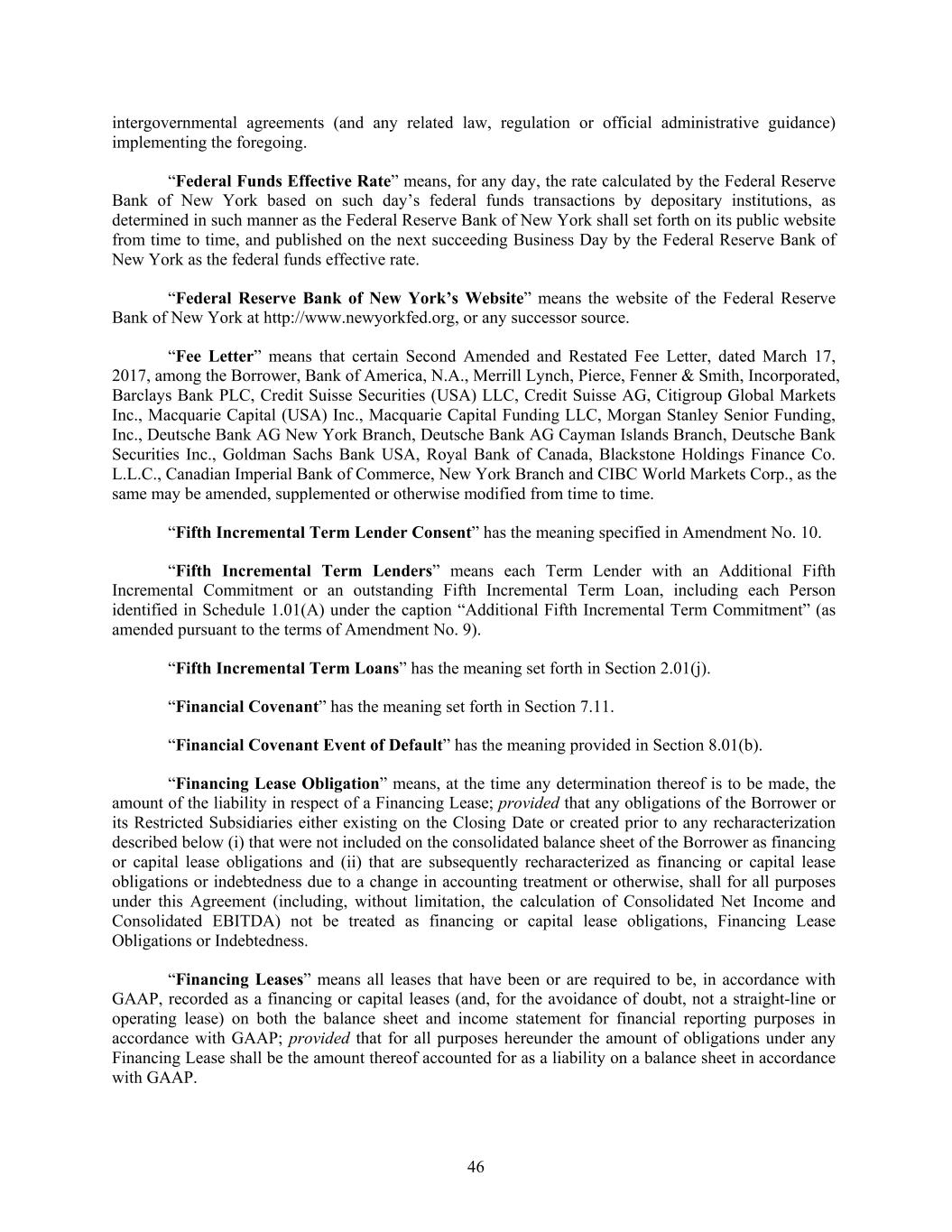 intergovernmental agreements (and any related law, regulation or official administrative guidance)implementing the foregoing.“Federal Funds Effective Rate” means, for any day, the rate calculated by the Federal ReserveBank of New York based on such day’s federal funds transactions by depositary institutions, asdetermined in such manner as the Federal Reserve Bank of New York shall set forth on its public websitefrom time to time, and published on the next succeeding Business Day by the Federal Reserve Bank ofNew York as the federal funds effective rate.“Federal Reserve Bank of New York’s Website” means the website of the Federal ReserveBank of New York at http://www.newyorkfed.org, or any successor source.“Fee Letter” means that certain Second Amended and Restated Fee Letter, dated March 17,2017, among the Borrower, Bank of America, N.A., Merrill Lynch, Pierce, Fenner & Smith, Incorporated,Barclays Bank PLC, Credit Suisse Securities (USA) LLC, Credit Suisse AG, Citigroup Global MarketsInc., Macquarie Capital (USA) Inc., Macquarie Capital Funding LLC, Morgan Stanley Senior Funding,Inc., Deutsche Bank AG New York Branch, Deutsche Bank AG Cayman Islands Branch, Deutsche BankSecurities Inc., Goldman Sachs Bank USA, Royal Bank of Canada, Blackstone Holdings Finance Co.L.L.C., Canadian Imperial Bank of Commerce, New York Branch and CIBC World Markets Corp., as thesame may be amended, supplemented or otherwise modified from time to time.“Fifth Incremental Term Lender Consent” has the meaning specified in Amendment No. 10.“Fifth Incremental Term Lenders” means each Term Lender with an Additional FifthIncremental Commitment or an outstanding Fifth Incremental Term Loan, including each Personidentified in Schedule 1.01(A) under the caption “Additional Fifth Incremental Term Commitment” (asamended pursuant to the terms of Amendment No. 9).“Fifth Incremental Term Loans” has the meaning set forth in Section 2.01(j).“Financial Covenant” has the meaning set forth in Section 7.11.“Financial Covenant Event of Default” has the meaning provided in Section 8.01(b).“Financing Lease Obligation” means, at the time any determination thereof is to be made, theamount of the liability in respect of a Financing Lease; provided that any obligations of the Borrower orits Restricted Subsidiaries either existing on the Closing Date or created prior to any recharacterizationdescribed below (i) that were not included on the consolidated balance sheet of the Borrower as financingor capital lease obligations and (ii) that are subsequently recharacterized as financing or capital leaseobligations or indebtedness due to a change in accounting treatment or otherwise, shall for all purposesunder this Agreement (including, without limitation, the calculation of Consolidated Net Income andConsolidated EBITDA) not be treated as financing or capital lease obligations, Financing LeaseObligations or Indebtedness.“Financing Leases” means all leases that have been or are required to be, in accordance withGAAP, recorded as a financing or capital leases (and, for the avoidance of doubt, not a straight-line oroperating lease) on both the balance sheet and income statement for financial reporting purposes inaccordance with GAAP; provided that for all purposes hereunder the amount of obligations under anyFinancing Lease shall be the amount thereof accounted for as a liability on a balance sheet in accordancewith GAAP. 46