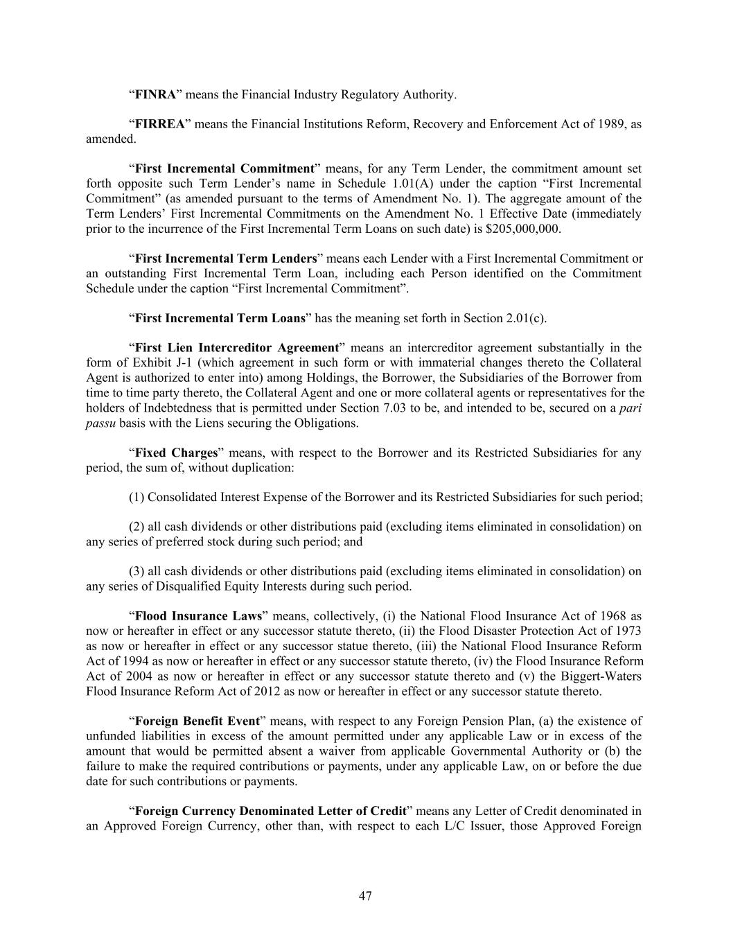 “FINRA” means the Financial Industry Regulatory Authority.“FIRREA” means the Financial Institutions Reform, Recovery and Enforcement Act of 1989, asamended.“First Incremental Commitment” means, for any Term Lender, the commitment amount setforth opposite such Term Lender’s name in Schedule 1.01(A) under the caption “First IncrementalCommitment” (as amended pursuant to the terms of Amendment No. 1). The aggregate amount of theTerm Lenders’ First Incremental Commitments on the Amendment No. 1 Effective Date (immediatelyprior to the incurrence of the First Incremental Term Loans on such date) is $205,000,000.“First Incremental Term Lenders” means each Lender with a First Incremental Commitment oran outstanding First Incremental Term Loan, including each Person identified on the CommitmentSchedule under the caption “First Incremental Commitment”.“First Incremental Term Loans” has the meaning set forth in Section 2.01(c).“First Lien Intercreditor Agreement” means an intercreditor agreement substantially in theform of Exhibit J-1 (which agreement in such form or with immaterial changes thereto the CollateralAgent is authorized to enter into) among Holdings, the Borrower, the Subsidiaries of the Borrower fromtime to time party thereto, the Collateral Agent and one or more collateral agents or representatives for theholders of Indebtedness that is permitted under Section 7.03 to be, and intended to be, secured on a paripassu basis with the Liens securing the Obligations.“Fixed Charges” means, with respect to the Borrower and its Restricted Subsidiaries for anyperiod, the sum of, without duplication:(1) Consolidated Interest Expense of the Borrower and its Restricted Subsidiaries for such period;(2) all cash dividends or other distributions paid (excluding items eliminated in consolidation) onany series of preferred stock during such period; and(3) all cash dividends or other distributions paid (excluding items eliminated in consolidation) onany series of Disqualified Equity Interests during such period.“Flood Insurance Laws” means, collectively, (i) the National Flood Insurance Act of 1968 asnow or hereafter in effect or any successor statute thereto, (ii) the Flood Disaster Protection Act of 1973as now or hereafter in effect or any successor statue thereto, (iii) the National Flood Insurance ReformAct of 1994 as now or hereafter in effect or any successor statute thereto, (iv) the Flood Insurance ReformAct of 2004 as now or hereafter in effect or any successor statute thereto and (v) the Biggert-WatersFlood Insurance Reform Act of 2012 as now or hereafter in effect or any successor statute thereto.“Foreign Benefit Event” means, with respect to any Foreign Pension Plan, (a) the existence ofunfunded liabilities in excess of the amount permitted under any applicable Law or in excess of theamount that would be permitted absent a waiver from applicable Governmental Authority or (b) thefailure to make the required contributions or payments, under any applicable Law, on or before the duedate for such contributions or payments.“Foreign Currency Denominated Letter of Credit” means any Letter of Credit denominated inan Approved Foreign Currency, other than, with respect to each L/C Issuer, those Approved Foreign47