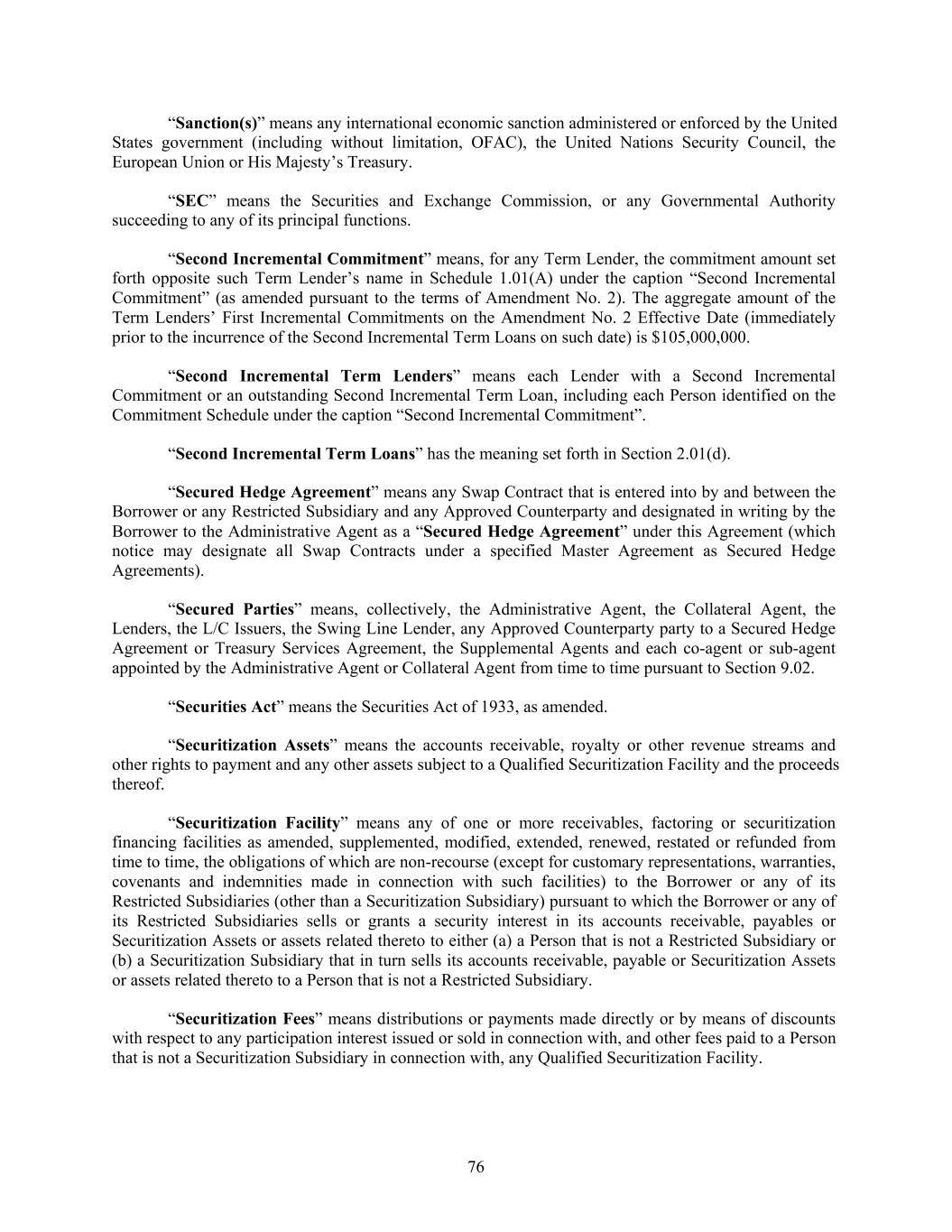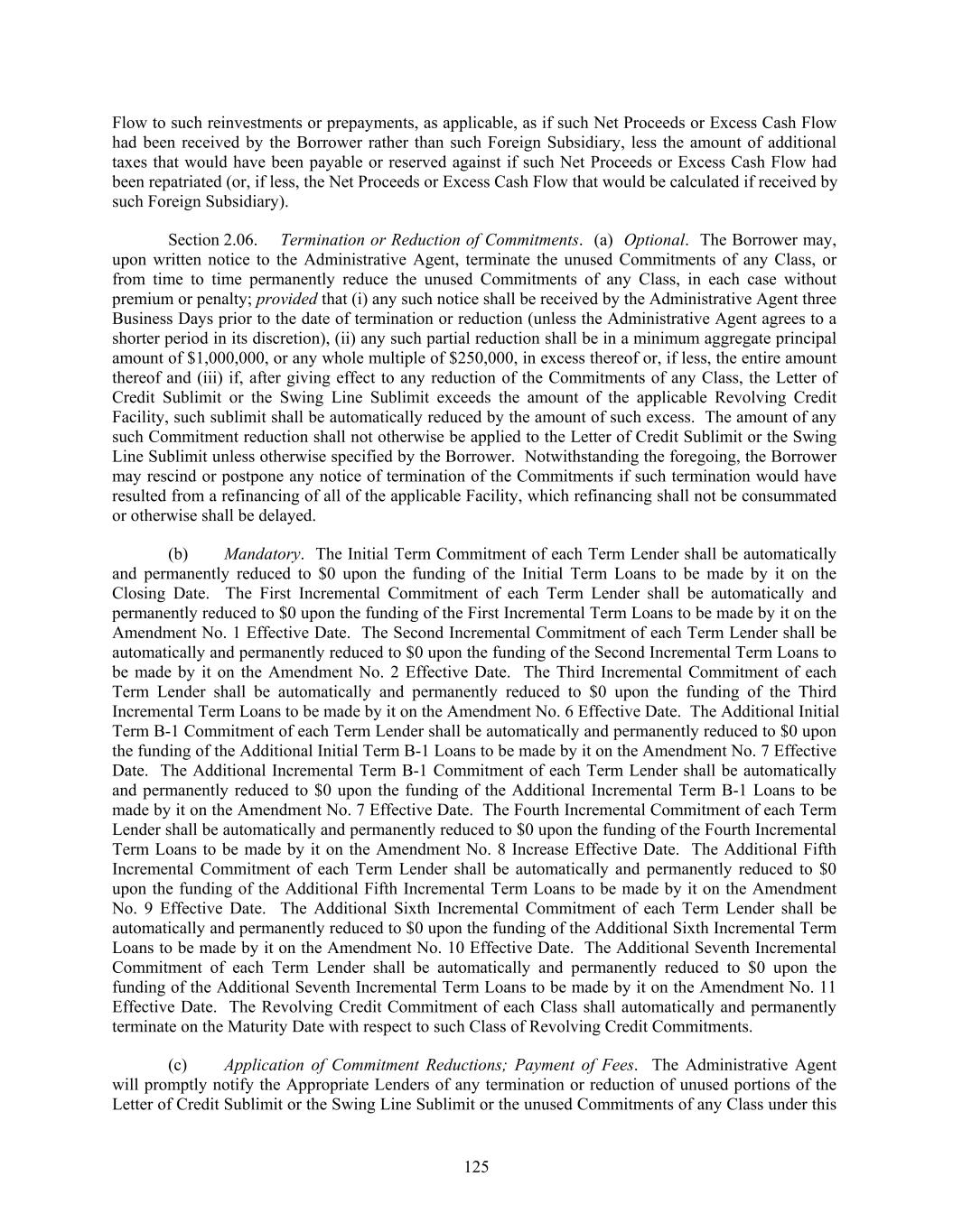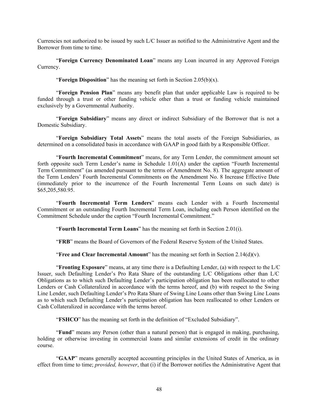 Currencies not authorized to be issued by such L/C Issuer as notified to the Administrative Agent and theBorrower from time to time.“Foreign Currency Denominated Loan” means any Loan incurred in any Approved ForeignCurrency.“Foreign Disposition” has the meaning set forth in Section 2.05(b)(x).“Foreign Pension Plan” means any benefit plan that under applicable Law is required to befunded through a trust or other funding vehicle other than a trust or funding vehicle maintainedexclusively by a Governmental Authority.“Foreign Subsidiary” means any direct or indirect Subsidiary of the Borrower that is not aDomestic Subsidiary.“Foreign Subsidiary Total Assets” means the total assets of the Foreign Subsidiaries, asdetermined on a consolidated basis in accordance with GAAP in good faith by a Responsible Officer.“Fourth Incremental Commitment” means, for any Term Lender, the commitment amount setforth opposite such Term Lender’s name in Schedule 1.01(A) under the caption “Fourth IncrementalTerm Commitment” (as amended pursuant to the terms of Amendment No. 8). The aggregate amount ofthe Term Lenders’ Fourth Incremental Commitments on the Amendment No. 8 Increase Effective Date(immediately prior to the incurrence of the Fourth Incremental Term Loans on such date) is$65,205,580.95.“Fourth Incremental Term Lenders” means each Lender with a Fourth IncrementalCommitment or an outstanding Fourth Incremental Term Loan, including each Person identified on theCommitment Schedule under the caption “Fourth Incremental Commitment.”“Fourth Incremental Term Loans” has the meaning set forth in Section 2.01(i).“FRB” means the Board of Governors of the Federal Reserve System of the United States.“Free and Clear Incremental Amount” has the meaning set forth in Section 2.14(d)(v).“Fronting Exposure” means, at any time there is a Defaulting Lender, (a) with respect to the L/CIssuer, such Defaulting Lender’s Pro Rata Share of the outstanding L/C Obligations other than L/CObligations as to which such Defaulting Lender’s participation obligation has been reallocated to otherLenders or Cash Collateralized in accordance with the terms hereof, and (b) with respect to the SwingLine Lender, such Defaulting Lender’s Pro Rata Share of Swing Line Loans other than Swing Line Loansas to which such Defaulting Lender’s participation obligation has been reallocated to other Lenders orCash Collateralized in accordance with the terms hereof.“FSHCO” has the meaning set forth in the definition of “Excluded Subsidiary”.“Fund” means any Person (other than a natural person) that is engaged in making, purchasing,holding or otherwise investing in commercial loans and similar extensions of credit in the ordinarycourse. “GAAP” means generally accepted accounting principles in the United States of America, as ineffect from time to time; provided, however, that (i) if the Borrower notifies the Administrative Agent that48