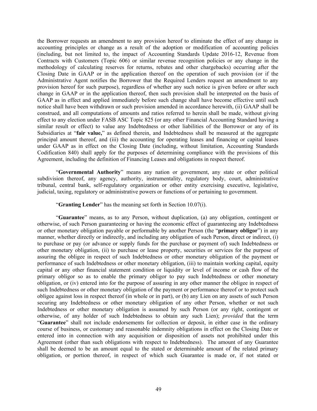 the Borrower requests an amendment to any provision hereof to eliminate the effect of any change inaccounting principles or change as a result of the adoption or modification of accounting policies(including, but not limited to, the impact of Accounting Standards Update 2016-12, Revenue fromContracts with Customers (Topic 606) or similar revenue recognition policies or any change in themethodology of calculating reserves for returns, rebates and other chargebacks) occurring after theClosing Date in GAAP or in the application thereof on the operation of such provision (or if theAdministrative Agent notifies the Borrower that the Required Lenders request an amendment to anyprovision hereof for such purpose), regardless of whether any such notice is given before or after suchchange in GAAP or in the application thereof, then such provision shall be interpreted on the basis ofGAAP as in effect and applied immediately before such change shall have become effective until suchnotice shall have been withdrawn or such provision amended in accordance herewith, (ii) GAAP shall beconstrued, and all computations of amounts and ratios referred to herein shall be made, without givingeffect to any election under FASB ASC Topic 825 (or any other Financial Accounting Standard having asimilar result or effect) to value any Indebtedness or other liabilities of the Borrower or any of itsSubsidiaries at “fair value,” as defined therein, and Indebtedness shall be measured at the aggregateprincipal amount thereof, and (iii) the accounting for operating leases and financing or capital leasesunder GAAP as in effect on the Closing Date (including, without limitation, Accounting StandardsCodification 840) shall apply for the purposes of determining compliance with the provisions of thisAgreement, including the definition of Financing Leases and obligations in respect thereof.“Governmental Authority” means any nation or government, any state or other politicalsubdivision thereof, any agency, authority, instrumentality, regulatory body, court, administrativetribunal, central bank, self-regulatory organization or other entity exercising executive, legislative,judicial, taxing, regulatory or administrative powers or functions of or pertaining to government.“Granting Lender” has the meaning set forth in Section 10.07(i).“Guarantee” means, as to any Person, without duplication, (a) any obligation, contingent orotherwise, of such Person guaranteeing or having the economic effect of guaranteeing any Indebtednessor other monetary obligation payable or performable by another Person (the “primary obligor”) in anymanner, whether directly or indirectly, and including any obligation of such Person, direct or indirect, (i)to purchase or pay (or advance or supply funds for the purchase or payment of) such Indebtedness orother monetary obligation, (ii) to purchase or lease property, securities or services for the purpose ofassuring the obligee in respect of such Indebtedness or other monetary obligation of the payment orperformance of such Indebtedness or other monetary obligation, (iii) to maintain working capital, equitycapital or any other financial statement condition or liquidity or level of income or cash flow of theprimary obligor so as to enable the primary obligor to pay such Indebtedness or other monetaryobligation, or (iv) entered into for the purpose of assuring in any other manner the obligee in respect ofsuch Indebtedness or other monetary obligation of the payment or performance thereof or to protect suchobligee against loss in respect thereof (in whole or in part), or (b) any Lien on any assets of such Personsecuring any Indebtedness or other monetary obligation of any other Person, whether or not suchIndebtedness or other monetary obligation is assumed by such Person (or any right, contingent orotherwise, of any holder of such Indebtedness to obtain any such Lien); provided that the term“Guarantee” shall not include endorsements for collection or deposit, in either case in the ordinarycourse of business, or customary and reasonable indemnity obligations in effect on the Closing Date orentered into in connection with any acquisition or disposition of assets not prohibited under thisAgreement (other than such obligations with respect to Indebtedness). The amount of any Guaranteeshall be deemed to be an amount equal to the stated or determinable amount of the related primaryobligation, or portion thereof, in respect of which such Guarantee is made or, if not stated or49