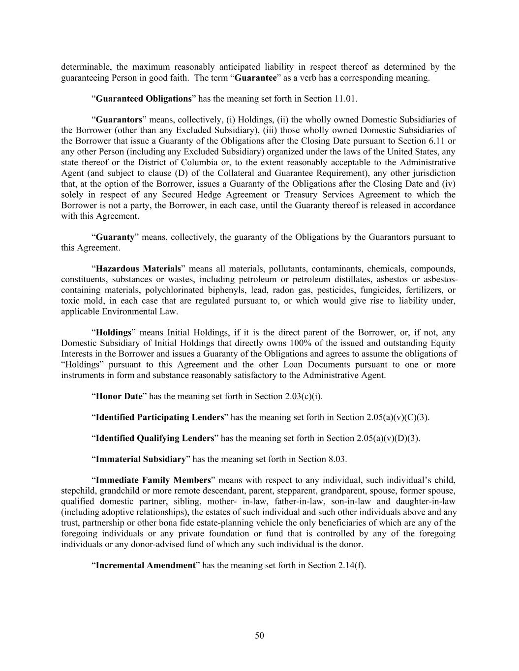 determinable, the maximum reasonably anticipated liability in respect thereof as determined by theguaranteeing Person in good faith. The term “Guarantee” as a verb has a corresponding meaning.“Guaranteed Obligations” has the meaning set forth in Section 11.01.“Guarantors” means, collectively, (i) Holdings, (ii) the wholly owned Domestic Subsidiaries ofthe Borrower (other than any Excluded Subsidiary), (iii) those wholly owned Domestic Subsidiaries ofthe Borrower that issue a Guaranty of the Obligations after the Closing Date pursuant to Section 6.11 orany other Person (including any Excluded Subsidiary) organized under the laws of the United States, anystate thereof or the District of Columbia or, to the extent reasonably acceptable to the AdministrativeAgent (and subject to clause (D) of the Collateral and Guarantee Requirement), any other jurisdictionthat, at the option of the Borrower, issues a Guaranty of the Obligations after the Closing Date and (iv)solely in respect of any Secured Hedge Agreement or Treasury Services Agreement to which theBorrower is not a party, the Borrower, in each case, until the Guaranty thereof is released in accordancewith this Agreement.“Guaranty” means, collectively, the guaranty of the Obligations by the Guarantors pursuant tothis Agreement.“Hazardous Materials” means all materials, pollutants, contaminants, chemicals, compounds,constituents, substances or wastes, including petroleum or petroleum distillates, asbestos or asbestos-containing materials, polychlorinated biphenyls, lead, radon gas, pesticides, fungicides, fertilizers, ortoxic mold, in each case that are regulated pursuant to, or which would give rise to liability under,applicable Environmental Law.“Holdings” means Initial Holdings, if it is the direct parent of the Borrower, or, if not, anyDomestic Subsidiary of Initial Holdings that directly owns 100% of the issued and outstanding EquityInterests in the Borrower and issues a Guaranty of the Obligations and agrees to assume the obligations of“Holdings” pursuant to this Agreement and the other Loan Documents pursuant to one or moreinstruments in form and substance reasonably satisfactory to the Administrative Agent.“Honor Date” has the meaning set forth in Section 2.03(c)(i).“Identified Participating Lenders” has the meaning set forth in Section 2.05(a)(v)(C)(3).“Identified Qualifying Lenders” has the meaning set forth in Section 2.05(a)(v)(D)(3).“Immaterial Subsidiary” has the meaning set forth in Section 8.03.“Immediate Family Members” means with respect to any individual, such individual’s child,stepchild, grandchild or more remote descendant, parent, stepparent, grandparent, spouse, former spouse,qualified domestic partner, sibling, mother- in-law, father-in-law, son-in-law and daughter-in-law(including adoptive relationships), the estates of such individual and such other individuals above and anytrust, partnership or other bona fide estate-planning vehicle the only beneficiaries of which are any of theforegoing individuals or any private foundation or fund that is controlled by any of the foregoingindividuals or any donor-advised fund of which any such individual is the donor.“Incremental Amendment” has the meaning set forth in Section 2.14(f).50