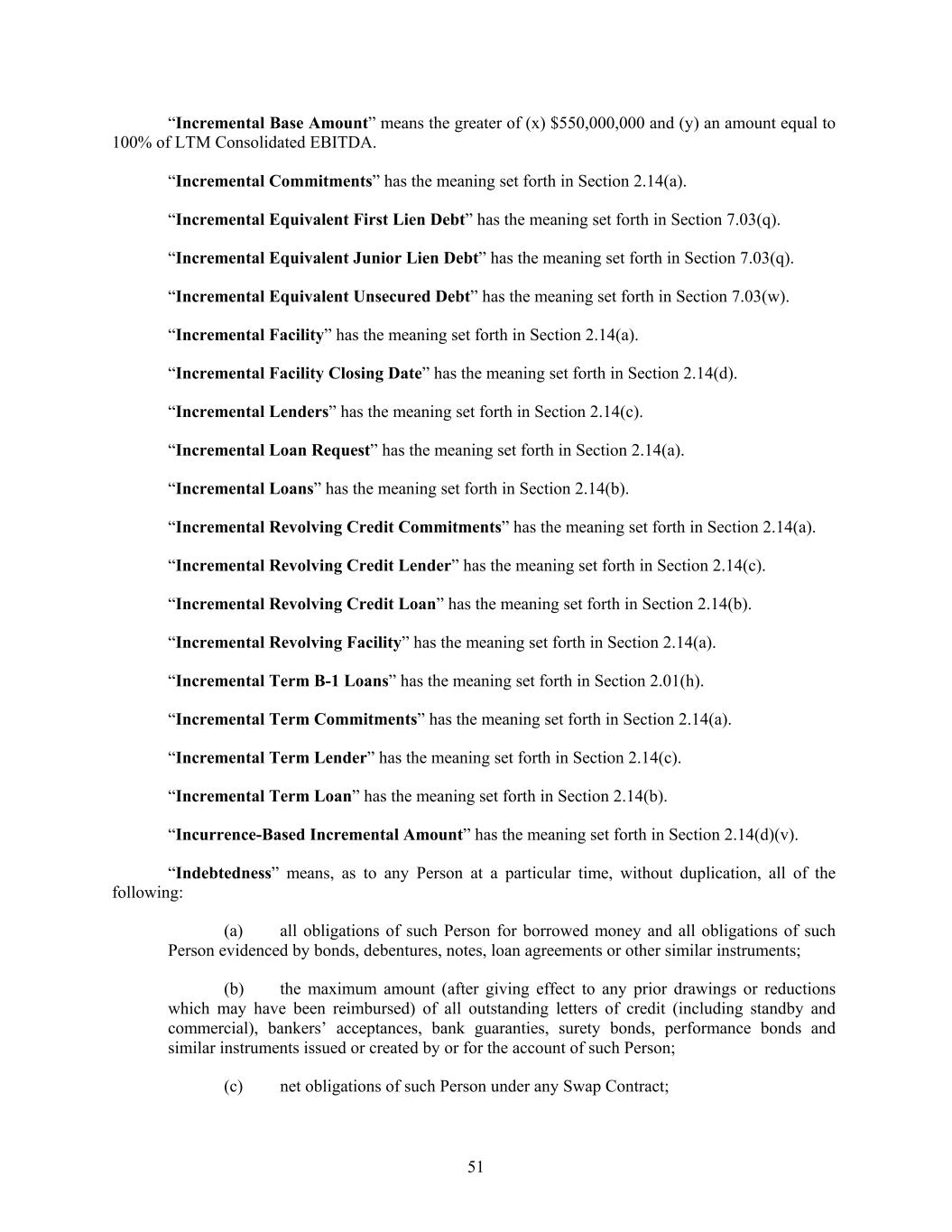 “Incremental Base Amount” means the greater of (x) $550,000,000 and (y) an amount equal to100% of LTM Consolidated EBITDA.“Incremental Commitments” has the meaning set forth in Section 2.14(a).“Incremental Equivalent First Lien Debt” has the meaning set forth in Section 7.03(q).“Incremental Equivalent Junior Lien Debt” has the meaning set forth in Section 7.03(q).“Incremental Equivalent Unsecured Debt” has the meaning set forth in Section 7.03(w).“Incremental Facility” has the meaning set forth in Section 2.14(a).“Incremental Facility Closing Date” has the meaning set forth in Section 2.14(d).“Incremental Lenders” has the meaning set forth in Section 2.14(c).“Incremental Loan Request” has the meaning set forth in Section 2.14(a).“Incremental Loans” has the meaning set forth in Section 2.14(b).“Incremental Revolving Credit Commitments” has the meaning set forth in Section 2.14(a).“Incremental Revolving Credit Lender” has the meaning set forth in Section 2.14(c).“Incremental Revolving Credit Loan” has the meaning set forth in Section 2.14(b).“Incremental Revolving Facility” has the meaning set forth in Section 2.14(a).“Incremental Term B-1 Loans” has the meaning set forth in Section 2.01(h).“Incremental Term Commitments” has the meaning set forth in Section 2.14(a).“Incremental Term Lender” has the meaning set forth in Section 2.14(c).“Incremental Term Loan” has the meaning set forth in Section 2.14(b).“Incurrence-Based Incremental Amount” has the meaning set forth in Section 2.14(d)(v).“Indebtedness” means, as to any Person at a particular time, without duplication, all of thefollowing: (a) all obligations of such Person for borrowed money and all obligations of suchPerson evidenced by bonds, debentures, notes, loan agreements or other similar instruments;(b) the maximum amount (after giving effect to any prior drawings or reductionswhich may have been reimbursed) of all outstanding letters of credit (including standby andcommercial), bankers’ acceptances, bank guaranties, surety bonds, performance bonds andsimilar instruments issued or created by or for the account of such Person;(c) net obligations of such Person under any Swap Contract;51
