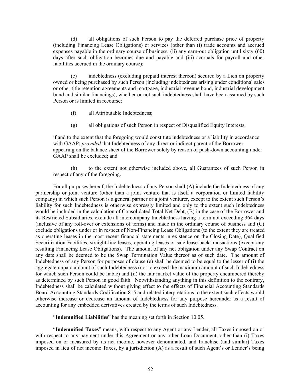 (d) all obligations of such Person to pay the deferred purchase price of property(including Financing Lease Obligations) or services (other than (i) trade accounts and accruedexpenses payable in the ordinary course of business, (ii) any earn-out obligation until sixty (60)days after such obligation becomes due and payable and (iii) accruals for payroll and otherliabilities accrued in the ordinary course);(e) indebtedness (excluding prepaid interest thereon) secured by a Lien on propertyowned or being purchased by such Person (including indebtedness arising under conditional salesor other title retention agreements and mortgage, industrial revenue bond, industrial developmentbond and similar financings), whether or not such indebtedness shall have been assumed by suchPerson or is limited in recourse;(f) all Attributable Indebtedness;(g) all obligations of such Person in respect of Disqualified Equity Interests;if and to the extent that the foregoing would constitute indebtedness or a liability in accordancewith GAAP; provided that Indebtedness of any direct or indirect parent of the Borrowerappearing on the balance sheet of the Borrower solely by reason of push-down accounting underGAAP shall be excluded; and(h) to the extent not otherwise included above, all Guarantees of such Person inrespect of any of the foregoing.For all purposes hereof, the Indebtedness of any Person shall (A) include the Indebtedness of anypartnership or joint venture (other than a joint venture that is itself a corporation or limited liabilitycompany) in which such Person is a general partner or a joint venturer, except to the extent such Person’sliability for such Indebtedness is otherwise expressly limited and only to the extent such Indebtednesswould be included in the calculation of Consolidated Total Net Debt, (B) in the case of the Borrower andits Restricted Subsidiaries, exclude all intercompany Indebtedness having a term not exceeding 364 days(inclusive of any roll-over or extensions of terms) and made in the ordinary course of business and (C)exclude obligations under or in respect of Non-Financing Lease Obligations (to the extent they are treatedas operating leases in the most recent financial statements in existence on the Closing Date), QualifiedSecuritization Facilities, straight-line leases, operating leases or sale lease-back transactions (except anyresulting Financing Lease Obligations). The amount of any net obligation under any Swap Contract onany date shall be deemed to be the Swap Termination Value thereof as of such date. The amount ofIndebtedness of any Person for purposes of clause (e) shall be deemed to be equal to the lesser of (i) theaggregate unpaid amount of such Indebtedness (not to exceed the maximum amount of such Indebtednessfor which such Person could be liable) and (ii) the fair market value of the property encumbered therebyas determined by such Person in good faith. Notwithstanding anything in this definition to the contrary,Indebtedness shall be calculated without giving effect to the effects of Financial Accounting StandardsBoard Accounting Standards Codification 815 and related interpretations to the extent such effects wouldotherwise increase or decrease an amount of Indebtedness for any purpose hereunder as a result ofaccounting for any embedded derivatives created by the terms of such Indebtedness.“Indemnified Liabilities” has the meaning set forth in Section 10.05.“Indemnified Taxes” means, with respect to any Agent or any Lender, all Taxes imposed on orwith respect to any payment under this Agreement or any other Loan Document, other than (i) Taxesimposed on or measured by its net income, however denominated, and franchise (and similar) Taxesimposed in lieu of net income Taxes, by a jurisdiction (A) as a result of such Agent’s or Lender’s being52