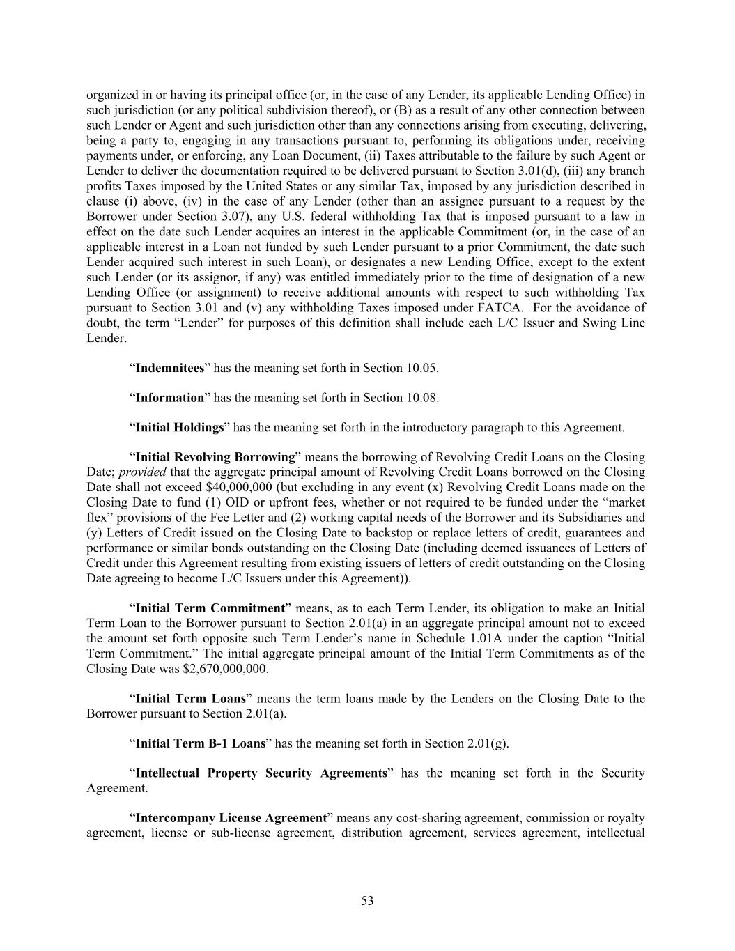 organized in or having its principal office (or, in the case of any Lender, its applicable Lending Office) insuch jurisdiction (or any political subdivision thereof), or (B) as a result of any other connection betweensuch Lender or Agent and such jurisdiction other than any connections arising from executing, delivering,being a party to, engaging in any transactions pursuant to, performing its obligations under, receivingpayments under, or enforcing, any Loan Document, (ii) Taxes attributable to the failure by such Agent orLender to deliver the documentation required to be delivered pursuant to Section 3.01(d), (iii) any branchprofits Taxes imposed by the United States or any similar Tax, imposed by any jurisdiction described inclause (i) above, (iv) in the case of any Lender (other than an assignee pursuant to a request by theBorrower under Section 3.07), any U.S. federal withholding Tax that is imposed pursuant to a law ineffect on the date such Lender acquires an interest in the applicable Commitment (or, in the case of anapplicable interest in a Loan not funded by such Lender pursuant to a prior Commitment, the date suchLender acquired such interest in such Loan), or designates a new Lending Office, except to the extentsuch Lender (or its assignor, if any) was entitled immediately prior to the time of designation of a newLending Office (or assignment) to receive additional amounts with respect to such withholding Taxpursuant to Section 3.01 and (v) any withholding Taxes imposed under FATCA. For the avoidance ofdoubt, the term “Lender” for purposes of this definition shall include each L/C Issuer and Swing LineLender. “Indemnitees” has the meaning set forth in Section 10.05.“Information” has the meaning set forth in Section 10.08.“Initial Holdings” has the meaning set forth in the introductory paragraph to this Agreement.“Initial Revolving Borrowing” means the borrowing of Revolving Credit Loans on the ClosingDate; provided that the aggregate principal amount of Revolving Credit Loans borrowed on the ClosingDate shall not exceed $40,000,000 (but excluding in any event (x) Revolving Credit Loans made on theClosing Date to fund (1) OID or upfront fees, whether or not required to be funded under the “marketflex” provisions of the Fee Letter and (2) working capital needs of the Borrower and its Subsidiaries and(y) Letters of Credit issued on the Closing Date to backstop or replace letters of credit, guarantees andperformance or similar bonds outstanding on the Closing Date (including deemed issuances of Letters ofCredit under this Agreement resulting from existing issuers of letters of credit outstanding on the ClosingDate agreeing to become L/C Issuers under this Agreement)).“Initial Term Commitment” means, as to each Term Lender, its obligation to make an InitialTerm Loan to the Borrower pursuant to Section 2.01(a) in an aggregate principal amount not to exceedthe amount set forth opposite such Term Lender’s name in Schedule 1.01A under the caption “InitialTerm Commitment.” The initial aggregate principal amount of the Initial Term Commitments as of theClosing Date was $2,670,000,000.“Initial Term Loans” means the term loans made by the Lenders on the Closing Date to theBorrower pursuant to Section 2.01(a).“Initial Term B-1 Loans” has the meaning set forth in Section 2.01(g).“Intellectual Property Security Agreements” has the meaning set forth in the SecurityAgreement.“Intercompany License Agreement” means any cost-sharing agreement, commission or royaltyagreement, license or sub-license agreement, distribution agreement, services agreement, intellectual53