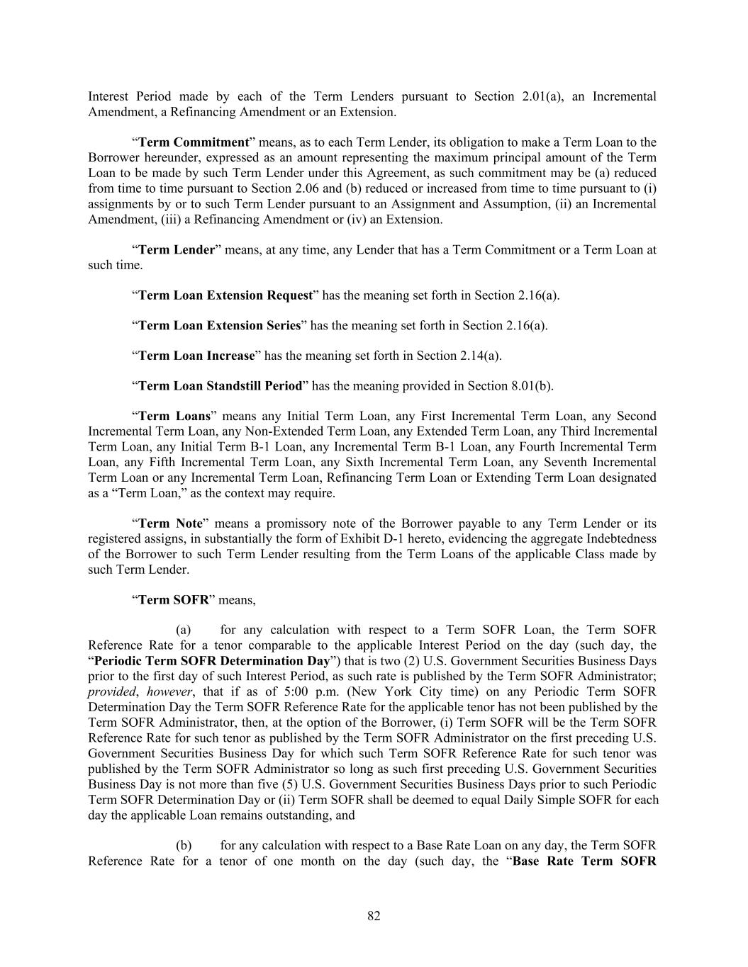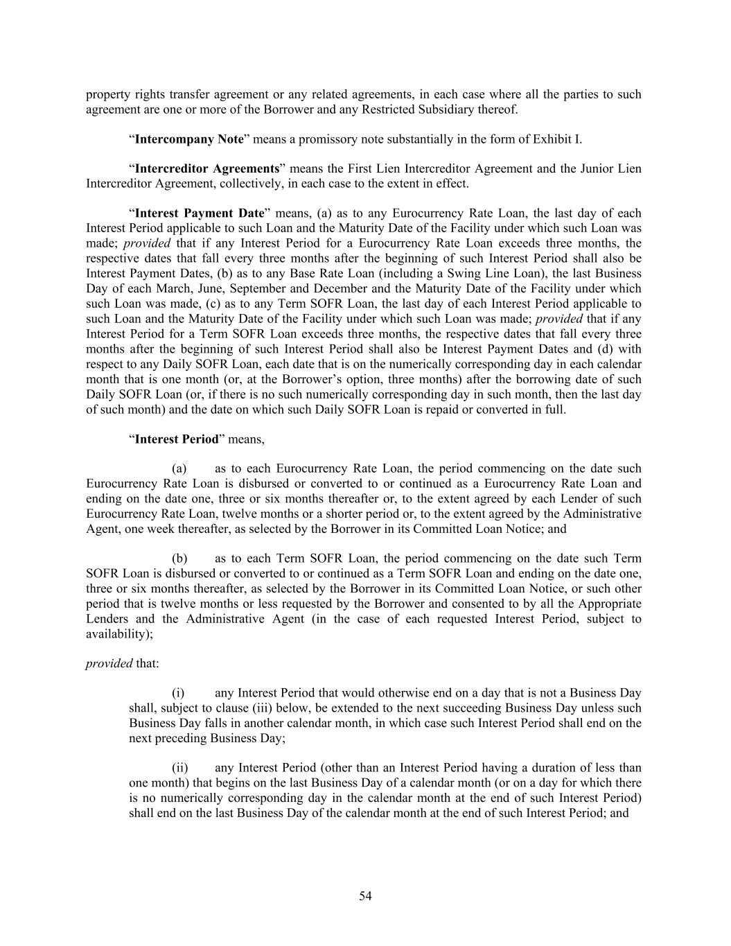 property rights transfer agreement or any related agreements, in each case where all the parties to suchagreement are one or more of the Borrower and any Restricted Subsidiary thereof.“Intercompany Note” means a promissory note substantially in the form of Exhibit I.“Intercreditor Agreements” means the First Lien Intercreditor Agreement and the Junior LienIntercreditor Agreement, collectively, in each case to the extent in effect.“Interest Payment Date” means, (a) as to any Eurocurrency Rate Loan, the last day of eachInterest Period applicable to such Loan and the Maturity Date of the Facility under which such Loan wasmade; provided that if any Interest Period for a Eurocurrency Rate Loan exceeds three months, therespective dates that fall every three months after the beginning of such Interest Period shall also beInterest Payment Dates, (b) as to any Base Rate Loan (including a Swing Line Loan), the last BusinessDay of each March, June, September and December and the Maturity Date of the Facility under whichsuch Loan was made, (c) as to any Term SOFR Loan, the last day of each Interest Period applicable tosuch Loan and the Maturity Date of the Facility under which such Loan was made; provided that if anyInterest Period for a Term SOFR Loan exceeds three months, the respective dates that fall every threemonths after the beginning of such Interest Period shall also be Interest Payment Dates and (d) withrespect to any Daily SOFR Loan, each date that is on the numerically corresponding day in each calendarmonth that is one month (or, at the Borrower’s option, three months) after the borrowing date of suchDaily SOFR Loan (or, if there is no such numerically corresponding day in such month, then the last dayof such month) and the date on which such Daily SOFR Loan is repaid or converted in full.“Interest Period” means,(a) as to each Eurocurrency Rate Loan, the period commencing on the date suchEurocurrency Rate Loan is disbursed or converted to or continued as a Eurocurrency Rate Loan andending on the date one, three or six months thereafter or, to the extent agreed by each Lender of suchEurocurrency Rate Loan, twelve months or a shorter period or, to the extent agreed by the AdministrativeAgent, one week thereafter, as selected by the Borrower in its Committed Loan Notice; and(b) as to each Term SOFR Loan, the period commencing on the date such TermSOFR Loan is disbursed or converted to or continued as a Term SOFR Loan and ending on the date one,three or six months thereafter, as selected by the Borrower in its Committed Loan Notice, or such otherperiod that is twelve months or less requested by the Borrower and consented to by all the AppropriateLenders and the Administrative Agent (in the case of each requested Interest Period, subject toavailability);provided that: (i) any Interest Period that would otherwise end on a day that is not a Business Dayshall, subject to clause (iii) below, be extended to the next succeeding Business Day unless suchBusiness Day falls in another calendar month, in which case such Interest Period shall end on thenext preceding Business Day;(ii) any Interest Period (other than an Interest Period having a duration of less thanone month) that begins on the last Business Day of a calendar month (or on a day for which thereis no numerically corresponding day in the calendar month at the end of such Interest Period)shall end on the last Business Day of the calendar month at the end of such Interest Period; and54