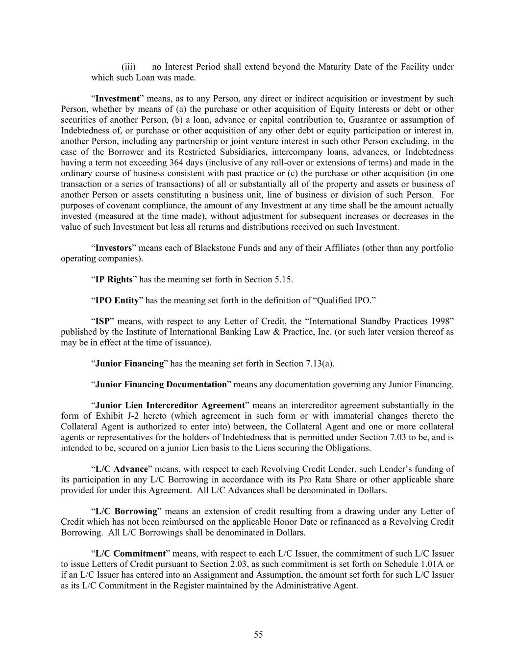 (iii) no Interest Period shall extend beyond the Maturity Date of the Facility underwhich such Loan was made.“Investment” means, as to any Person, any direct or indirect acquisition or investment by suchPerson, whether by means of (a) the purchase or other acquisition of Equity Interests or debt or othersecurities of another Person, (b) a loan, advance or capital contribution to, Guarantee or assumption ofIndebtedness of, or purchase or other acquisition of any other debt or equity participation or interest in,another Person, including any partnership or joint venture interest in such other Person excluding, in thecase of the Borrower and its Restricted Subsidiaries, intercompany loans, advances, or Indebtednesshaving a term not exceeding 364 days (inclusive of any roll-over or extensions of terms) and made in theordinary course of business consistent with past practice or (c) the purchase or other acquisition (in onetransaction or a series of transactions) of all or substantially all of the property and assets or business ofanother Person or assets constituting a business unit, line of business or division of such Person. Forpurposes of covenant compliance, the amount of any Investment at any time shall be the amount actuallyinvested (measured at the time made), without adjustment for subsequent increases or decreases in thevalue of such Investment but less all returns and distributions received on such Investment.“Investors” means each of Blackstone Funds and any of their Affiliates (other than any portfoliooperating companies).“IP Rights” has the meaning set forth in Section 5.15.“IPO Entity” has the meaning set forth in the definition of “Qualified IPO.”“ISP” means, with respect to any Letter of Credit, the “International Standby Practices 1998”published by the Institute of International Banking Law & Practice, Inc. (or such later version thereof asmay be in effect at the time of issuance).“Junior Financing” has the meaning set forth in Section 7.13(a).“Junior Financing Documentation” means any documentation governing any Junior Financing.“Junior Lien Intercreditor Agreement” means an intercreditor agreement substantially in theform of Exhibit J-2 hereto (which agreement in such form or with immaterial changes thereto theCollateral Agent is authorized to enter into) between, the Collateral Agent and one or more collateralagents or representatives for the holders of Indebtedness that is permitted under Section 7.03 to be, and isintended to be, secured on a junior Lien basis to the Liens securing the Obligations.“L/C Advance” means, with respect to each Revolving Credit Lender, such Lender’s funding ofits participation in any L/C Borrowing in accordance with its Pro Rata Share or other applicable shareprovided for under this Agreement. All L/C Advances shall be denominated in Dollars.“L/C Borrowing” means an extension of credit resulting from a drawing under any Letter ofCredit which has not been reimbursed on the applicable Honor Date or refinanced as a Revolving CreditBorrowing. All L/C Borrowings shall be denominated in Dollars.“L/C Commitment” means, with respect to each L/C Issuer, the commitment of such L/C Issuerto issue Letters of Credit pursuant to Section 2.03, as such commitment is set forth on Schedule 1.01A orif an L/C Issuer has entered into an Assignment and Assumption, the amount set forth for such L/C Issueras its L/C Commitment in the Register maintained by the Administrative Agent.55