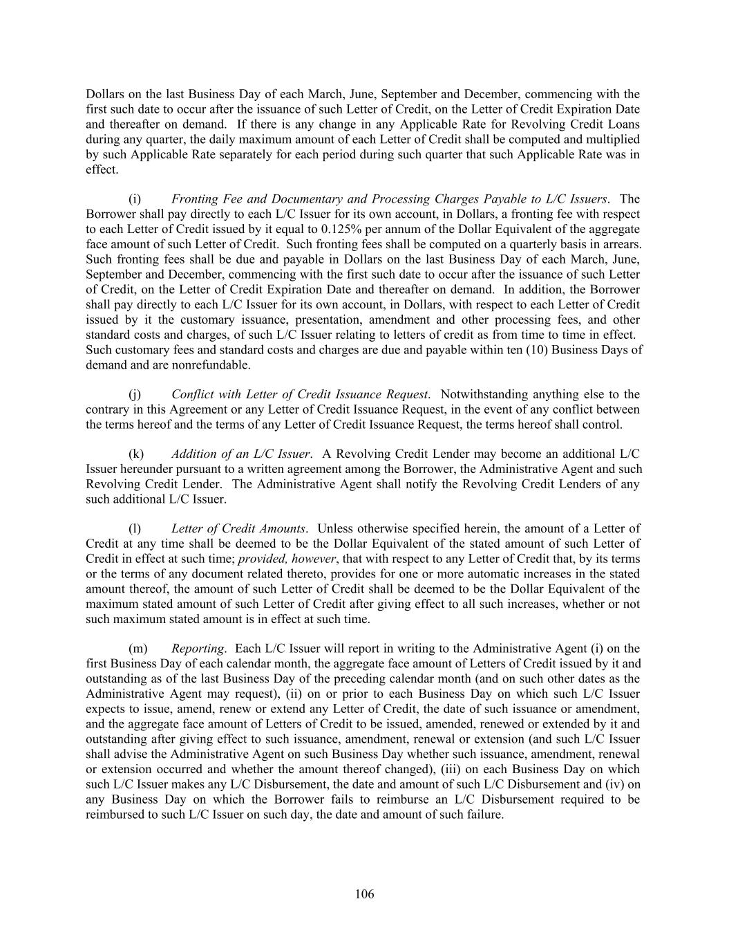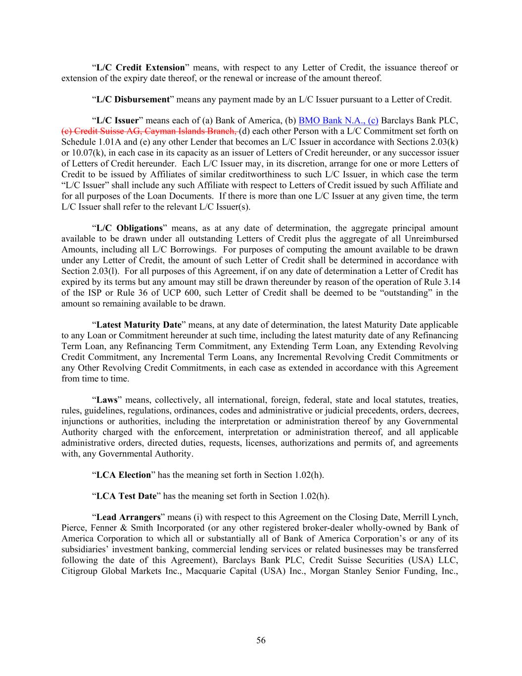 “L/C Credit Extension” means, with respect to any Letter of Credit, the issuance thereof orextension of the expiry date thereof, or the renewal or increase of the amount thereof.“L/C Disbursement” means any payment made by an L/C Issuer pursuant to a Letter of Credit.“L/C Issuer” means each of (a) Bank of America, (b) BMO Bank N.A., (c) Barclays Bank PLC,(c) Credit Suisse AG, Cayman Islands Branch, (d) each other Person with a L/C Commitment set forth onSchedule 1.01A and (e) any other Lender that becomes an L/C Issuer in accordance with Sections 2.03(k)or 10.07(k), in each case in its capacity as an issuer of Letters of Credit hereunder, or any successor issuerof Letters of Credit hereunder. Each L/C Issuer may, in its discretion, arrange for one or more Letters ofCredit to be issued by Affiliates of similar creditworthiness to such L/C Issuer, in which case the term“L/C Issuer” shall include any such Affiliate with respect to Letters of Credit issued by such Affiliate andfor all purposes of the Loan Documents. If there is more than one L/C Issuer at any given time, the termL/C Issuer shall refer to the relevant L/C Issuer(s).“L/C Obligations” means, as at any date of determination, the aggregate principal amountavailable to be drawn under all outstanding Letters of Credit plus the aggregate of all UnreimbursedAmounts, including all L/C Borrowings. For purposes of computing the amount available to be drawnunder any Letter of Credit, the amount of such Letter of Credit shall be determined in accordance with Section 2.03(l). For all purposes of this Agreement, if on any date of determination a Letter of Credit hasexpired by its terms but any amount may still be drawn thereunder by reason of the operation of Rule 3.14of the ISP or Rule 36 of UCP 600, such Letter of Credit shall be deemed to be “outstanding” in theamount so remaining available to be drawn.“Latest Maturity Date” means, at any date of determination, the latest Maturity Date applicableto any Loan or Commitment hereunder at such time, including the latest maturity date of any RefinancingTerm Loan, any Refinancing Term Commitment, any Extending Term Loan, any Extending RevolvingCredit Commitment, any Incremental Term Loans, any Incremental Revolving Credit Commitments orany Other Revolving Credit Commitments, in each case as extended in accordance with this Agreementfrom time to time.“Laws” means, collectively, all international, foreign, federal, state and local statutes, treaties,rules, guidelines, regulations, ordinances, codes and administrative or judicial precedents, orders, decrees,injunctions or authorities, including the interpretation or administration thereof by any GovernmentalAuthority charged with the enforcement, interpretation or administration thereof, and all applicableadministrative orders, directed duties, requests, licenses, authorizations and permits of, and agreementswith, any Governmental Authority.“LCA Election” has the meaning set forth in Section 1.02(h).“LCA Test Date” has the meaning set forth in Section 1.02(h).“Lead Arrangers” means (i) with respect to this Agreement on the Closing Date, Merrill Lynch,Pierce, Fenner & Smith Incorporated (or any other registered broker-dealer wholly-owned by Bank ofAmerica Corporation to which all or substantially all of Bank of America Corporation’s or any of itssubsidiaries’ investment banking, commercial lending services or related businesses may be transferredfollowing the date of this Agreement), Barclays Bank PLC, Credit Suisse Securities (USA) LLC,Citigroup Global Markets Inc., Macquarie Capital (USA) Inc., Morgan Stanley Senior Funding, Inc.,56