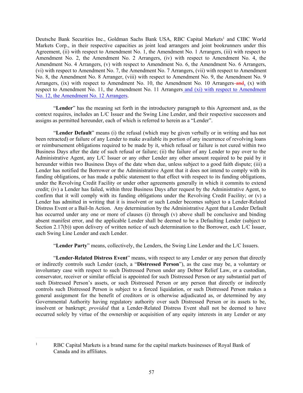57Deutsche Bank Securities Inc., Goldman Sachs Bank USA, RBC Capital Markets1 and CIBC WorldMarkets Corp., in their respective capacities as joint lead arrangers and joint bookrunners under thisAgreement, (ii) with respect to Amendment No. 1, the Amendment No. 1 Arrangers, (iii) with respect toAmendment No. 2, the Amendment No. 2 Arrangers, (iv) with respect to Amendment No. 4, theAmendment No. 4 Arrangers, (v) with respect to Amendment No. 6, the Amendment No. 6 Arrangers,(vi) with respect to Amendment No. 7, the Amendment No. 7 Arrangers, (vii) with respect to AmendmentNo. 8, the Amendment No. 8 Arranger, (viii) with respect to Amendment No. 9, the Amendment No. 9Arrangers, (ix) with respect to Amendment No. 10, the Amendment No. 10 Arrangers and, (x) withrespect to Amendment No. 11, the Amendment No. 11 Arrangers and (xi) with respect to AmendmentNo. 12, the Amendment No. 12 Arrangers.“Lender” has the meaning set forth in the introductory paragraph to this Agreement and, as thecontext requires, includes an L/C Issuer and the Swing Line Lender, and their respective successors andassigns as permitted hereunder, each of which is referred to herein as a “Lender”.“Lender Default” means (i) the refusal (which may be given verbally or in writing and has notbeen retracted) or failure of any Lender to make available its portion of any incurrence of revolving loansor reimbursement obligations required to be made by it, which refusal or failure is not cured within twoBusiness Days after the date of such refusal or failure; (ii) the failure of any Lender to pay over to theAdministrative Agent, any L/C Issuer or any other Lender any other amount required to be paid by ithereunder within two Business Days of the date when due, unless subject to a good faith dispute; (iii) aLender has notified the Borrower or the Administrative Agent that it does not intend to comply with itsfunding obligations, or has made a public statement to that effect with respect to its funding obligations,under the Revolving Credit Facility or under other agreements generally in which it commits to extendcredit; (iv) a Lender has failed, within three Business Days after request by the Administrative Agent, toconfirm that it will comply with its funding obligations under the Revolving Credit Facility; or (v) aLender has admitted in writing that it is insolvent or such Lender becomes subject to a Lender-RelatedDistress Event or a Bail-In Action. Any determination by the Administrative Agent that a Lender Defaulthas occurred under any one or more of clauses (i) through (v) above shall be conclusive and bindingabsent manifest error, and the applicable Lender shall be deemed to be a Defaulting Lender (subject to Section 2.17(b)) upon delivery of written notice of such determination to the Borrower, each L/C Issuer,each Swing Line Lender and each Lender.“Lender Party” means, collectively, the Lenders, the Swing Line Lender and the L/C Issuers.“Lender-Related Distress Event” means, with respect to any Lender or any person that directlyor indirectly controls such Lender (each, a “Distressed Person”), as the case may be, a voluntary orinvoluntary case with respect to such Distressed Person under any Debtor Relief Law, or a custodian,conservator, receiver or similar official is appointed for such Distressed Person or any substantial part ofsuch Distressed Person’s assets, or such Distressed Person or any person that directly or indirectlycontrols such Distressed Person is subject to a forced liquidation, or such Distressed Person makes ageneral assignment for the benefit of creditors or is otherwise adjudicated as, or determined by anyGovernmental Authority having regulatory authority over such Distressed Person or its assets to be,insolvent or bankrupt; provided that a Lender-Related Distress Event shall not be deemed to haveoccurred solely by virtue of the ownership or acquisition of any equity interests in any Lender or any1 RBC Capital Markets is a brand name for the capital markets businesses of Royal Bank ofCanada and its affiliates.