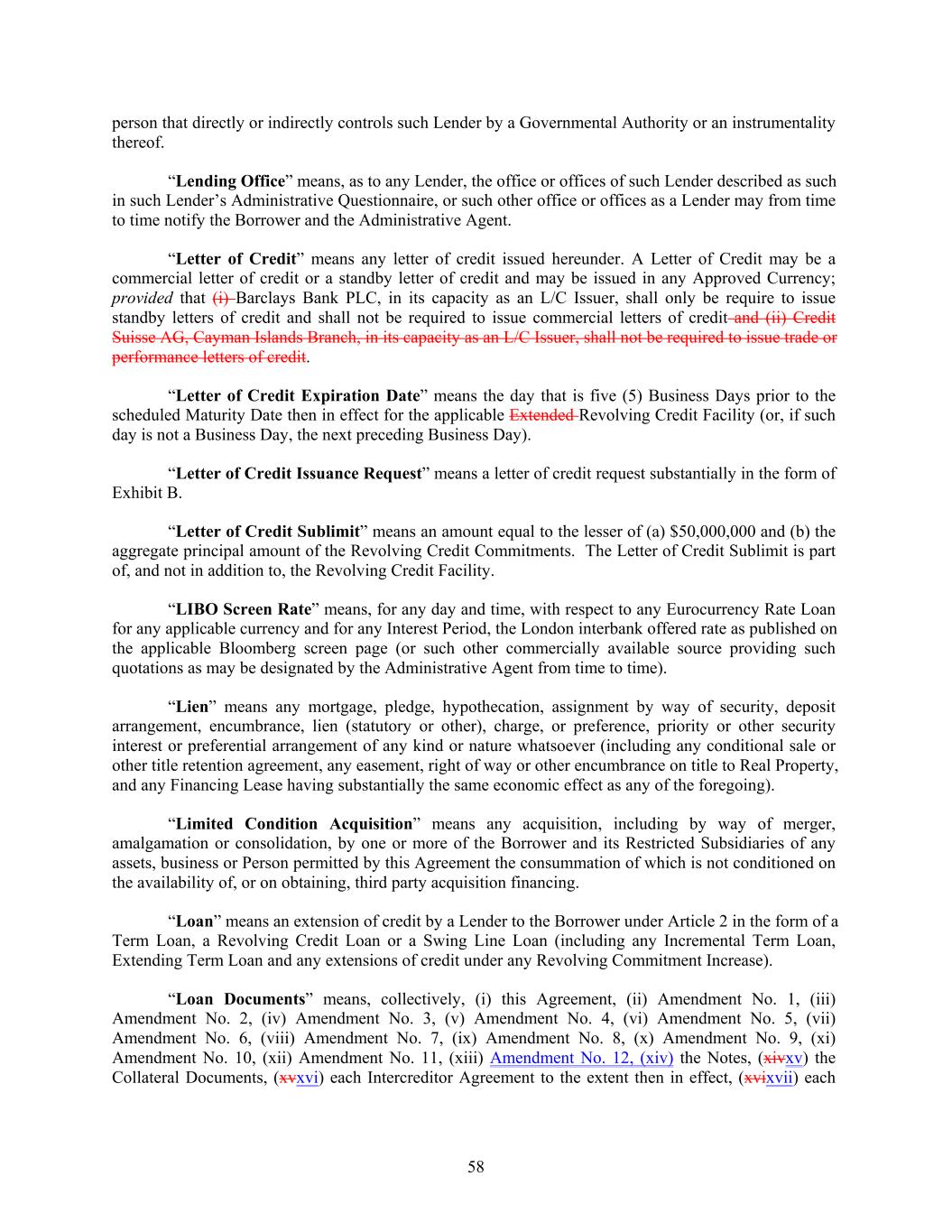 person that directly or indirectly controls such Lender by a Governmental Authority or an instrumentalitythereof. “Lending Office” means, as to any Lender, the office or offices of such Lender described as suchin such Lender’s Administrative Questionnaire, or such other office or offices as a Lender may from timeto time notify the Borrower and the Administrative Agent.“Letter of Credit” means any letter of credit issued hereunder. A Letter of Credit may be acommercial letter of credit or a standby letter of credit and may be issued in any Approved Currency;provided that (i) Barclays Bank PLC, in its capacity as an L/C Issuer, shall only be require to issuestandby letters of credit and shall not be required to issue commercial letters of credit and (ii) CreditSuisse AG, Cayman Islands Branch, in its capacity as an L/C Issuer, shall not be required to issue trade orperformance letters of credit.“Letter of Credit Expiration Date” means the day that is five (5) Business Days prior to thescheduled Maturity Date then in effect for the applicable Extended Revolving Credit Facility (or, if suchday is not a Business Day, the next preceding Business Day).“Letter of Credit Issuance Request” means a letter of credit request substantially in the form ofExhibit B.“Letter of Credit Sublimit” means an amount equal to the lesser of (a) $50,000,000 and (b) theaggregate principal amount of the Revolving Credit Commitments. The Letter of Credit Sublimit is partof, and not in addition to, the Revolving Credit Facility.“LIBO Screen Rate” means, for any day and time, with respect to any Eurocurrency Rate Loanfor any applicable currency and for any Interest Period, the London interbank offered rate as published onthe applicable Bloomberg screen page (or such other commercially available source providing suchquotations as may be designated by the Administrative Agent from time to time).“Lien” means any mortgage, pledge, hypothecation, assignment by way of security, depositarrangement, encumbrance, lien (statutory or other), charge, or preference, priority or other securityinterest or preferential arrangement of any kind or nature whatsoever (including any conditional sale orother title retention agreement, any easement, right of way or other encumbrance on title to Real Property,and any Financing Lease having substantially the same economic effect as any of the foregoing).“Limited Condition Acquisition” means any acquisition, including by way of merger,amalgamation or consolidation, by one or more of the Borrower and its Restricted Subsidiaries of anyassets, business or Person permitted by this Agreement the consummation of which is not conditioned onthe availability of, or on obtaining, third party acquisition financing.“Loan” means an extension of credit by a Lender to the Borrower under Article 2 in the form of aTerm Loan, a Revolving Credit Loan or a Swing Line Loan (including any Incremental Term Loan,Extending Term Loan and any extensions of credit under any Revolving Commitment Increase).“Loan Documents” means, collectively, (i) this Agreement, (ii) Amendment No. 1, (iii)Amendment No. 2, (iv) Amendment No. 3, (v) Amendment No. 4, (vi) Amendment No. 5, (vii)Amendment No. 6, (viii) Amendment No. 7, (ix) Amendment No. 8, (x) Amendment No. 9, (xi)Amendment No. 10, (xii) Amendment No. 11, (xiii) Amendment No. 12, (xiv) the Notes, (xivxv) theCollateral Documents, (xvxvi) each Intercreditor Agreement to the extent then in effect, (xvixvii) each58