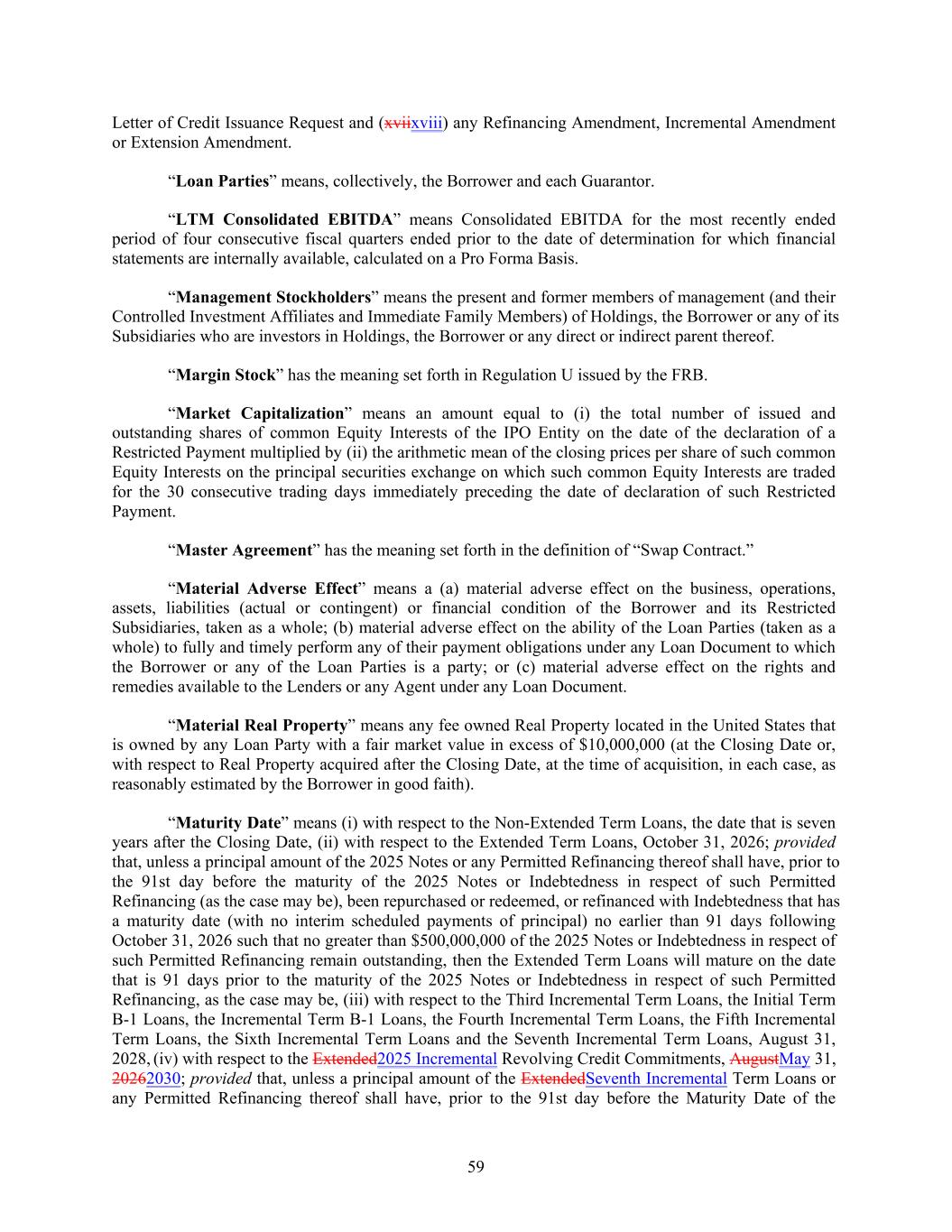Letter of Credit Issuance Request and (xviixviii) any Refinancing Amendment, Incremental Amendmentor Extension Amendment.“Loan Parties” means, collectively, the Borrower and each Guarantor.“LTM Consolidated EBITDA” means Consolidated EBITDA for the most recently endedperiod of four consecutive fiscal quarters ended prior to the date of determination for which financialstatements are internally available, calculated on a Pro Forma Basis.“Management Stockholders” means the present and former members of management (and theirControlled Investment Affiliates and Immediate Family Members) of Holdings, the Borrower or any of itsSubsidiaries who are investors in Holdings, the Borrower or any direct or indirect parent thereof.“Margin Stock” has the meaning set forth in Regulation U issued by the FRB.“Market Capitalization” means an amount equal to (i) the total number of issued andoutstanding shares of common Equity Interests of the IPO Entity on the date of the declaration of aRestricted Payment multiplied by (ii) the arithmetic mean of the closing prices per share of such commonEquity Interests on the principal securities exchange on which such common Equity Interests are tradedfor the 30 consecutive trading days immediately preceding the date of declaration of such RestrictedPayment.“Master Agreement” has the meaning set forth in the definition of “Swap Contract.”“Material Adverse Effect” means a (a) material adverse effect on the business, operations,assets, liabilities (actual or contingent) or financial condition of the Borrower and its RestrictedSubsidiaries, taken as a whole; (b) material adverse effect on the ability of the Loan Parties (taken as awhole) to fully and timely perform any of their payment obligations under any Loan Document to whichthe Borrower or any of the Loan Parties is a party; or (c) material adverse effect on the rights andremedies available to the Lenders or any Agent under any Loan Document.“Material Real Property” means any fee owned Real Property located in the United States thatis owned by any Loan Party with a fair market value in excess of $10,000,000 (at the Closing Date or,with respect to Real Property acquired after the Closing Date, at the time of acquisition, in each case, asreasonably estimated by the Borrower in good faith).“Maturity Date” means (i) with respect to the Non-Extended Term Loans, the date that is sevenyears after the Closing Date, (ii) with respect to the Extended Term Loans, October 31, 2026; providedthat, unless a principal amount of the 2025 Notes or any Permitted Refinancing thereof shall have, prior tothe 91st day before the maturity of the 2025 Notes or Indebtedness in respect of such PermittedRefinancing (as the case may be), been repurchased or redeemed, or refinanced with Indebtedness that hasa maturity date (with no interim scheduled payments of principal) no earlier than 91 days followingOctober 31, 2026 such that no greater than $500,000,000 of the 2025 Notes or Indebtedness in respect ofsuch Permitted Refinancing remain outstanding, then the Extended Term Loans will mature on the datethat is 91 days prior to the maturity of the 2025 Notes or Indebtedness in respect of such PermittedRefinancing, as the case may be, (iii) with respect to the Third Incremental Term Loans, the Initial TermB-1 Loans, the Incremental Term B-1 Loans, the Fourth Incremental Term Loans, the Fifth IncrementalTerm Loans, the Sixth Incremental Term Loans and the Seventh Incremental Term Loans, August 31,2028, (iv) with respect to the Extended2025 Incremental Revolving Credit Commitments, AugustMay 31,20262030; provided that, unless a principal amount of the ExtendedSeventh Incremental Term Loans orany Permitted Refinancing thereof shall have, prior to the 91st day before the Maturity Date of the59