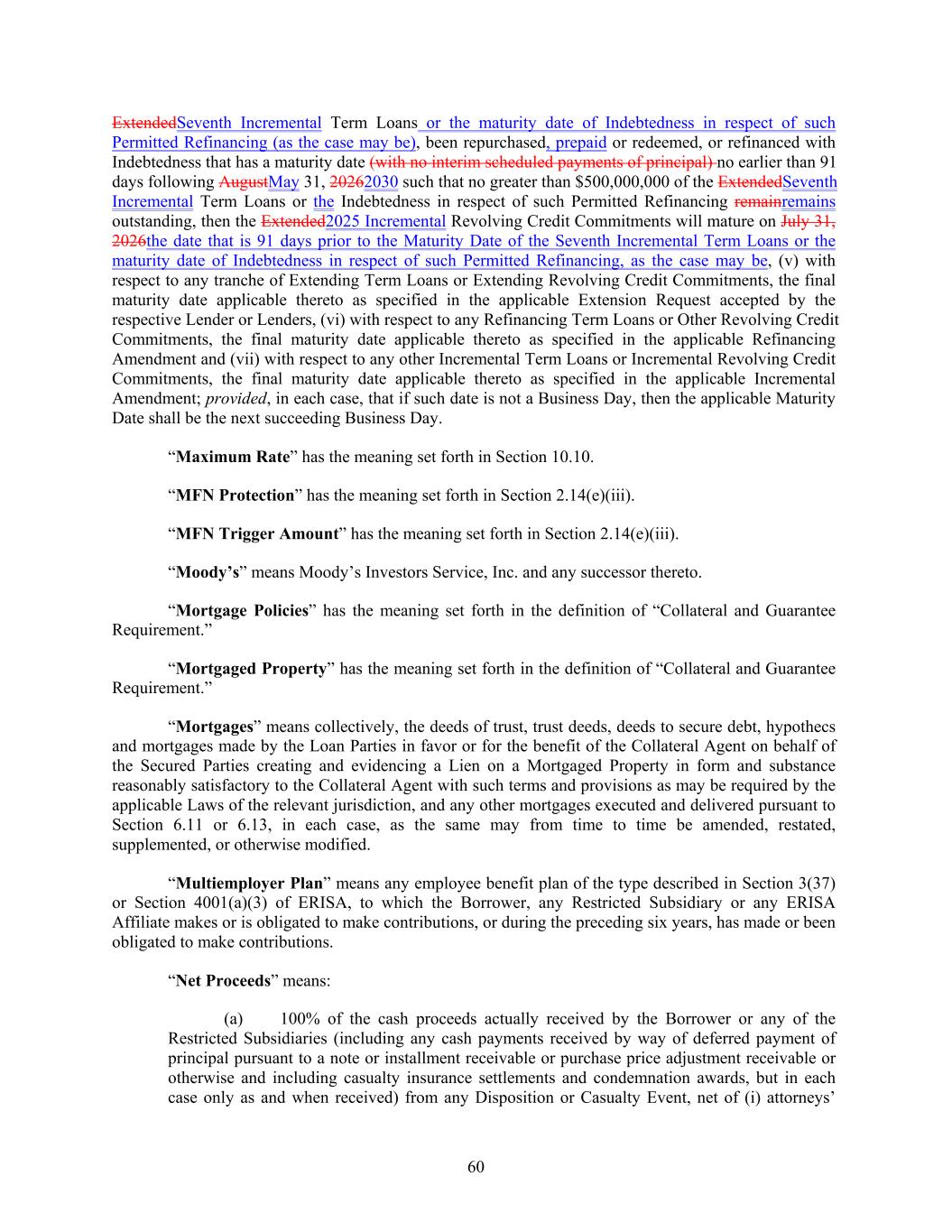 ExtendedSeventh Incremental Term Loans or the maturity date of Indebtedness in respect of suchPermitted Refinancing (as the case may be), been repurchased, prepaid or redeemed, or refinanced withIndebtedness that has a maturity date (with no interim scheduled payments of principal) no earlier than 91days following AugustMay 31, 20262030 such that no greater than $500,000,000 of the ExtendedSeventhIncremental Term Loans or the Indebtedness in respect of such Permitted Refinancing remainremainsoutstanding, then the Extended2025 Incremental Revolving Credit Commitments will mature on July 31,2026the date that is 91 days prior to the Maturity Date of the Seventh Incremental Term Loans or thematurity date of Indebtedness in respect of such Permitted Refinancing, as the case may be, (v) withrespect to any tranche of Extending Term Loans or Extending Revolving Credit Commitments, the finalmaturity date applicable thereto as specified in the applicable Extension Request accepted by therespective Lender or Lenders, (vi) with respect to any Refinancing Term Loans or Other Revolving CreditCommitments, the final maturity date applicable thereto as specified in the applicable RefinancingAmendment and (vii) with respect to any other Incremental Term Loans or Incremental Revolving CreditCommitments, the final maturity date applicable thereto as specified in the applicable IncrementalAmendment; provided, in each case, that if such date is not a Business Day, then the applicable MaturityDate shall be the next succeeding Business Day.“Maximum Rate” has the meaning set forth in Section 10.10.“MFN Protection” has the meaning set forth in Section 2.14(e)(iii).“MFN Trigger Amount” has the meaning set forth in Section 2.14(e)(iii).“Moody’s” means Moody’s Investors Service, Inc. and any successor thereto.“Mortgage Policies” has the meaning set forth in the definition of “Collateral and GuaranteeRequirement.”“Mortgaged Property” has the meaning set forth in the definition of “Collateral and GuaranteeRequirement.”“Mortgages” means collectively, the deeds of trust, trust deeds, deeds to secure debt, hypothecsand mortgages made by the Loan Parties in favor or for the benefit of the Collateral Agent on behalf ofthe Secured Parties creating and evidencing a Lien on a Mortgaged Property in form and substancereasonably satisfactory to the Collateral Agent with such terms and provisions as may be required by theapplicable Laws of the relevant jurisdiction, and any other mortgages executed and delivered pursuant to Section 6.11 or 6.13, in each case, as the same may from time to time be amended, restated,supplemented, or otherwise modified.“Multiemployer Plan” means any employee benefit plan of the type described in Section 3(37)or Section 4001(a)(3) of ERISA, to which the Borrower, any Restricted Subsidiary or any ERISAAffiliate makes or is obligated to make contributions, or during the preceding six years, has made or beenobligated to make contributions.“Net Proceeds” means:(a) 100% of the cash proceeds actually received by the Borrower or any of theRestricted Subsidiaries (including any cash payments received by way of deferred payment ofprincipal pursuant to a note or installment receivable or purchase price adjustment receivable orotherwise and including casualty insurance settlements and condemnation awards, but in eachcase only as and when received) from any Disposition or Casualty Event, net of (i) attorneys’60