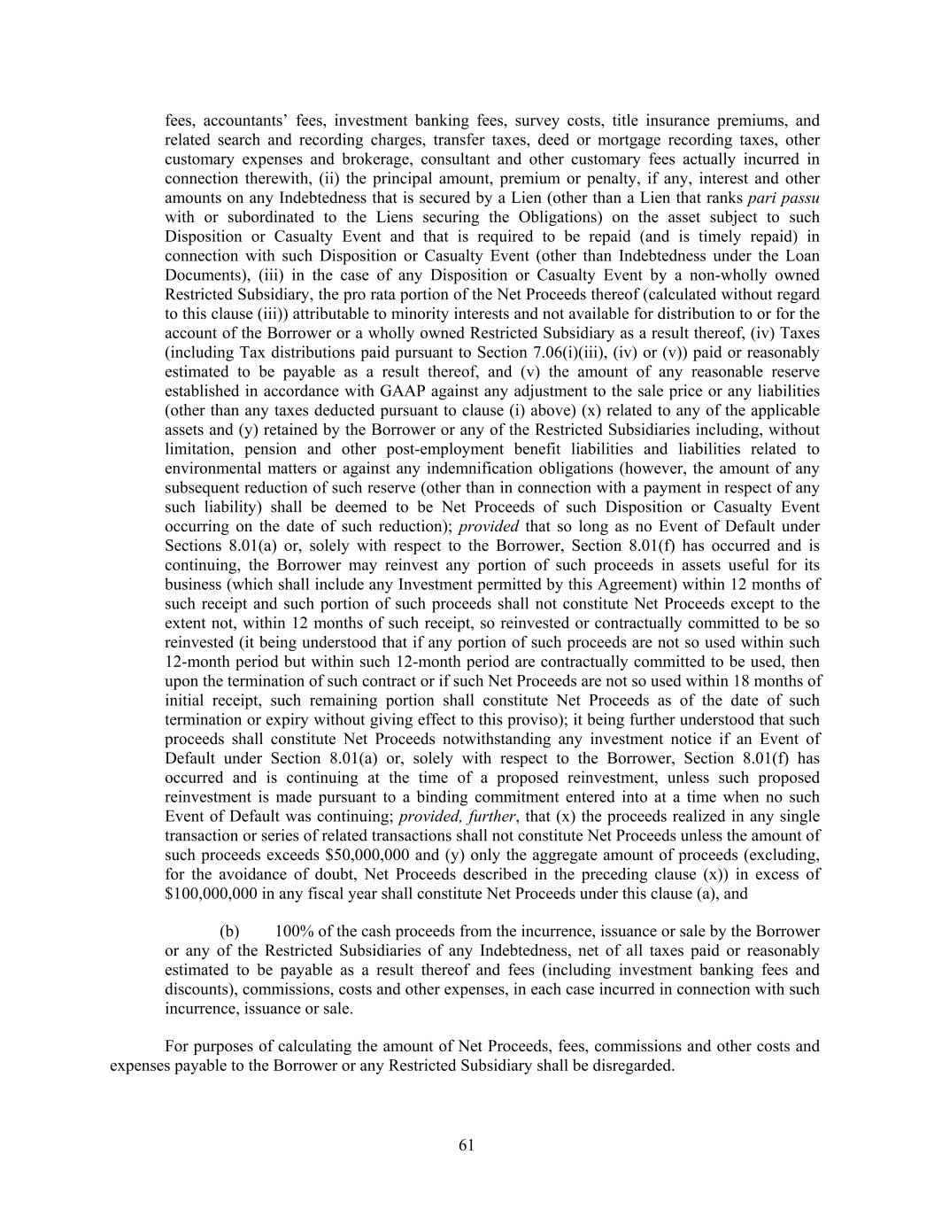 fees, accountants’ fees, investment banking fees, survey costs, title insurance premiums, andrelated search and recording charges, transfer taxes, deed or mortgage recording taxes, othercustomary expenses and brokerage, consultant and other customary fees actually incurred inconnection therewith, (ii) the principal amount, premium or penalty, if any, interest and otheramounts on any Indebtedness that is secured by a Lien (other than a Lien that ranks pari passuwith or subordinated to the Liens securing the Obligations) on the asset subject to suchDisposition or Casualty Event and that is required to be repaid (and is timely repaid) inconnection with such Disposition or Casualty Event (other than Indebtedness under the LoanDocuments), (iii) in the case of any Disposition or Casualty Event by a non-wholly ownedRestricted Subsidiary, the pro rata portion of the Net Proceeds thereof (calculated without regardto this clause (iii)) attributable to minority interests and not available for distribution to or for theaccount of the Borrower or a wholly owned Restricted Subsidiary as a result thereof, (iv) Taxes(including Tax distributions paid pursuant to Section 7.06(i)(iii), (iv) or (v)) paid or reasonablyestimated to be payable as a result thereof, and (v) the amount of any reasonable reserveestablished in accordance with GAAP against any adjustment to the sale price or any liabilities(other than any taxes deducted pursuant to clause (i) above) (x) related to any of the applicableassets and (y) retained by the Borrower or any of the Restricted Subsidiaries including, withoutlimitation, pension and other post-employment benefit liabilities and liabilities related toenvironmental matters or against any indemnification obligations (however, the amount of anysubsequent reduction of such reserve (other than in connection with a payment in respect of anysuch liability) shall be deemed to be Net Proceeds of such Disposition or Casualty Eventoccurring on the date of such reduction); provided that so long as no Event of Default underSections 8.01(a) or, solely with respect to the Borrower, Section 8.01 (f) has occurred and iscontinuing, the Borrower may reinvest any portion of such proceeds in assets useful for itsbusiness (which shall include any Investment permitted by this Agreement) within 12 months ofsuch receipt and such portion of such proceeds shall not constitute Net Proceeds except to theextent not, within 12 months of such receipt, so reinvested or contractually committed to be soreinvested (it being understood that if any portion of such proceeds are not so used within such12-month period but within such 12-month period are contractually committed to be used, thenupon the termination of such contract or if such Net Proceeds are not so used within 18 months ofinitial receipt, such remaining portion shall constitute Net Proceeds as of the date of suchtermination or expiry without giving effect to this proviso); it being further understood that suchproceeds shall constitute Net Proceeds notwithstanding any investment notice if an Event ofDefault under Section 8.01(a) or, solely with respect to the Borrower, Section 8.01(f) hasoccurred and is continuing at the time of a proposed reinvestment, unless such proposedreinvestment is made pursuant to a binding commitment entered into at a time when no suchEvent of Default was continuing; provided, further, that (x) the proceeds realized in any singletransaction or series of related transactions shall not constitute Net Proceeds unless the amount ofsuch proceeds exceeds $50,000,000 and (y) only the aggregate amount of proceeds (excluding,for the avoidance of doubt, Net Proceeds described in the preceding clause (x)) in excess of$100,000,000 in any fiscal year shall constitute Net Proceeds under this clause (a), and(b) 100% of the cash proceeds from the incurrence, issuance or sale by the Borroweror any of the Restricted Subsidiaries of any Indebtedness, net of all taxes paid or reasonablyestimated to be payable as a result thereof and fees (including investment banking fees anddiscounts), commissions, costs and other expenses, in each case incurred in connection with suchincurrence, issuance or sale.For purposes of calculating the amount of Net Proceeds, fees, commissions and other costs andexpenses payable to the Borrower or any Restricted Subsidiary shall be disregarded.61