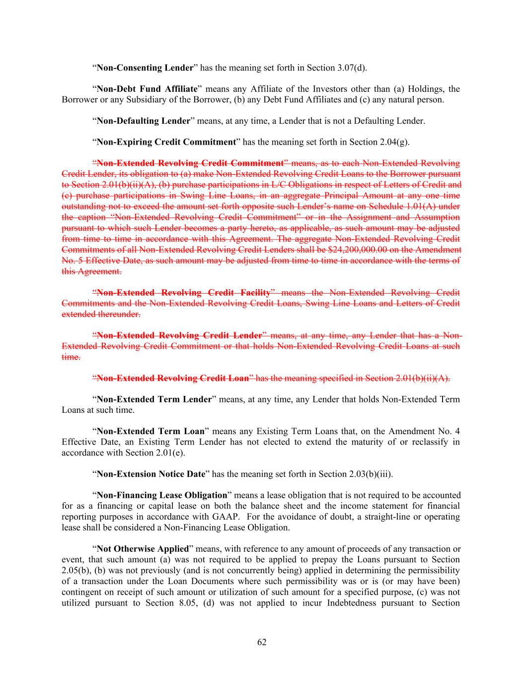 “Non-Consenting Lender” has the meaning set forth in Section 3.07(d).“Non-Debt Fund Affiliate” means any Affiliate of the Investors other than (a) Holdings, theBorrower or any Subsidiary of the Borrower, (b) any Debt Fund Affiliates and (c) any natural person.“Non-Defaulting Lender” means, at any time, a Lender that is not a Defaulting Lender.“Non-Expiring Credit Commitment” has the meaning set forth in Section 2.04(g).“Non-Extended Revolving Credit Commitment” means, as to each Non-Extended RevolvingCredit Lender, its obligation to (a) make Non-Extended Revolving Credit Loans to the Borrower pursuantto Section 2.01(b)(ii)(A), (b) purchase participations in L/C Obligations in respect of Letters of Credit and(c) purchase participations in Swing Line Loans, in an aggregate Principal Amount at any one timeoutstanding not to exceed the amount set forth opposite such Lender’s name on Schedule 1.01(A) underthe caption “Non-Extended Revolving Credit Commitment” or in the Assignment and Assumptionpursuant to which such Lender becomes a party hereto, as applicable, as such amount may be adjustedfrom time to time in accordance with this Agreement. The aggregate Non-Extended Revolving CreditCommitments of all Non-Extended Revolving Credit Lenders shall be $24,200,000.00 on the AmendmentNo. 5 Effective Date, as such amount may be adjusted from time to time in accordance with the terms ofthis Agreement.“Non-Extended Revolving Credit Facility” means the Non-Extended Revolving CreditCommitments and the Non-Extended Revolving Credit Loans, Swing Line Loans and Letters of Creditextended thereunder.“Non-Extended Revolving Credit Lender” means, at any time, any Lender that has a Non-Extended Revolving Credit Commitment or that holds Non-Extended Revolving Credit Loans at suchtime. “Non-Extended Revolving Credit Loan” has the meaning specified in Section 2.01(b)(ii)(A).“Non-Extended Term Lender” means, at any time, any Lender that holds Non-Extended TermLoans at such time.“Non-Extended Term Loan” means any Existing Term Loans that, on the Amendment No. 4Effective Date, an Existing Term Lender has not elected to extend the maturity of or reclassify inaccordance with Section 2.01(e).“Non-Extension Notice Date” has the meaning set forth in Section 2.03(b)(iii).“Non-Financing Lease Obligation” means a lease obligation that is not required to be accountedfor as a financing or capital lease on both the balance sheet and the income statement for financialreporting purposes in accordance with GAAP. For the avoidance of doubt, a straight-line or operatinglease shall be considered a Non-Financing Lease Obligation.“Not Otherwise Applied” means, with reference to any amount of proceeds of any transaction orevent, that such amount (a) was not required to be applied to prepay the Loans pursuant to Section2.05(b), (b) was not previously (and is not concurrently being) applied in determining the permissibilityof a transaction under the Loan Documents where such permissibility was or is (or may have been)contingent on receipt of such amount or utilization of such amount for a specified purpose, (c) was notutilized pursuant to Section 8.05, (d) was not applied to incur Indebtedness pursuant to Section62