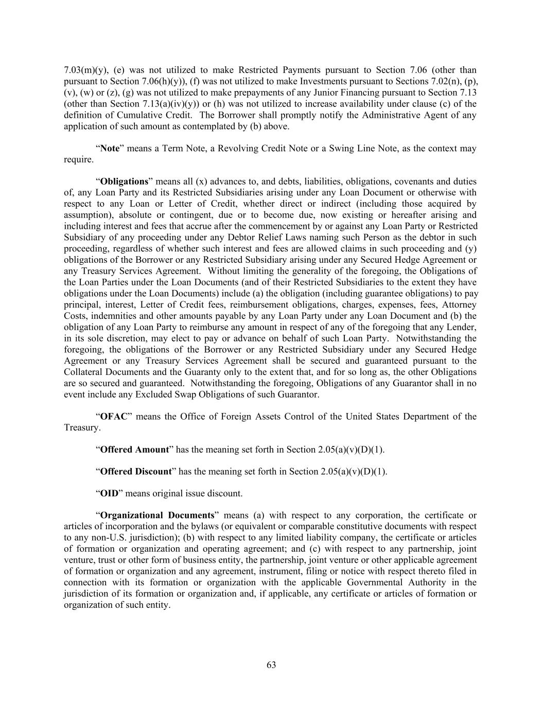 7.03(m)(y), (e) was not utilized to make Restricted Payments pursuant to Section 7.06 (other thanpursuant to Section 7.06(h)(y)), (f) was not utilized to make Investments pursuant to Sections 7.02(n), (p), (v), (w) or (z), (g) was not utilized to make prepayments of any Junior Financing pursuant to Section 7.13(other than Section 7.13(a)(iv)(y)) or (h) was not utilized to increase availability under clause (c) of thedefinition of Cumulative Credit. The Borrower shall promptly notify the Administrative Agent of anyapplication of such amount as contemplated by (b) above.“Note” means a Term Note, a Revolving Credit Note or a Swing Line Note, as the context mayrequire. “Obligations” means all (x) advances to, and debts, liabilities, obligations, covenants and dutiesof, any Loan Party and its Restricted Subsidiaries arising under any Loan Document or otherwise withrespect to any Loan or Letter of Credit, whether direct or indirect (including those acquired byassumption), absolute or contingent, due or to become due, now existing or hereafter arising andincluding interest and fees that accrue after the commencement by or against any Loan Party or RestrictedSubsidiary of any proceeding under any Debtor Relief Laws naming such Person as the debtor in suchproceeding, regardless of whether such interest and fees are allowed claims in such proceeding and (y)obligations of the Borrower or any Restricted Subsidiary arising under any Secured Hedge Agreement orany Treasury Services Agreement. Without limiting the generality of the foregoing, the Obligations ofthe Loan Parties under the Loan Documents (and of their Restricted Subsidiaries to the extent they haveobligations under the Loan Documents) include (a) the obligation (including guarantee obligations) to payprincipal, interest, Letter of Credit fees, reimbursement obligations, charges, expenses, fees, AttorneyCosts, indemnities and other amounts payable by any Loan Party under any Loan Document and (b) theobligation of any Loan Party to reimburse any amount in respect of any of the foregoing that any Lender,in its sole discretion, may elect to pay or advance on behalf of such Loan Party. Notwithstanding theforegoing, the obligations of the Borrower or any Restricted Subsidiary under any Secured HedgeAgreement or any Treasury Services Agreement shall be secured and guaranteed pursuant to theCollateral Documents and the Guaranty only to the extent that, and for so long as, the other Obligationsare so secured and guaranteed. Notwithstanding the foregoing, Obligations of any Guarantor shall in noevent include any Excluded Swap Obligations of such Guarantor.“OFAC” means the Office of Foreign Assets Control of the United States Department of theTreasury.“Offered Amount” has the meaning set forth in Section 2.05(a)(v)(D)(1).“Offered Discount” has the meaning set forth in Section 2.05(a)(v)(D)(1).“OID” means original issue discount.“Organizational Documents” means (a) with respect to any corporation, the certificate orarticles of incorporation and the bylaws (or equivalent or comparable constitutive documents with respectto any non-U.S. jurisdiction); (b) with respect to any limited liability company, the certificate or articlesof formation or organization and operating agreement; and (c) with respect to any partnership, jointventure, trust or other form of business entity, the partnership, joint venture or other applicable agreementof formation or organization and any agreement, instrument, filing or notice with respect thereto filed inconnection with its formation or organization with the applicable Governmental Authority in thejurisdiction of its formation or organization and, if applicable, any certificate or articles of formation ororganization of such entity. 63