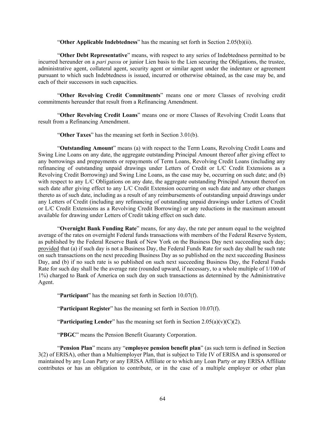 “Other Applicable Indebtedness” has the meaning set forth in Section 2.05(b)(ii).“Other Debt Representative” means, with respect to any series of Indebtedness permitted to beincurred hereunder on a pari passu or junior Lien basis to the Lien securing the Obligations, the trustee,administrative agent, collateral agent, security agent or similar agent under the indenture or agreementpursuant to which such Indebtedness is issued, incurred or otherwise obtained, as the case may be, andeach of their successors in such capacities.“Other Revolving Credit Commitments” means one or more Classes of revolving creditcommitments hereunder that result from a Refinancing Amendment.“Other Revolving Credit Loans” means one or more Classes of Revolving Credit Loans thatresult from a Refinancing Amendment.“Other Taxes” has the meaning set forth in Section 3.01(b).“Outstanding Amount” means (a) with respect to the Term Loans, Revolving Credit Loans andSwing Line Loans on any date, the aggregate outstanding Principal Amount thereof after giving effect toany borrowings and prepayments or repayments of Term Loans, Revolving Credit Loans (including anyrefinancing of outstanding unpaid drawings under Letters of Credit or L/C Credit Extensions as aRevolving Credit Borrowing) and Swing Line Loans, as the case may be, occurring on such date; and (b)with respect to any L/C Obligations on any date, the aggregate outstanding Principal Amount thereof onsuch date after giving effect to any L/C Credit Extension occurring on such date and any other changesthereto as of such date, including as a result of any reimbursements of outstanding unpaid drawings underany Letters of Credit (including any refinancing of outstanding unpaid drawings under Letters of Creditor L/C Credit Extensions as a Revolving Credit Borrowing) or any reductions in the maximum amountavailable for drawing under Letters of Credit taking effect on such date.“Overnight Bank Funding Rate” means, for any day, the rate per annum equal to the weightedaverage of the rates on overnight Federal funds transactions with members of the Federal Reserve System,as published by the Federal Reserve Bank of New York on the Business Day next succeeding such day;provided that (a) if such day is not a Business Day, the Federal Funds Rate for such day shall be such rateon such transactions on the next preceding Business Day as so published on the next succeeding BusinessDay, and (b) if no such rate is so published on such next succeeding Business Day, the Federal FundsRate for such day shall be the average rate (rounded upward, if necessary, to a whole multiple of 1/100 of1%) charged to Bank of America on such day on such transactions as determined by the AdministrativeAgent. “Participant” has the meaning set forth in Section 10.07(f).“Participant Register” has the meaning set forth in Section 10.07(f).“Participating Lender” has the meaning set forth in Section 2.05(a)(v)(C)(2).“PBGC” means the Pension Benefit Guaranty Corporation.“Pension Plan” means any “employee pension benefit plan” (as such term is defined in Section3(2) of ERISA), other than a Multiemployer Plan, that is subject to Title IV of ERISA and is sponsored ormaintained by any Loan Party or any ERISA Affiliate or to which any Loan Party or any ERISA Affiliatecontributes or has an obligation to contribute, or in the case of a multiple employer or other plan64