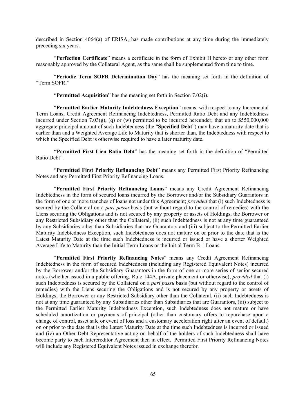 described in Section 4064(a) of ERISA, has made contributions at any time during the immediatelypreceding six years.“Perfection Certificate” means a certificate in the form of Exhibit H hereto or any other formreasonably approved by the Collateral Agent, as the same shall be supplemented from time to time.“Periodic Term SOFR Determination Day” has the meaning set forth in the definition of“Term SOFR.”“Permitted Acquisition” has the meaning set forth in Section 7.02(i).“Permitted Earlier Maturity Indebtedness Exception” means, with respect to any IncrementalTerm Loans, Credit Agreement Refinancing Indebtedness, Permitted Ratio Debt and any Indebtednessincurred under Section 7.03(g), (q) or (w) permitted to be incurred hereunder, that up to $550,000,000aggregate principal amount of such Indebtedness (the “Specified Debt”) may have a maturity date that isearlier than and a Weighted Average Life to Maturity that is shorter than, the Indebtedness with respect towhich the Specified Debt is otherwise required to have a later maturity date.“Permitted First Lien Ratio Debt” has the meaning set forth in the definition of “PermittedRatio Debt”.“Permitted First Priority Refinancing Debt” means any Permitted First Priority RefinancingNotes and any Permitted First Priority Refinancing Loans.“Permitted First Priority Refinancing Loans” means any Credit Agreement RefinancingIndebtedness in the form of secured loans incurred by the Borrower and/or the Subsidiary Guarantors inthe form of one or more tranches of loans not under this Agreement; provided that (i) such Indebtedness issecured by the Collateral on a pari passu basis (but without regard to the control of remedies) with theLiens securing the Obligations and is not secured by any property or assets of Holdings, the Borrower orany Restricted Subsidiary other than the Collateral, (ii) such Indebtedness is not at any time guaranteedby any Subsidiaries other than Subsidiaries that are Guarantors and (iii) subject to the Permitted EarlierMaturity Indebtedness Exception, such Indebtedness does not mature on or prior to the date that is theLatest Maturity Date at the time such Indebtedness is incurred or issued or have a shorter WeightedAverage Life to Maturity than the Initial Term Loans or the Initial Term B-1 Loans.“Permitted First Priority Refinancing Notes” means any Credit Agreement RefinancingIndebtedness in the form of secured Indebtedness (including any Registered Equivalent Notes) incurredby the Borrower and/or the Subsidiary Guarantors in the form of one or more series of senior securednotes (whether issued in a public offering, Rule 144A, private placement or otherwise); provided that (i)such Indebtedness is secured by the Collateral on a pari passu basis (but without regard to the control ofremedies) with the Liens securing the Obligations and is not secured by any property or assets ofHoldings, the Borrower or any Restricted Subsidiary other than the Collateral, (ii) such Indebtedness isnot at any time guaranteed by any Subsidiaries other than Subsidiaries that are Guarantors, (iii) subject tothe Permitted Earlier Maturity Indebtedness Exception, such Indebtedness does not mature or havescheduled amortization or payments of principal (other than customary offers to repurchase upon achange of control, asset sale or event of loss and a customary acceleration right after an event of default)on or prior to the date that is the Latest Maturity Date at the time such Indebtedness is incurred or issuedand (iv) an Other Debt Representative acting on behalf of the holders of such Indebtedness shall havebecome party to each Intercreditor Agreement then in effect. Permitted First Priority Refinancing Noteswill include any Registered Equivalent Notes issued in exchange therefor.65