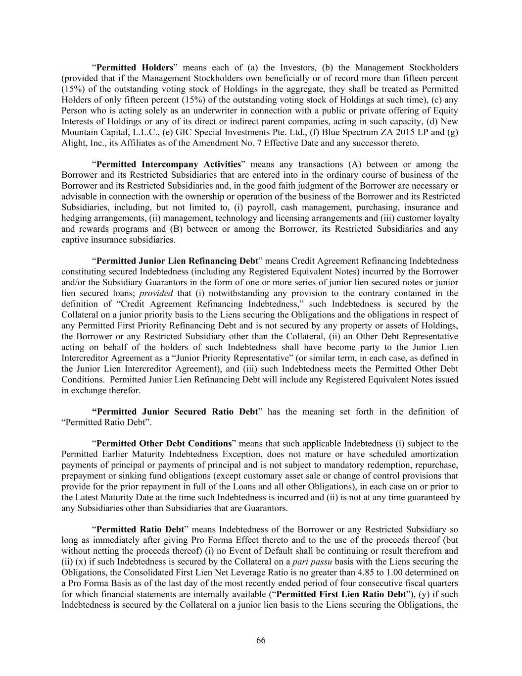 “Permitted Holders” means each of (a) the Investors, (b) the Management Stockholders(provided that if the Management Stockholders own beneficially or of record more than fifteen percent(15%) of the outstanding voting stock of Holdings in the aggregate, they shall be treated as PermittedHolders of only fifteen percent (15%) of the outstanding voting stock of Holdings at such time), (c) anyPerson who is acting solely as an underwriter in connection with a public or private offering of EquityInterests of Holdings or any of its direct or indirect parent companies, acting in such capacity, (d) NewMountain Capital, L.L.C., (e) GIC Special Investments Pte. Ltd., (f) Blue Spectrum ZA 2015 LP and (g)Alight, Inc., its Affiliates as of the Amendment No. 7 Effective Date and any successor thereto.“Permitted Intercompany Activities” means any transactions (A) between or among theBorrower and its Restricted Subsidiaries that are entered into in the ordinary course of business of theBorrower and its Restricted Subsidiaries and, in the good faith judgment of the Borrower are necessary oradvisable in connection with the ownership or operation of the business of the Borrower and its RestrictedSubsidiaries, including, but not limited to, (i) payroll, cash management, purchasing, insurance andhedging arrangements, (ii) management, technology and licensing arrangements and (iii) customer loyaltyand rewards programs and (B) between or among the Borrower, its Restricted Subsidiaries and anycaptive insurance subsidiaries.“Permitted Junior Lien Refinancing Debt” means Credit Agreement Refinancing Indebtednessconstituting secured Indebtedness (including any Registered Equivalent Notes) incurred by the Borrowerand/or the Subsidiary Guarantors in the form of one or more series of junior lien secured notes or juniorlien secured loans; provided that (i) notwithstanding any provision to the contrary contained in thedefinition of “Credit Agreement Refinancing Indebtedness,” such Indebtedness is secured by theCollateral on a junior priority basis to the Liens securing the Obligations and the obligations in respect ofany Permitted First Priority Refinancing Debt and is not secured by any property or assets of Holdings,the Borrower or any Restricted Subsidiary other than the Collateral, (ii) an Other Debt Representativeacting on behalf of the holders of such Indebtedness shall have become party to the Junior LienIntercreditor Agreement as a “Junior Priority Representative” (or similar term, in each case, as defined inthe Junior Lien Intercreditor Agreement), and (iii) such Indebtedness meets the Permitted Other DebtConditions. Permitted Junior Lien Refinancing Debt will include any Registered Equivalent Notes issuedin exchange therefor.“Permitted Junior Secured Ratio Debt” has the meaning set forth in the definition of“Permitted Ratio Debt”.“Permitted Other Debt Conditions” means that such applicable Indebtedness (i) subject to thePermitted Earlier Maturity Indebtedness Exception, does not mature or have scheduled amortizationpayments of principal or payments of principal and is not subject to mandatory redemption, repurchase,prepayment or sinking fund obligations (except customary asset sale or change of control provisions thatprovide for the prior repayment in full of the Loans and all other Obligations), in each case on or prior tothe Latest Maturity Date at the time such Indebtedness is incurred and (ii) is not at any time guaranteed byany Subsidiaries other than Subsidiaries that are Guarantors.“Permitted Ratio Debt” means Indebtedness of the Borrower or any Restricted Subsidiary solong as immediately after giving Pro Forma Effect thereto and to the use of the proceeds thereof (butwithout netting the proceeds thereof) (i) no Event of Default shall be continuing or result therefrom and(ii) (x) if such Indebtedness is secured by the Collateral on a pari passu basis with the Liens securing theObligations, the Consolidated First Lien Net Leverage Ratio is no greater than 4.85 to 1.00 determined ona Pro Forma Basis as of the last day of the most recently ended period of four consecutive fiscal quartersfor which financial statements are internally available (“Permitted First Lien Ratio Debt”), (y) if suchIndebtedness is secured by the Collateral on a junior lien basis to the Liens securing the Obligations, the66