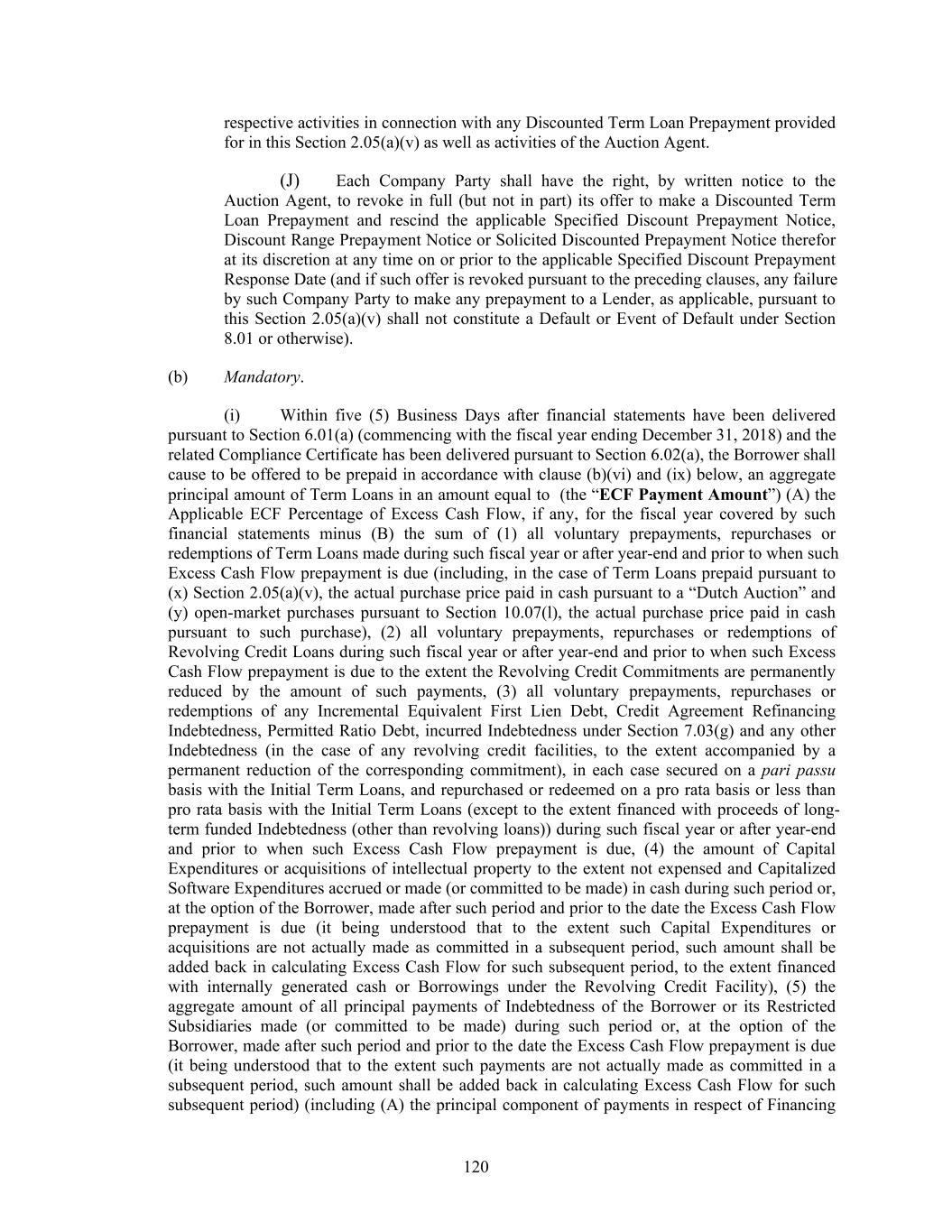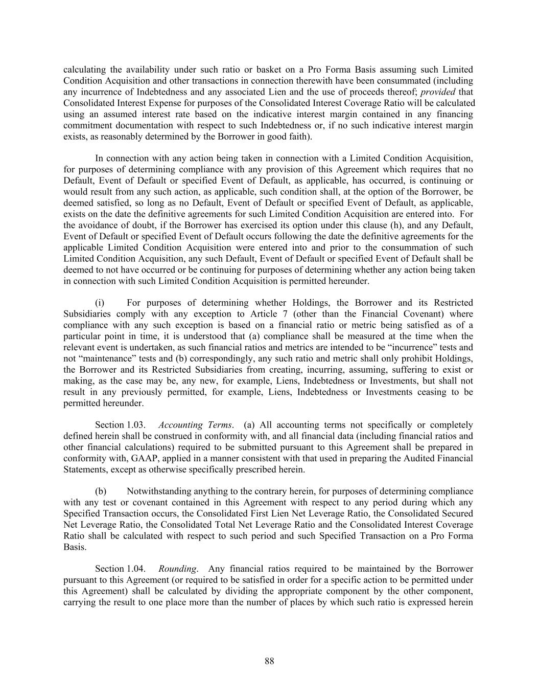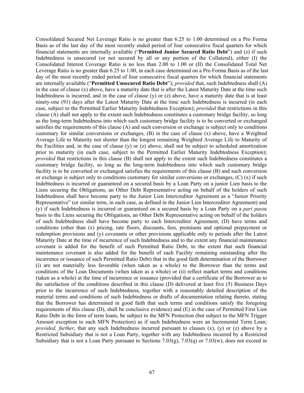 Consolidated Secured Net Leverage Ratio is no greater than 6.25 to 1.00 determined on a Pro FormaBasis as of the last day of the most recently ended period of four consecutive fiscal quarters for whichfinancial statements are internally available (“Permitted Junior Secured Ratio Debt”) and (z) if suchIndebtedness is unsecured (or not secured by all or any portion of the Collateral), either (I) theConsolidated Interest Coverage Ratio is no less than 2.00 to 1.00 or (II) the Consolidated Total NetLeverage Ratio is no greater than 6.25 to 1.00, in each case determined on a Pro Forma Basis as of the lastday of the most recently ended period of four consecutive fiscal quarters for which financial statementsare internally available (“Permitted Unsecured Ratio Debt”); provided that, such Indebtedness shall (A)in the case of clause (x) above, have a maturity date that is after the Latest Maturity Date at the time suchIndebtedness is incurred, and in the case of clause (y) or (z) above, have a maturity date that is at leastninety-one (91) days after the Latest Maturity Date at the time such Indebtedness is incurred (in eachcase, subject to the Permitted Earlier Maturity Indebtedness Exception); provided that restrictions in thisclause (A) shall not apply to the extent such Indebtedness constitutes a customary bridge facility, so longas the long-term Indebtedness into which such customary bridge facility is to be converted or exchangedsatisfies the requirements of this clause (A) and such conversion or exchange is subject only to conditionscustomary for similar conversions or exchanges, (B) in the case of clause (x) above, have a WeightedAverage Life to Maturity not shorter than the longest remaining Weighted Average Life to Maturity ofthe Facilities and, in the case of clause (y) or (z) above, shall not be subject to scheduled amortizationprior to maturity (in each case, subject to the Permitted Earlier Maturity Indebtedness Exception);provided that restrictions in this clause (B) shall not apply to the extent such Indebtedness constitutes acustomary bridge facility, so long as the long-term Indebtedness into which such customary bridgefacility is to be converted or exchanged satisfies the requirements of this clause (B) and such conversionor exchange is subject only to conditions customary for similar conversions or exchanges, (C) (x) if suchIndebtedness is incurred or guaranteed on a secured basis by a Loan Party on a junior Lien basis to theLiens securing the Obligations, an Other Debt Representative acting on behalf of the holders of suchIndebtedness shall have become party to the Junior Lien Intercreditor Agreement as a “Junior PriorityRepresentative” (or similar term, in each case, as defined in the Junior Lien Intercreditor Agreement) and(y) if such Indebtedness is incurred or guaranteed on a secured basis by a Loan Party on a pari passubasis to the Liens securing the Obligations, an Other Debt Representative acting on behalf of the holdersof such Indebtedness shall have become party to each Intercreditor Agreement, (D) have terms andconditions (other than (x) pricing, rate floors, discounts, fees, premiums and optional prepayment orredemption provisions and (y) covenants or other provisions applicable only to periods after the LatestMaturity Date at the time of incurrence of such Indebtedness and to the extent any financial maintenancecovenant is added for the benefit of such Permitted Ratio Debt, to the extent that such financialmaintenance covenant is also added for the benefit of each Facility remaining outstanding after theincurrence or issuance of such Permitted Ratio Debt) that in the good faith determination of the Borrower(i) are not materially less favorable (when taken as a whole) to the Borrower than the terms andconditions of the Loan Documents (when taken as a whole) or (ii) reflect market terms and conditions(taken as a whole) at the time of incurrence or issuance (provided that a certificate of the Borrower as tothe satisfaction of the conditions described in this clause (D) delivered at least five (5) Business Daysprior to the incurrence of such Indebtedness, together with a reasonably detailed description of thematerial terms and conditions of such Indebtedness or drafts of documentation relating thereto, statingthat the Borrower has determined in good faith that such terms and conditions satisfy the foregoingrequirements of this clause (D), shall be conclusive evidence) and (E) in the case of Permitted First LienRatio Debt in the form of term loans, be subject to the MFN Protection (but subject to the MFN TriggerAmount exception to such MFN Protection) as if such Indebtedness were an Incremental Term Loan;provided, further, that any such Indebtedness incurred pursuant to clauses (x), (y) or (z) above by aRestricted Subsidiary that is not a Loan Party, together with any Indebtedness incurred by a RestrictedSubsidiary that is not a Loan Party pursuant to Sections 7.03(g), 7.03(q) or 7.03(w), does not exceed in67