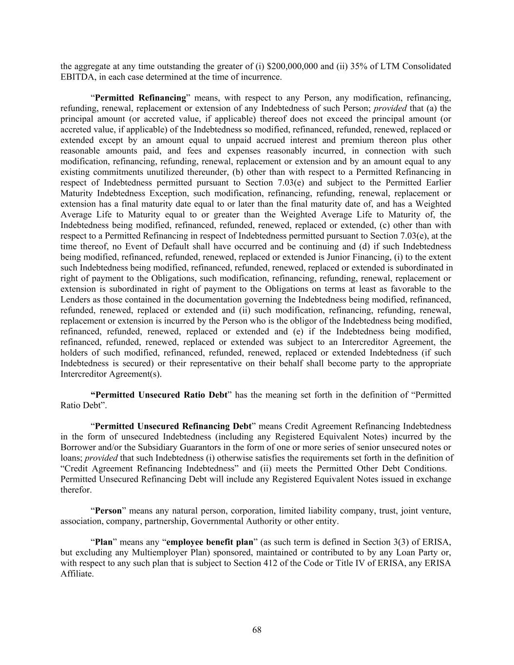 the aggregate at any time outstanding the greater of (i) $200,000,000 and (ii) 35% of LTM ConsolidatedEBITDA, in each case determined at the time of incurrence.“Permitted Refinancing” means, with respect to any Person, any modification, refinancing,refunding, renewal, replacement or extension of any Indebtedness of such Person; provided that (a) theprincipal amount (or accreted value, if applicable) thereof does not exceed the principal amount (oraccreted value, if applicable) of the Indebtedness so modified, refinanced, refunded, renewed, replaced orextended except by an amount equal to unpaid accrued interest and premium thereon plus otherreasonable amounts paid, and fees and expenses reasonably incurred, in connection with suchmodification, refinancing, refunding, renewal, replacement or extension and by an amount equal to anyexisting commitments unutilized thereunder, (b) other than with respect to a Permitted Refinancing inrespect of Indebtedness permitted pursuant to Section 7.03(e) and subject to the Permitted EarlierMaturity Indebtedness Exception, such modification, refinancing, refunding, renewal, replacement orextension has a final maturity date equal to or later than the final maturity date of, and has a WeightedAverage Life to Maturity equal to or greater than the Weighted Average Life to Maturity of, theIndebtedness being modified, refinanced, refunded, renewed, replaced or extended, (c) other than withrespect to a Permitted Refinancing in respect of Indebtedness permitted pursuant to Section 7.03(e), at thetime thereof, no Event of Default shall have occurred and be continuing and (d) if such Indebtednessbeing modified, refinanced, refunded, renewed, replaced or extended is Junior Financing, (i) to the extentsuch Indebtedness being modified, refinanced, refunded, renewed, replaced or extended is subordinated inright of payment to the Obligations, such modification, refinancing, refunding, renewal, replacement orextension is subordinated in right of payment to the Obligations on terms at least as favorable to theLenders as those contained in the documentation governing the Indebtedness being modified, refinanced,refunded, renewed, replaced or extended and (ii) such modification, refinancing, refunding, renewal,replacement or extension is incurred by the Person who is the obligor of the Indebtedness being modified,refinanced, refunded, renewed, replaced or extended and (e) if the Indebtedness being modified,refinanced, refunded, renewed, replaced or extended was subject to an Intercreditor Agreement, theholders of such modified, refinanced, refunded, renewed, replaced or extended Indebtedness (if suchIndebtedness is secured) or their representative on their behalf shall become party to the appropriateIntercreditor Agreement(s).“Permitted Unsecured Ratio Debt” has the meaning set forth in the definition of “PermittedRatio Debt”.“Permitted Unsecured Refinancing Debt” means Credit Agreement Refinancing Indebtednessin the form of unsecured Indebtedness (including any Registered Equivalent Notes) incurred by theBorrower and/or the Subsidiary Guarantors in the form of one or more series of senior unsecured notes orloans; provided that such Indebtedness (i) otherwise satisfies the requirements set forth in the definition of“Credit Agreement Refinancing Indebtedness” and (ii) meets the Permitted Other Debt Conditions.Permitted Unsecured Refinancing Debt will include any Registered Equivalent Notes issued in exchangetherefor.“Person” means any natural person, corporation, limited liability company, trust, joint venture,association, company, partnership, Governmental Authority or other entity.“Plan” means any “employee benefit plan” (as such term is defined in Section 3(3) of ERISA,but excluding any Multiemployer Plan) sponsored, maintained or contributed to by any Loan Party or,with respect to any such plan that is subject to Section 412 of the Code or Title IV of ERISA, any ERISAAffiliate. 68