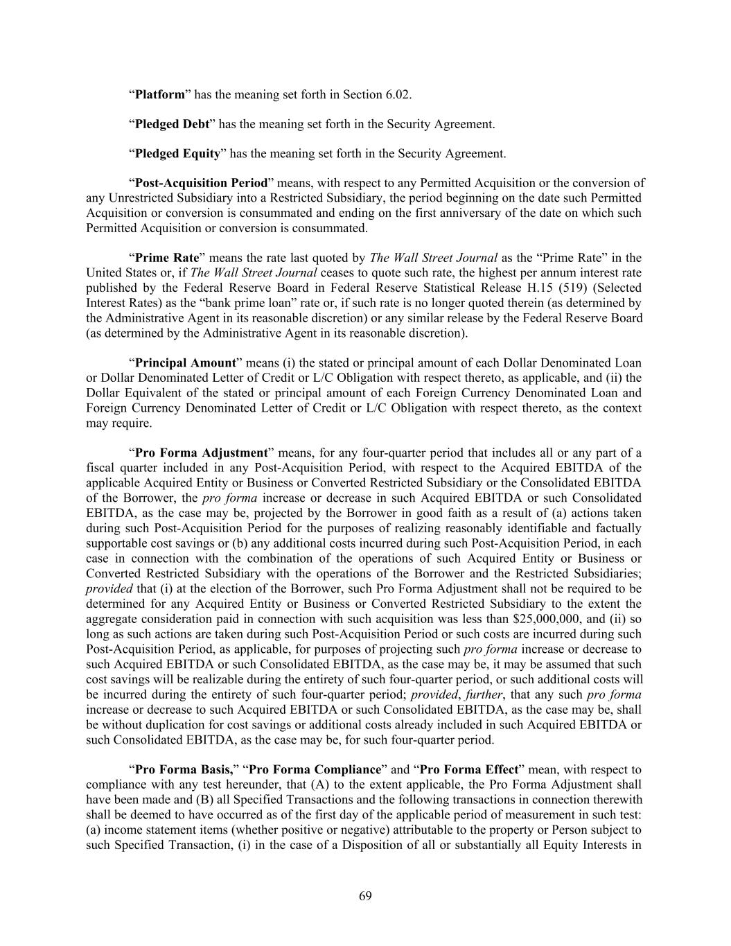 “Platform” has the meaning set forth in Section 6.02.“Pledged Debt” has the meaning set forth in the Security Agreement.“Pledged Equity” has the meaning set forth in the Security Agreement.“Post-Acquisition Period” means, with respect to any Permitted Acquisition or the conversion ofany Unrestricted Subsidiary into a Restricted Subsidiary, the period beginning on the date such PermittedAcquisition or conversion is consummated and ending on the first anniversary of the date on which suchPermitted Acquisition or conversion is consummated.“Prime Rate” means the rate last quoted by The Wall Street Journal as the “Prime Rate” in theUnited States or, if The Wall Street Journal ceases to quote such rate, the highest per annum interest ratepublished by the Federal Reserve Board in Federal Reserve Statistical Release H.15 (519) (SelectedInterest Rates) as the “bank prime loan” rate or, if such rate is no longer quoted therein (as determined bythe Administrative Agent in its reasonable discretion) or any similar release by the Federal Reserve Board(as determined by the Administrative Agent in its reasonable discretion).“Principal Amount” means (i) the stated or principal amount of each Dollar Denominated Loanor Dollar Denominated Letter of Credit or L/C Obligation with respect thereto, as applicable, and (ii) theDollar Equivalent of the stated or principal amount of each Foreign Currency Denominated Loan andForeign Currency Denominated Letter of Credit or L/C Obligation with respect thereto, as the contextmay require.“Pro Forma Adjustment” means, for any four-quarter period that includes all or any part of afiscal quarter included in any Post-Acquisition Period, with respect to the Acquired EBITDA of theapplicable Acquired Entity or Business or Converted Restricted Subsidiary or the Consolidated EBITDAof the Borrower, the pro forma increase or decrease in such Acquired EBITDA or such ConsolidatedEBITDA, as the case may be, projected by the Borrower in good faith as a result of (a) actions takenduring such Post-Acquisition Period for the purposes of realizing reasonably identifiable and factuallysupportable cost savings or (b) any additional costs incurred during such Post-Acquisition Period, in eachcase in connection with the combination of the operations of such Acquired Entity or Business orConverted Restricted Subsidiary with the operations of the Borrower and the Restricted Subsidiaries;provided that (i) at the election of the Borrower, such Pro Forma Adjustment shall not be required to bedetermined for any Acquired Entity or Business or Converted Restricted Subsidiary to the extent theaggregate consideration paid in connection with such acquisition was less than $25,000,000, and (ii) solong as such actions are taken during such Post-Acquisition Period or such costs are incurred during suchPost-Acquisition Period, as applicable, for purposes of projecting such pro forma increase or decrease tosuch Acquired EBITDA or such Consolidated EBITDA, as the case may be, it may be assumed that suchcost savings will be realizable during the entirety of such four-quarter period, or such additional costs willbe incurred during the entirety of such four-quarter period; provided, further, that any such pro formaincrease or decrease to such Acquired EBITDA or such Consolidated EBITDA, as the case may be, shallbe without duplication for cost savings or additional costs already included in such Acquired EBITDA orsuch Consolidated EBITDA, as the case may be, for such four-quarter period.“Pro Forma Basis,” “Pro Forma Compliance” and “Pro Forma Effect” mean, with respect tocompliance with any test hereunder, that (A) to the extent applicable, the Pro Forma Adjustment shallhave been made and (B) all Specified Transactions and the following transactions in connection therewithshall be deemed to have occurred as of the first day of the applicable period of measurement in such test:(a) income statement items (whether positive or negative) attributable to the property or Person subject tosuch Specified Transaction, (i) in the case of a Disposition of all or substantially all Equity Interests in69