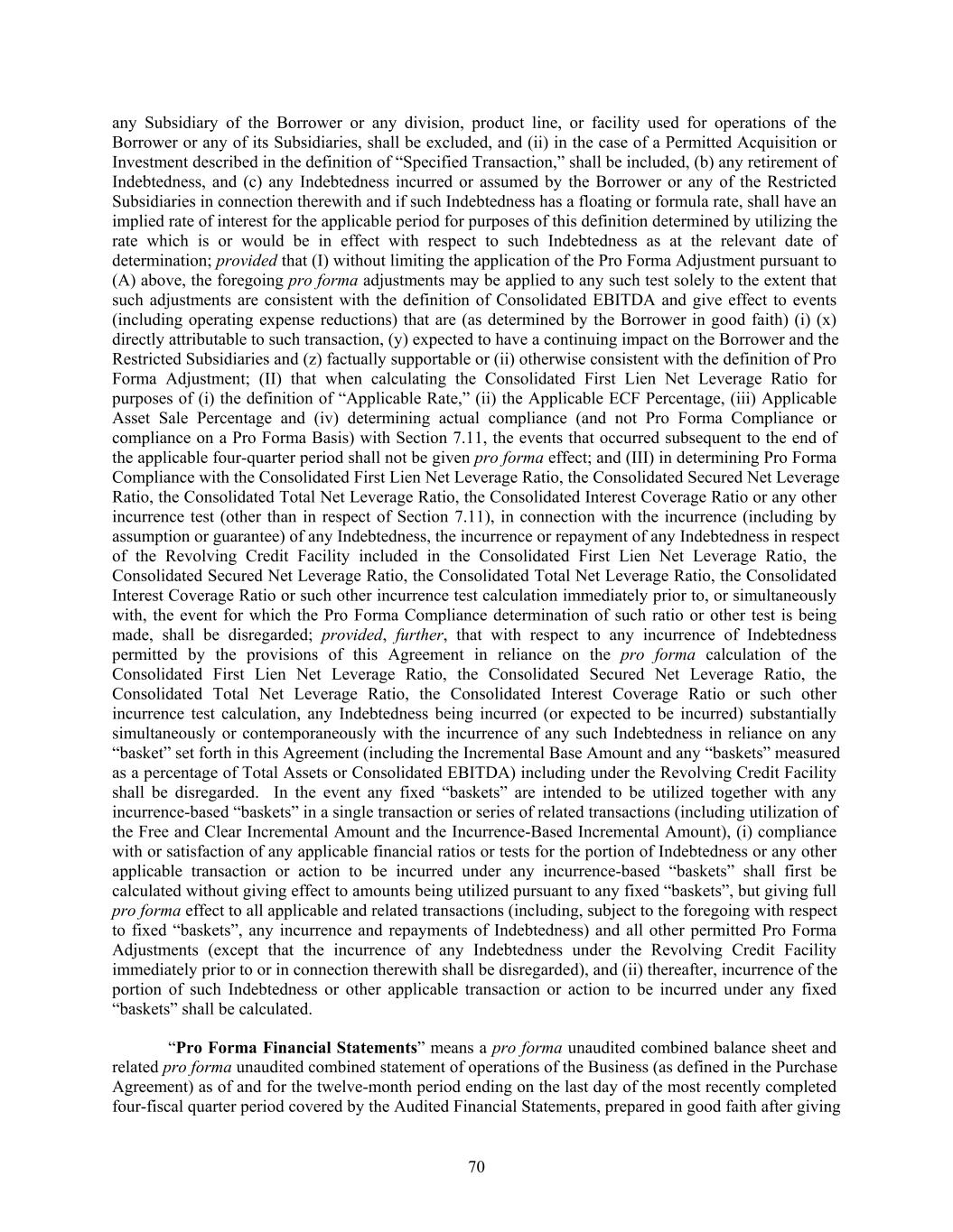 any Subsidiary of the Borrower or any division, product line, or facility used for operations of theBorrower or any of its Subsidiaries, shall be excluded, and (ii) in the case of a Permitted Acquisition orInvestment described in the definition of “Specified Transaction,” shall be included, (b) any retirement ofIndebtedness, and (c) any Indebtedness incurred or assumed by the Borrower or any of the RestrictedSubsidiaries in connection therewith and if such Indebtedness has a floating or formula rate, shall have animplied rate of interest for the applicable period for purposes of this definition determined by utilizing therate which is or would be in effect with respect to such Indebtedness as at the relevant date ofdetermination; provided that (I) without limiting the application of the Pro Forma Adjustment pursuant to(A) above, the foregoing pro forma adjustments may be applied to any such test solely to the extent thatsuch adjustments are consistent with the definition of Consolidated EBITDA and give effect to events(including operating expense reductions) that are (as determined by the Borrower in good faith) (i) (x)directly attributable to such transaction, (y) expected to have a continuing impact on the Borrower and theRestricted Subsidiaries and (z) factually supportable or (ii) otherwise consistent with the definition of ProForma Adjustment; (II) that when calculating the Consolidated First Lien Net Leverage Ratio forpurposes of (i) the definition of “Applicable Rate,” (ii) the Applicable ECF Percentage, (iii) ApplicableAsset Sale Percentage and (iv) determining actual compliance (and not Pro Forma Compliance orcompliance on a Pro Forma Basis) with Section 7.11, the events that occurred subsequent to the end ofthe applicable four-quarter period shall not be given pro forma effect; and (III) in determining Pro FormaCompliance with the Consolidated First Lien Net Leverage Ratio, the Consolidated Secured Net LeverageRatio, the Consolidated Total Net Leverage Ratio, the Consolidated Interest Coverage Ratio or any otherincurrence test (other than in respect of Section 7.11), in connection with the incurrence (including byassumption or guarantee) of any Indebtedness, the incurrence or repayment of any Indebtedness in respectof the Revolving Credit Facility included in the Consolidated First Lien Net Leverage Ratio, theConsolidated Secured Net Leverage Ratio, the Consolidated Total Net Leverage Ratio, the ConsolidatedInterest Coverage Ratio or such other incurrence test calculation immediately prior to, or simultaneouslywith, the event for which the Pro Forma Compliance determination of such ratio or other test is beingmade, shall be disregarded; provided, further, that with respect to any incurrence of Indebtednesspermitted by the provisions of this Agreement in reliance on the pro forma calculation of theConsolidated First Lien Net Leverage Ratio, the Consolidated Secured Net Leverage Ratio, theConsolidated Total Net Leverage Ratio, the Consolidated Interest Coverage Ratio or such otherincurrence test calculation, any Indebtedness being incurred (or expected to be incurred) substantiallysimultaneously or contemporaneously with the incurrence of any such Indebtedness in reliance on any“basket” set forth in this Agreement (including the Incremental Base Amount and any “baskets” measuredas a percentage of Total Assets or Consolidated EBITDA) including under the Revolving Credit Facilityshall be disregarded. In the event any fixed “baskets” are intended to be utilized together with anyincurrence-based “baskets” in a single transaction or series of related transactions (including utilization ofthe Free and Clear Incremental Amount and the Incurrence-Based Incremental Amount), (i) compliancewith or satisfaction of any applicable financial ratios or tests for the portion of Indebtedness or any otherapplicable transaction or action to be incurred under any incurrence-based “baskets” shall first becalculated without giving effect to amounts being utilized pursuant to any fixed “baskets”, but giving fullpro forma effect to all applicable and related transactions (including, subject to the foregoing with respectto fixed “baskets”, any incurrence and repayments of Indebtedness) and all other permitted Pro FormaAdjustments (except that the incurrence of any Indebtedness under the Revolving Credit Facilityimmediately prior to or in connection therewith shall be disregarded), and (ii) thereafter, incurrence of theportion of such Indebtedness or other applicable transaction or action to be incurred under any fixed“baskets” shall be calculated.“Pro Forma Financial Statements” means a pro forma unaudited combined balance sheet andrelated pro forma unaudited combined statement of operations of the Business (as defined in the PurchaseAgreement) as of and for the twelve-month period ending on the last day of the most recently completedfour-fiscal quarter period covered by the Audited Financial Statements, prepared in good faith after giving70