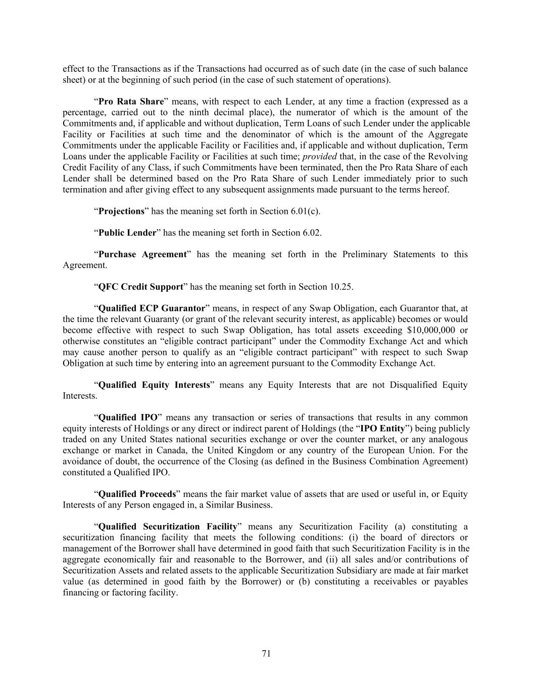 effect to the Transactions as if the Transactions had occurred as of such date (in the case of such balancesheet) or at the beginning of such period (in the case of such statement of operations).“Pro Rata Share” means, with respect to each Lender, at any time a fraction (expressed as apercentage, carried out to the ninth decimal place), the numerator of which is the amount of theCommitments and, if applicable and without duplication, Term Loans of such Lender under the applicableFacility or Facilities at such time and the denominator of which is the amount of the AggregateCommitments under the applicable Facility or Facilities and, if applicable and without duplication, TermLoans under the applicable Facility or Facilities at such time; provided that, in the case of the RevolvingCredit Facility of any Class, if such Commitments have been terminated, then the Pro Rata Share of eachLender shall be determined based on the Pro Rata Share of such Lender immediately prior to suchtermination and after giving effect to any subsequent assignments made pursuant to the terms hereof.“Projections” has the meaning set forth in Section 6.01(c).“Public Lender” has the meaning set forth in Section 6.02.“Purchase Agreement” has the meaning set forth in the Preliminary Statements to thisAgreement.“QFC Credit Support” has the meaning set forth in Section 10.25.“Qualified ECP Guarantor” means, in respect of any Swap Obligation, each Guarantor that, atthe time the relevant Guaranty (or grant of the relevant security interest, as applicable) becomes or wouldbecome effective with respect to such Swap Obligation, has total assets exceeding $10,000,000 orotherwise constitutes an “eligible contract participant” under the Commodity Exchange Act and whichmay cause another person to qualify as an “eligible contract participant” with respect to such SwapObligation at such time by entering into an agreement pursuant to the Commodity Exchange Act.“Qualified Equity Interests” means any Equity Interests that are not Disqualified EquityInterests.“Qualified IPO” means any transaction or series of transactions that results in any commonequity interests of Holdings or any direct or indirect parent of Holdings (the “IPO Entity”) being publiclytraded on any United States national securities exchange or over the counter market, or any analogousexchange or market in Canada, the United Kingdom or any country of the European Union. For theavoidance of doubt, the occurrence of the Closing (as defined in the Business Combination Agreement)constituted a Qualified IPO.“Qualified Proceeds” means the fair market value of assets that are used or useful in, or EquityInterests of any Person engaged in, a Similar Business.“Qualified Securitization Facility” means any Securitization Facility (a) constituting asecuritization financing facility that meets the following conditions: (i) the board of directors ormanagement of the Borrower shall have determined in good faith that such Securitization Facility is in theaggregate economically fair and reasonable to the Borrower, and (ii) all sales and/or contributions ofSecuritization Assets and related assets to the applicable Securitization Subsidiary are made at fair marketvalue (as determined in good faith by the Borrower) or (b) constituting a receivables or payablesfinancing or factoring facility. 71