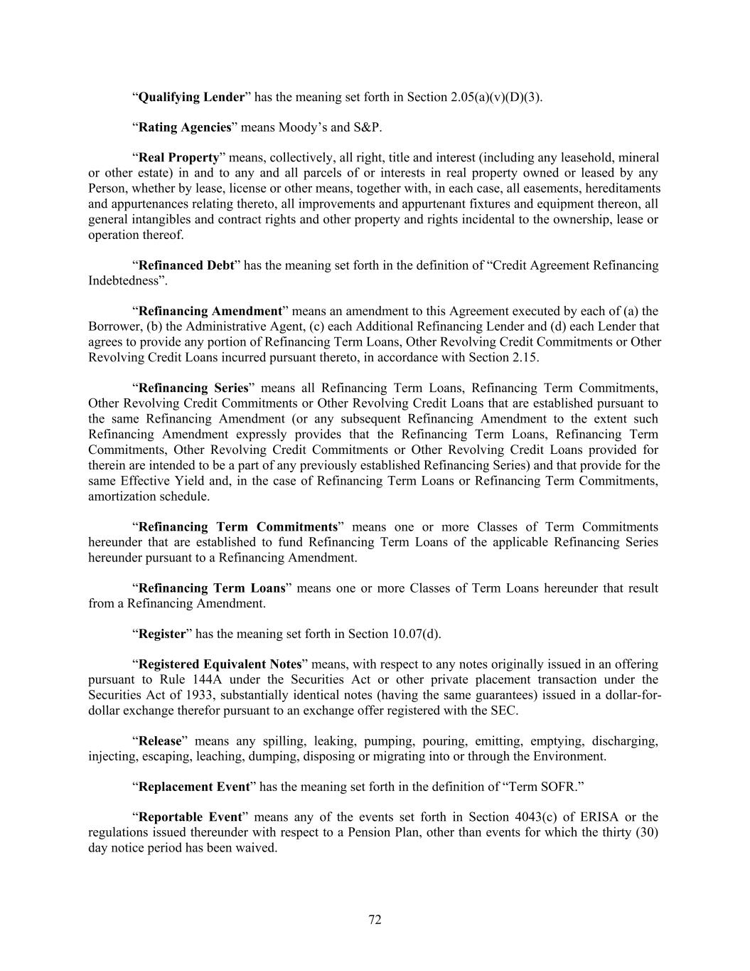 “Qualifying Lender” has the meaning set forth in Section 2.05(a)(v)(D)(3).“Rating Agencies” means Moody’s and S&P.“Real Property” means, collectively, all right, title and interest (including any leasehold, mineralor other estate) in and to any and all parcels of or interests in real property owned or leased by anyPerson, whether by lease, license or other means, together with, in each case, all easements, hereditamentsand appurtenances relating thereto, all improvements and appurtenant fixtures and equipment thereon, allgeneral intangibles and contract rights and other property and rights incidental to the ownership, lease oroperation thereof.“Refinanced Debt” has the meaning set forth in the definition of “Credit Agreement RefinancingIndebtedness”.“Refinancing Amendment” means an amendment to this Agreement executed by each of (a) theBorrower, (b) the Administrative Agent, (c) each Additional Refinancing Lender and (d) each Lender thatagrees to provide any portion of Refinancing Term Loans, Other Revolving Credit Commitments or OtherRevolving Credit Loans incurred pursuant thereto, in accordance with Section 2.15.“Refinancing Series” means all Refinancing Term Loans, Refinancing Term Commitments,Other Revolving Credit Commitments or Other Revolving Credit Loans that are established pursuant tothe same Refinancing Amendment (or any subsequent Refinancing Amendment to the extent suchRefinancing Amendment expressly provides that the Refinancing Term Loans, Refinancing TermCommitments, Other Revolving Credit Commitments or Other Revolving Credit Loans provided fortherein are intended to be a part of any previously established Refinancing Series) and that provide for thesame Effective Yield and, in the case of Refinancing Term Loans or Refinancing Term Commitments,amortization schedule.“Refinancing Term Commitments” means one or more Classes of Term Commitmentshereunder that are established to fund Refinancing Term Loans of the applicable Refinancing Serieshereunder pursuant to a Refinancing Amendment.“Refinancing Term Loans” means one or more Classes of Term Loans hereunder that resultfrom a Refinancing Amendment.“Register” has the meaning set forth in Section 10.07(d).“Registered Equivalent Notes” means, with respect to any notes originally issued in an offeringpursuant to Rule 144A under the Securities Act or other private placement transaction under theSecurities Act of 1933, substantially identical notes (having the same guarantees) issued in a dollar-for-dollar exchange therefor pursuant to an exchange offer registered with the SEC.“Release” means any spilling, leaking, pumping, pouring, emitting, emptying, discharging,injecting, escaping, leaching, dumping, disposing or migrating into or through the Environment.“Replacement Event” has the meaning set forth in the definition of “Term SOFR.”“Reportable Event” means any of the events set forth in Section 4043(c) of ERISA or theregulations issued thereunder with respect to a Pension Plan, other than events for which the thirty (30)day notice period has been waived. 72