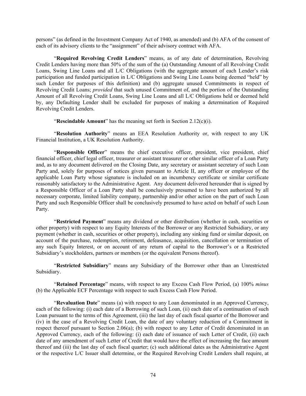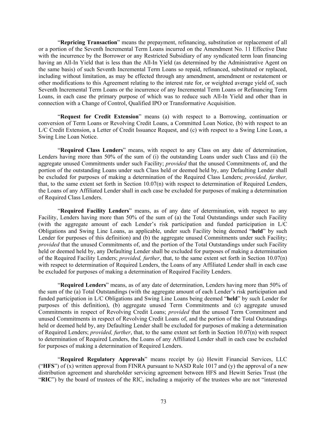 “Repricing Transaction” means the prepayment, refinancing, substitution or replacement of allor a portion of the Seventh Incremental Term Loans incurred on the Amendment No. 11 Effective Datewith the incurrence by the Borrower or any Restricted Subsidiary of any syndicated term loan financinghaving an All-In Yield that is less than the All-In Yield (as determined by the Administrative Agent onthe same basis) of such Seventh Incremental Term Loans so repaid, refinanced, substituted or replaced,including without limitation, as may be effected through any amendment, amendment or restatement orother modifications to this Agreement relating to the interest rate for, or weighted average yield of, suchSeventh Incremental Term Loans or the incurrence of any Incremental Term Loans or Refinancing TermLoans, in each case the primary purpose of which was to reduce such All-In Yield and other than inconnection with a Change of Control, Qualified IPO or Transformative Acquisition.“Request for Credit Extension” means (a) with respect to a Borrowing, continuation orconversion of Term Loans or Revolving Credit Loans, a Committed Loan Notice, (b) with respect to anL/C Credit Extension, a Letter of Credit Issuance Request, and (c) with respect to a Swing Line Loan, aSwing Line Loan Notice.“Required Class Lenders” means, with respect to any Class on any date of determination,Lenders having more than 50% of the sum of (i) the outstanding Loans under such Class and (ii) theaggregate unused Commitments under such Facility; provided that the unused Commitments of, and theportion of the outstanding Loans under such Class held or deemed held by, any Defaulting Lender shallbe excluded for purposes of making a determination of the Required Class Lenders; provided, further,that, to the same extent set forth in Section 10.07(n) with respect to determination of Required Lenders,the Loans of any Affiliated Lender shall in each case be excluded for purposes of making a determinationof Required Class Lenders.“Required Facility Lenders” means, as of any date of determination, with respect to anyFacility, Lenders having more than 50% of the sum of (a) the Total Outstandings under such Facility(with the aggregate amount of each Lender’s risk participation and funded participation in L/CObligations and Swing Line Loans, as applicable, under such Facility being deemed “held” by suchLender for purposes of this definition) and (b) the aggregate unused Commitments under such Facility;provided that the unused Commitments of, and the portion of the Total Outstandings under such Facilityheld or deemed held by, any Defaulting Lender shall be excluded for purposes of making a determinationof the Required Facility Lenders; provided, further, that, to the same extent set forth in Section 10.07(n)with respect to determination of Required Lenders, the Loans of any Affiliated Lender shall in each casebe excluded for purposes of making a determination of Required Facility Lenders.“Required Lenders” means, as of any date of determination, Lenders having more than 50% ofthe sum of the (a) Total Outstandings (with the aggregate amount of each Lender’s risk participation andfunded participation in L/C Obligations and Swing Line Loans being deemed “held” by such Lender forpurposes of this definition), (b) aggregate unused Term Commitments and (c) aggregate unusedCommitments in respect of Revolving Credit Loans; provided that the unused Term Commitment andunused Commitments in respect of Revolving Credit Loans of, and the portion of the Total Outstandingsheld or deemed held by, any Defaulting Lender shall be excluded for purposes of making a determinationof Required Lenders; provided, further, that, to the same extent set forth in Section 10.07(n) with respectto determination of Required Lenders, the Loans of any Affiliated Lender shall in each case be excludedfor purposes of making a determination of Required Lenders.“Required Regulatory Approvals” means receipt by (a) Hewitt Financial Services, LLC(“HFS”) of (x) written approval from FINRA pursuant to NASD Rule 1017 and (y) the approval of a newdistribution agreement and shareholder servicing agreement between HFS and Hewitt Series Trust (the“RIC”) by the board of trustees of the RIC, including a majority of the trustees who are not “interested73