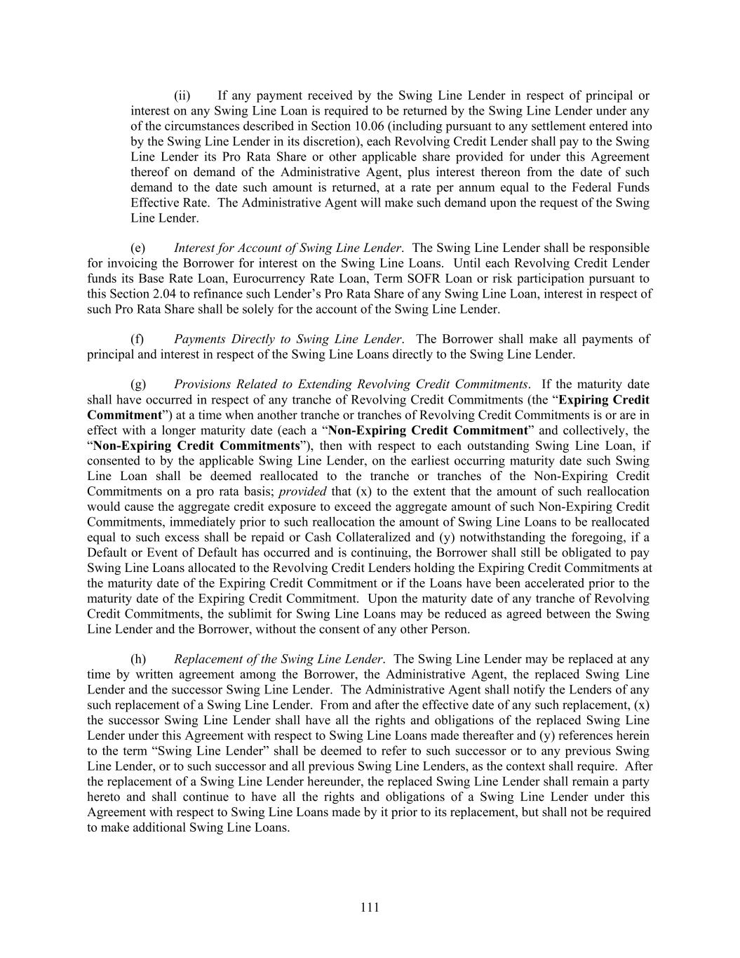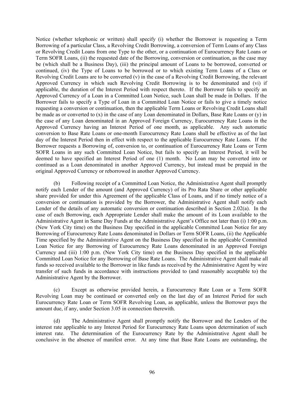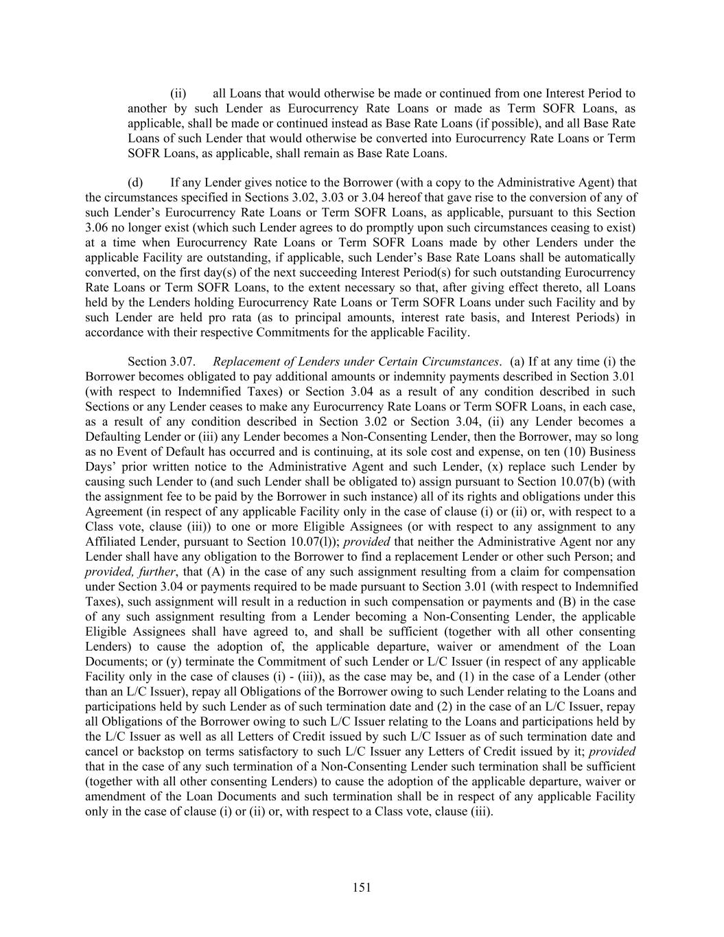 (ii) all Loans that would otherwise be made or continued from one Interest Period toanother by such Lender as Eurocurrency Rate Loans or made as Term SOFR Loans, asapplicable, shall be made or continued instead as Base Rate Loans (if possible), and all Base RateLoans of such Lender that would otherwise be converted into Eurocurrency Rate Loans or TermSOFR Loans, as applicable, shall remain as Base Rate Loans.(d) If any Lender gives notice to the Borrower (with a copy to the Administrative Agent) thatthe circumstances specified in Sections 3.02, 3.03 or 3.04 hereof that gave rise to the conversion of any ofsuch Lender’s Eurocurrency Rate Loans or Term SOFR Loans, as applicable, pursuant to this Section3.06 no longer exist (which such Lender agrees to do promptly upon such circumstances ceasing to exist)at a time when Eurocurrency Rate Loans or Term SOFR Loans made by other Lenders under theapplicable Facility are outstanding, if applicable, such Lender’s Base Rate Loans shall be automaticallyconverted, on the first day(s) of the next succeeding Interest Period(s) for such outstanding EurocurrencyRate Loans or Term SOFR Loans, to the extent necessary so that, after giving effect thereto, all Loansheld by the Lenders holding Eurocurrency Rate Loans or Term SOFR Loans under such Facility and bysuch Lender are held pro rata (as to principal amounts, interest rate basis, and Interest Periods) inaccordance with their respective Commitments for the applicable Facility.Section 3.07. Replacement of Lenders under Certain Circumstances. (a) If at any time (i) theBorrower becomes obligated to pay additional amounts or indemnity payments described in Section 3.01(with respect to Indemnified Taxes) or Section 3.04 as a result of any condition described in suchSections or any Lender ceases to make any Eurocurrency Rate Loans or Term SOFR Loans, in each case,as a result of any condition described in Section 3.02 or Section 3.04, (ii) any Lender becomes aDefaulting Lender or (iii) any Lender becomes a Non-Consenting Lender, then the Borrower, may so longas no Event of Default has occurred and is continuing, at its sole cost and expense, on ten (10) BusinessDays’ prior written notice to the Administrative Agent and such Lender, (x) replace such Lender bycausing such Lender to (and such Lender shall be obligated to) assign pursuant to Section 10.07(b) (withthe assignment fee to be paid by the Borrower in such instance) all of its rights and obligations under thisAgreement (in respect of any applicable Facility only in the case of clause (i) or (ii) or, with respect to aClass vote, clause (iii)) to one or more Eligible Assignees (or with respect to any assignment to anyAffiliated Lender, pursuant to Section 10.07(l)); provided that neither the Administrative Agent nor anyLender shall have any obligation to the Borrower to find a replacement Lender or other such Person; andprovided, further, that (A) in the case of any such assignment resulting from a claim for compensationunder Section 3.04 or payments required to be made pursuant to Section 3.01 (with respect to IndemnifiedTaxes), such assignment will result in a reduction in such compensation or payments and (B) in the caseof any such assignment resulting from a Lender becoming a Non-Consenting Lender, the applicableEligible Assignees shall have agreed to, and shall be sufficient (together with all other consentingLenders) to cause the adoption of, the applicable departure, waiver or amendment of the LoanDocuments; or (y) terminate the Commitment of such Lender or L/C Issuer (in respect of any applicableFacility only in the case of clauses (i) - (iii)), as the case may be, and (1) in the case of a Lender (otherthan an L/C Issuer), repay all Obligations of the Borrower owing to such Lender relating to the Loans andparticipations held by such Lender as of such termination date and (2) in the case of an L/C Issuer, repayall Obligations of the Borrower owing to such L/C Issuer relating to the Loans and participations held bythe L/C Issuer as well as all Letters of Credit issued by such L/C Issuer as of such termination date andcancel or backstop on terms satisfactory to such L/C Issuer any Letters of Credit issued by it; providedthat in the case of any such termination of a Non-Consenting Lender such termination shall be sufficient(together with all other consenting Lenders) to cause the adoption of the applicable departure, waiver oramendment of the Loan Documents and such termination shall be in respect of any applicable Facilityonly in the case of clause (i) or (ii) or, with respect to a Class vote, clause (iii).151