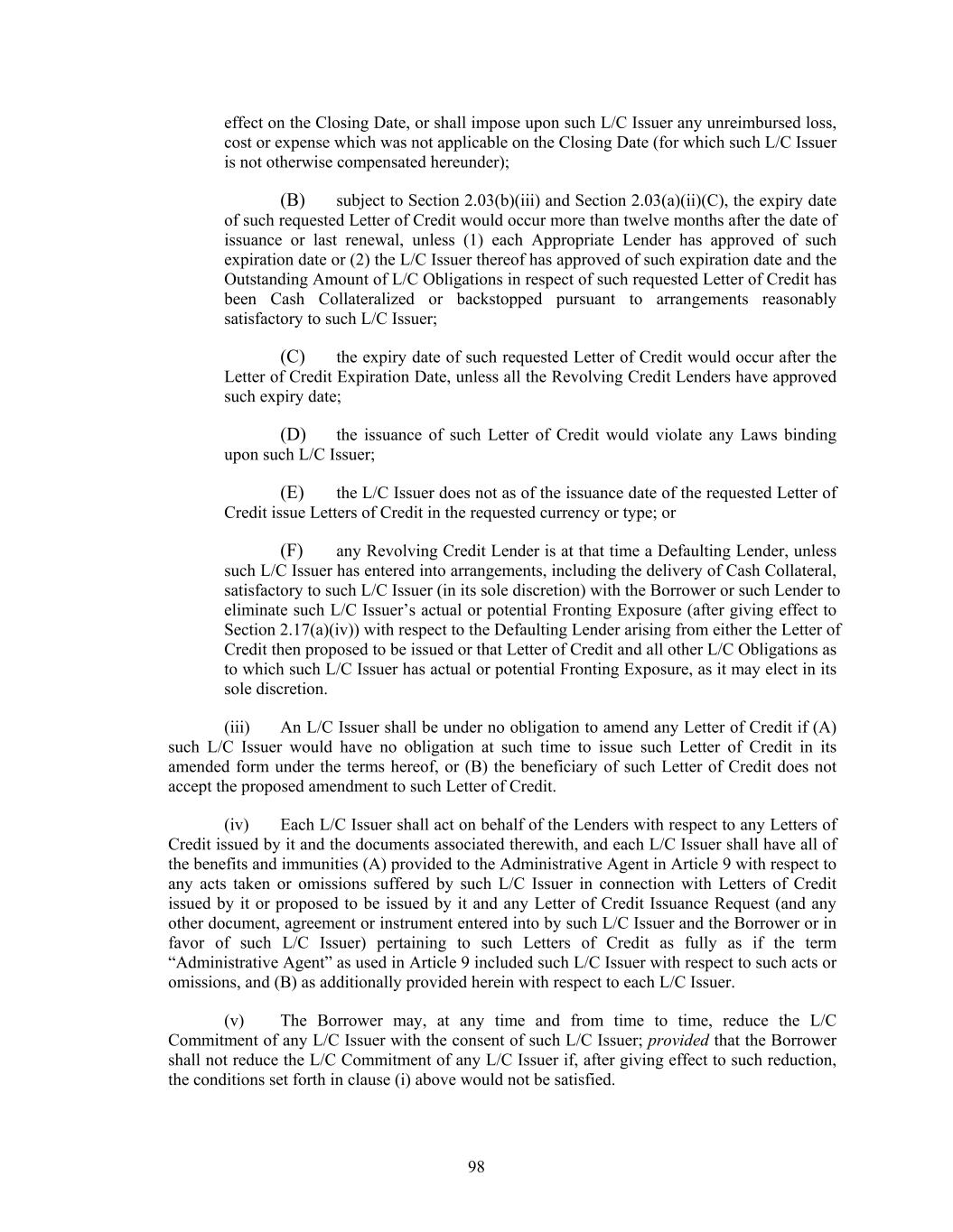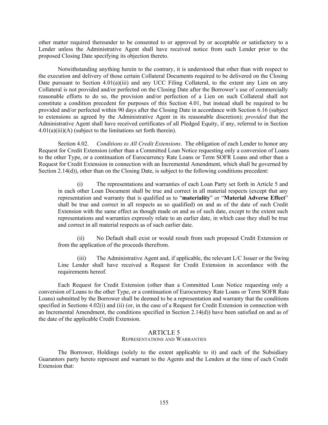 other matter required thereunder to be consented to or approved by or acceptable or satisfactory to aLender unless the Administrative Agent shall have received notice from such Lender prior to theproposed Closing Date specifying its objection thereto.Notwithstanding anything herein to the contrary, it is understood that other than with respect tothe execution and delivery of those certain Collateral Documents required to be delivered on the ClosingDate pursuant to Section 4.01(a)(iii) and any UCC Filing Collateral, to the extent any Lien on anyCollateral is not provided and/or perfected on the Closing Date after the Borrower’s use of commerciallyreasonable efforts to do so, the provision and/or perfection of a Lien on such Collateral shall notconstitute a condition precedent for purposes of this Section 4.01, but instead shall be required to beprovided and/or perfected within 90 days after the Closing Date in accordance with Section 6.16 (subjectto extensions as agreed by the Administrative Agent in its reasonable discretion); provided that theAdministrative Agent shall have received certificates of all Pledged Equity, if any, referred to in Section4.01(a)(iii)(A) (subject to the limitations set forth therein).Section 4.02. Conditions to All Credit Extensions. The obligation of each Lender to honor anyRequest for Credit Extension (other than a Committed Loan Notice requesting only a conversion of Loansto the other Type, or a continuation of Eurocurrency Rate Loans or Term SOFR Loans and other than aRequest for Credit Extension in connection with an Incremental Amendment, which shall be governed by Section 2.14(d)), other than on the Closing Date, is subject to the following conditions precedent:(i) The representations and warranties of each Loan Party set forth in Article 5 andin each other Loan Document shall be true and correct in all material respects (except that anyrepresentation and warranty that is qualified as to “materiality” or “Material Adverse Effect”shall be true and correct in all respects as so qualified) on and as of the date of such CreditExtension with the same effect as though made on and as of such date, except to the extent suchrepresentations and warranties expressly relate to an earlier date, in which case they shall be trueand correct in all material respects as of such earlier date.(ii) No Default shall exist or would result from such proposed Credit Extension orfrom the application of the proceeds therefrom.(iii) The Administrative Agent and, if applicable, the relevant L/C Issuer or the SwingLine Lender shall have received a Request for Credit Extension in accordance with therequirements hereof.Each Request for Credit Extension (other than a Committed Loan Notice requesting only aconversion of Loans to the other Type, or a continuation of Eurocurrency Rate Loans or Term SOFR RateLoans) submitted by the Borrower shall be deemed to be a representation and warranty that the conditionsspecified in Sections 4.02(i) and (ii) (or, in the case of a Request for Credit Extension in connection withan Incremental Amendment, the conditions specified in Section 2.14(d)) have been satisfied on and as ofthe date of the applicable Credit Extension. ARTICLE 5REPRESENTATIONS AND WARRANTIESThe Borrower, Holdings (solely to the extent applicable to it) and each of the SubsidiaryGuarantors party hereto represent and warrant to the Agents and the Lenders at the time of each CreditExtension that: 155